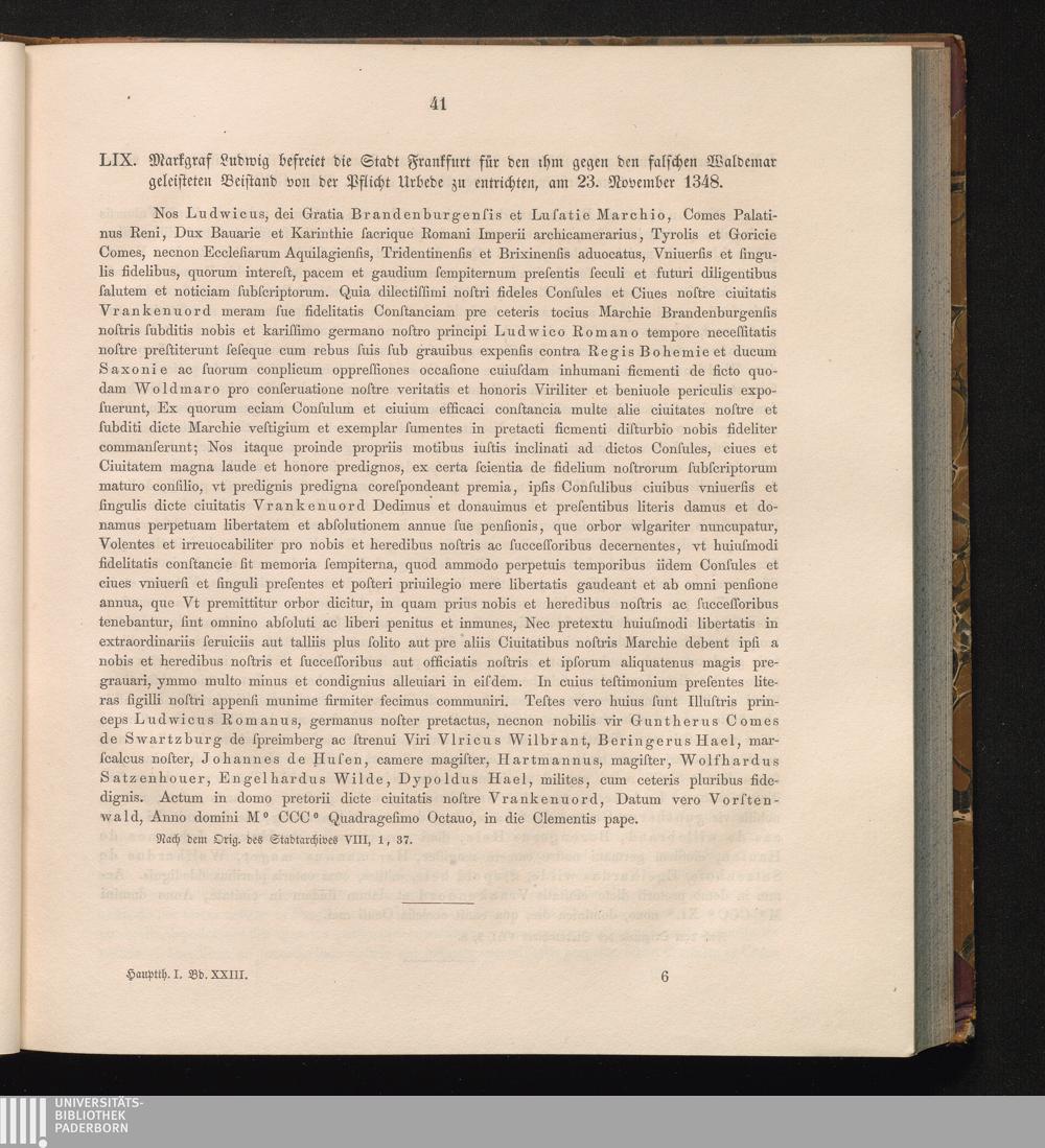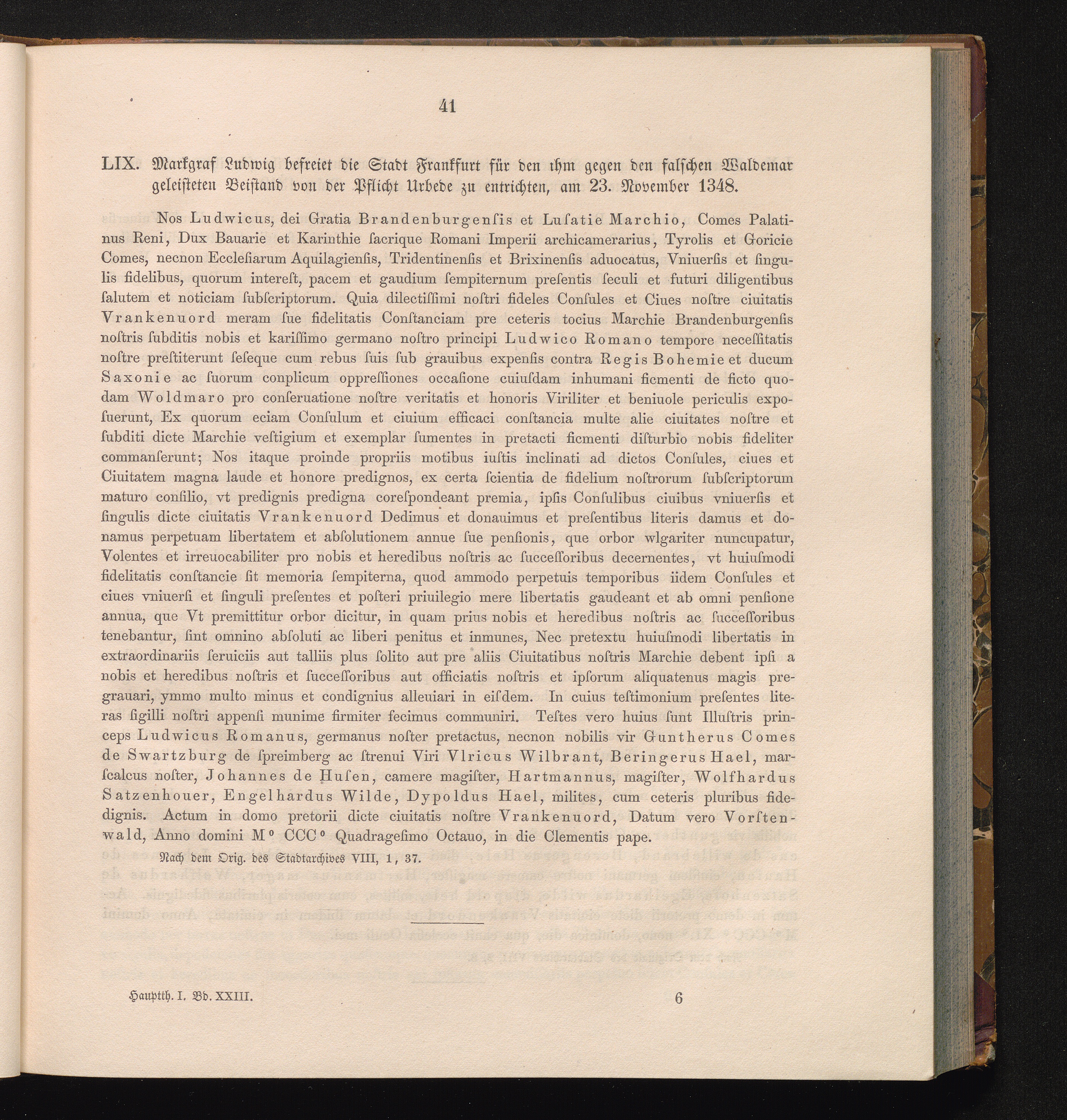 LIX. Markgraf Ludwig befreiet die Stadt Frankfurt für den ihm gegen den falschen[...]