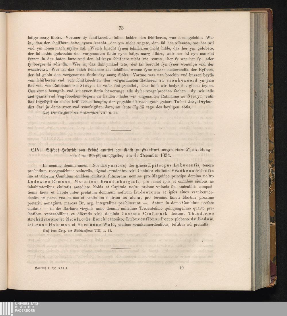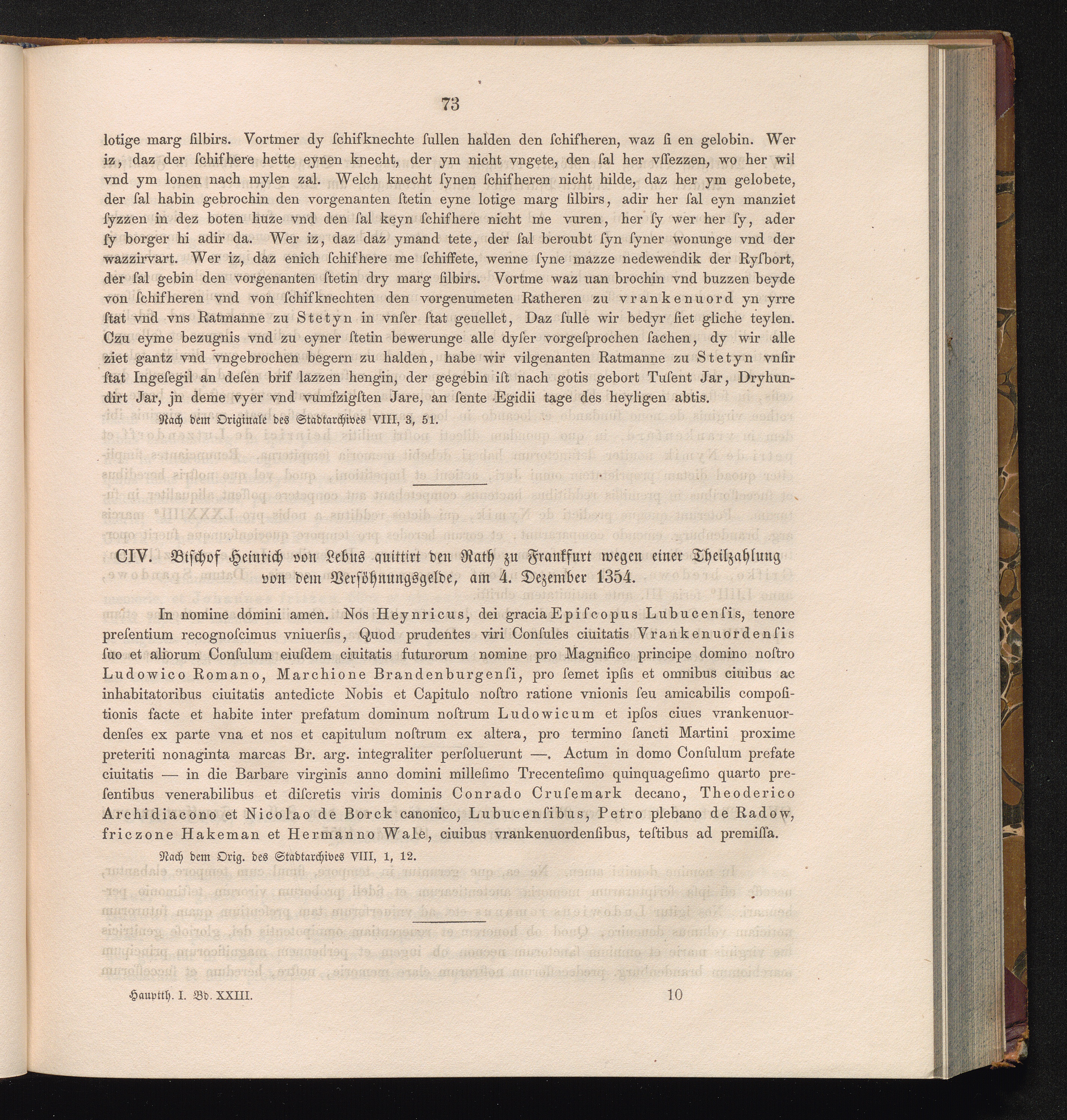 CIV. Bischof Heinrich von Lebus quittirt den Rath zu Frankfurt wegen einer Theilzahluing[...]