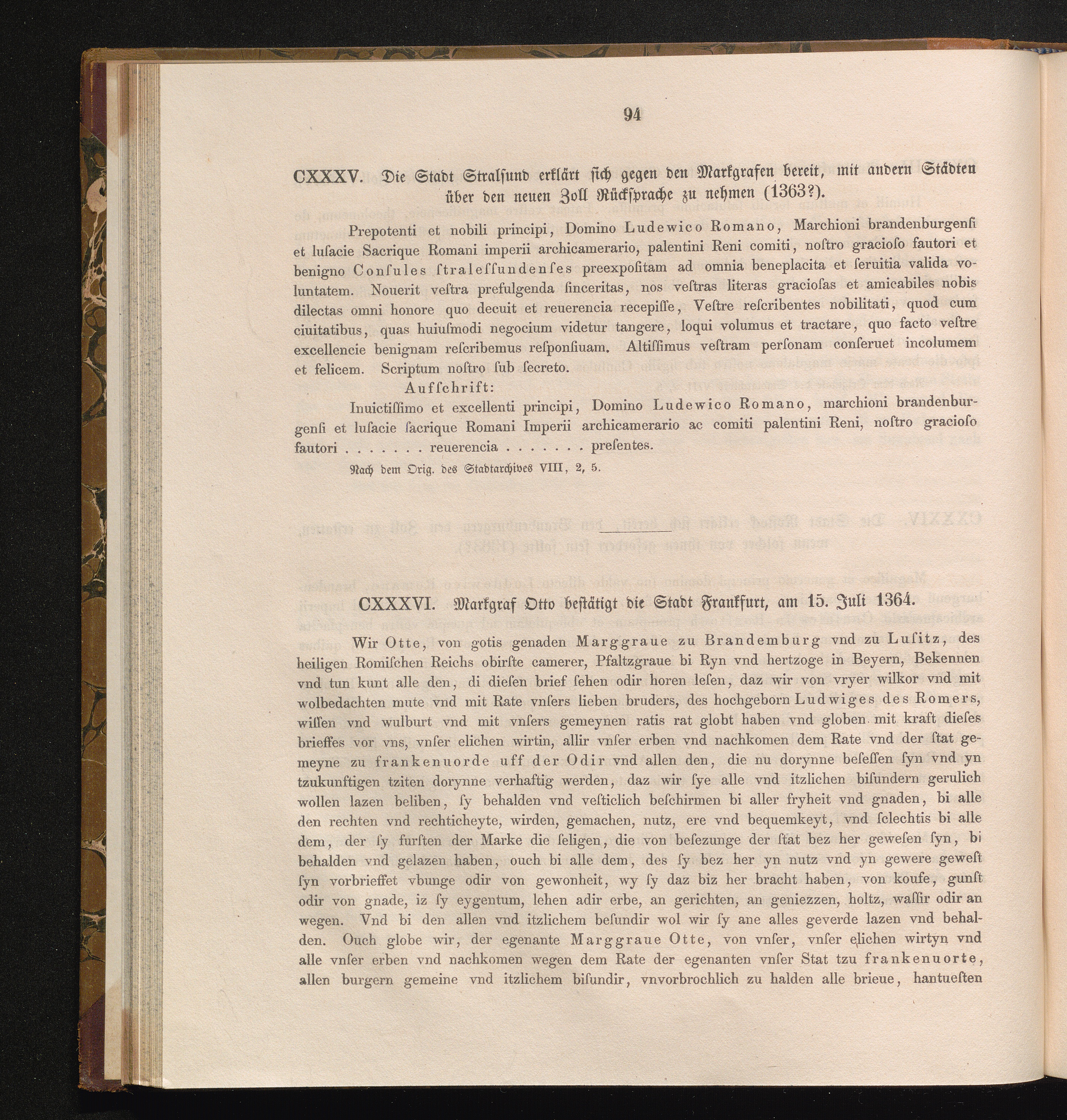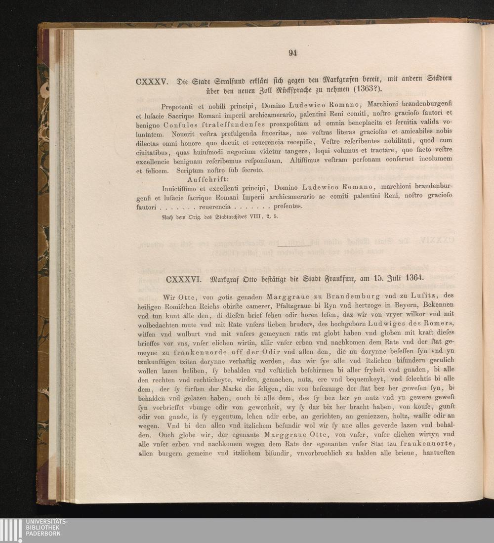 CXXXVI. Markgraf Otto bestätigt die Stadt Frankfurt, am 15. Juli 1364.