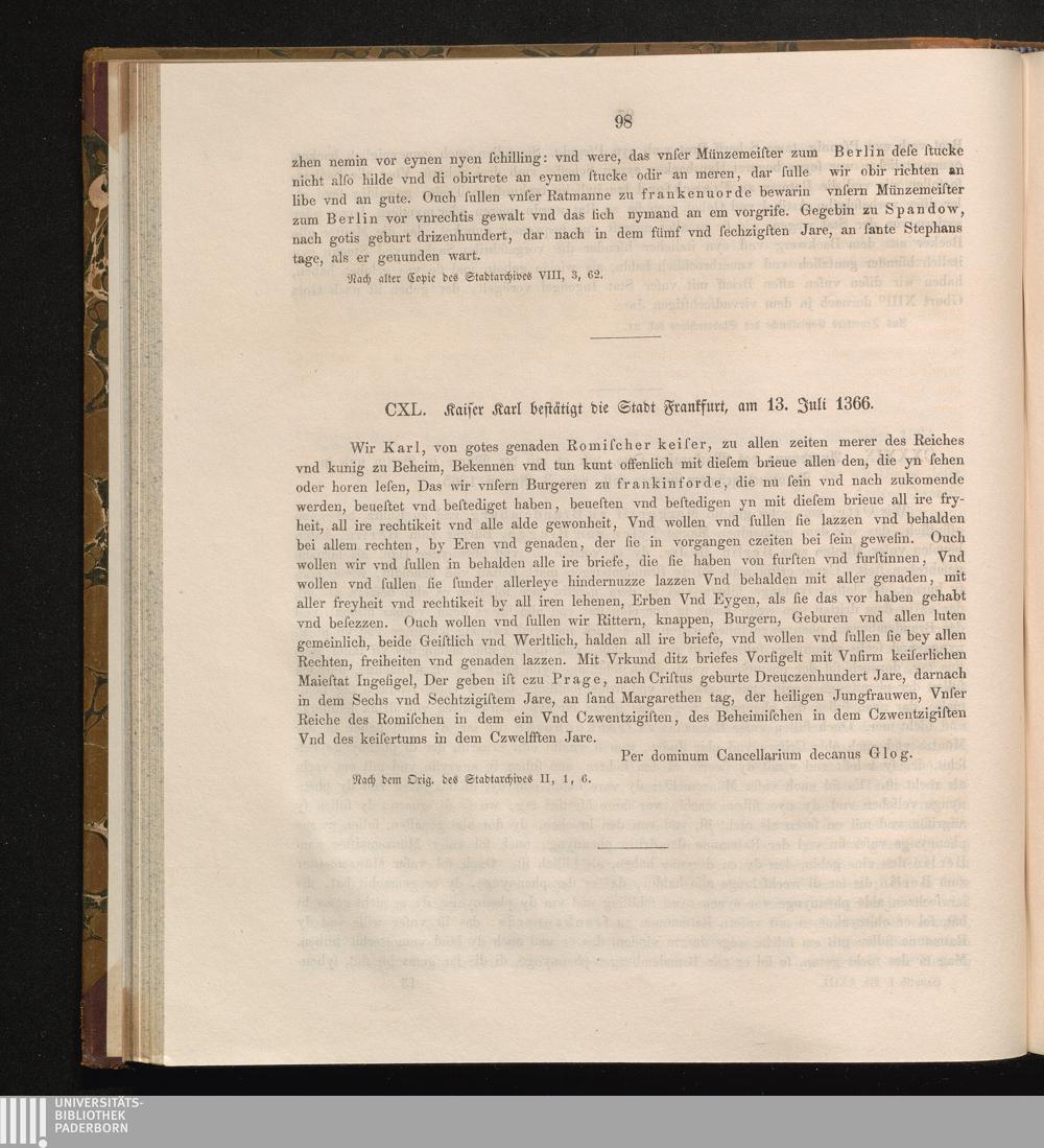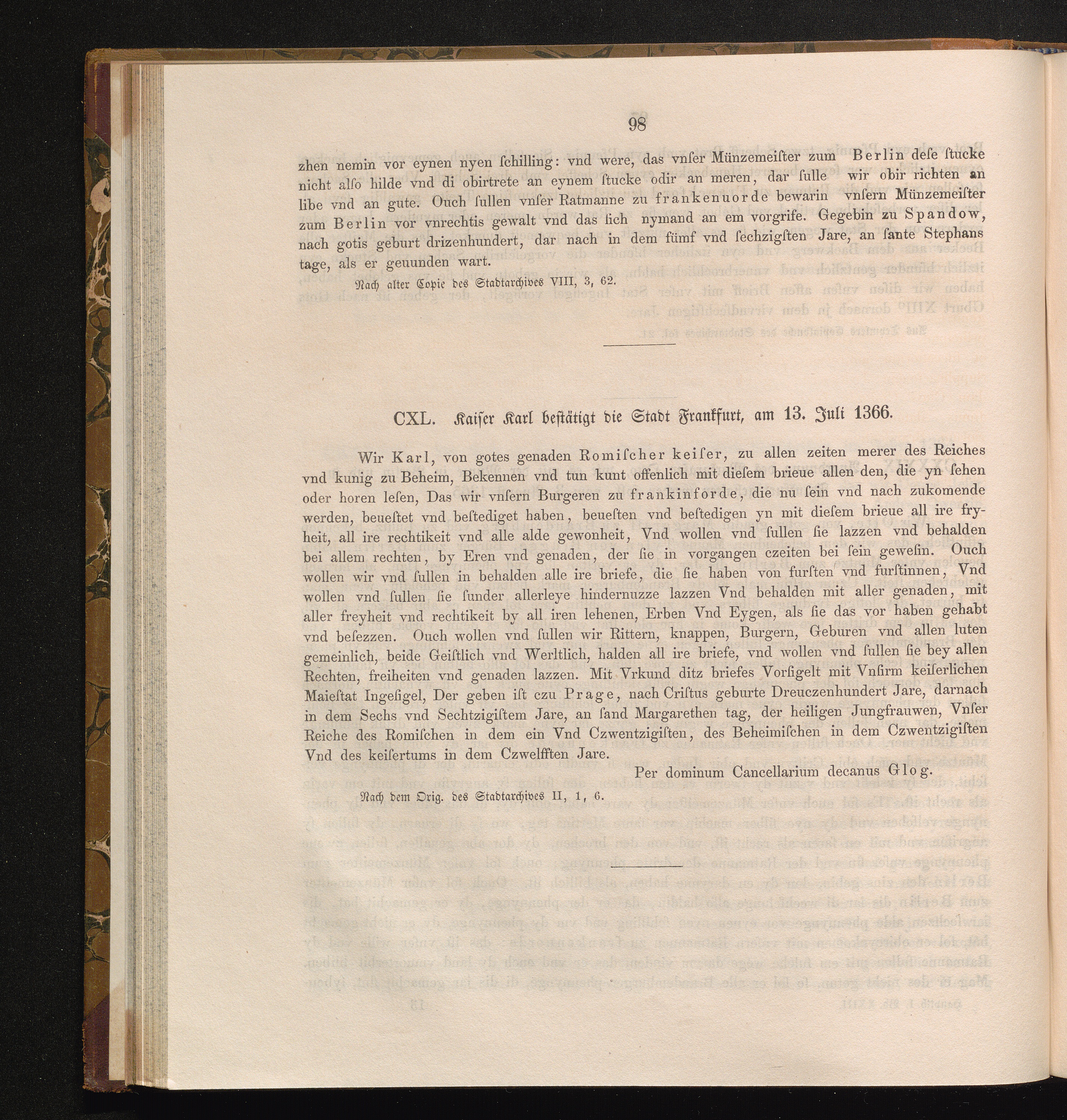 CXL. Kaiser Karl bestätigt die Stadt Frankfurt, am 13. Juli 1366.