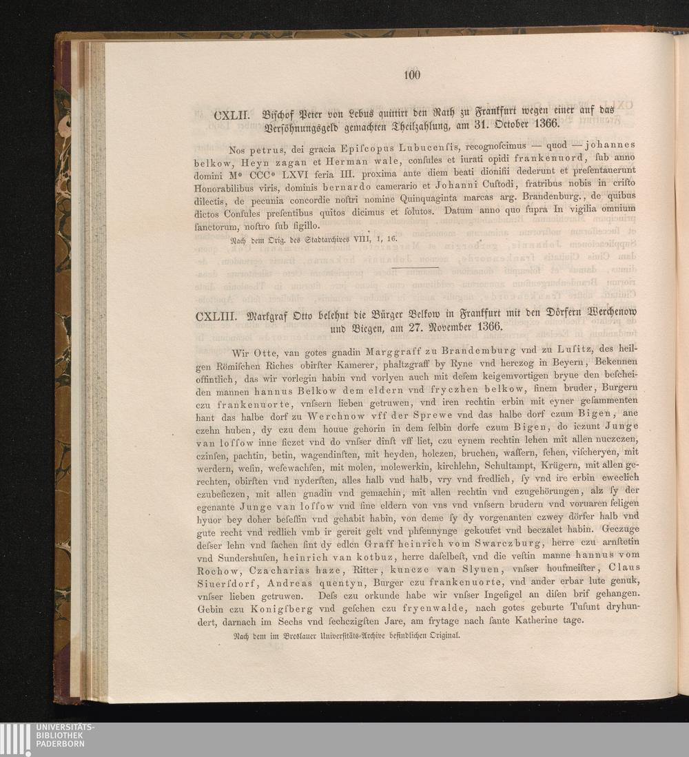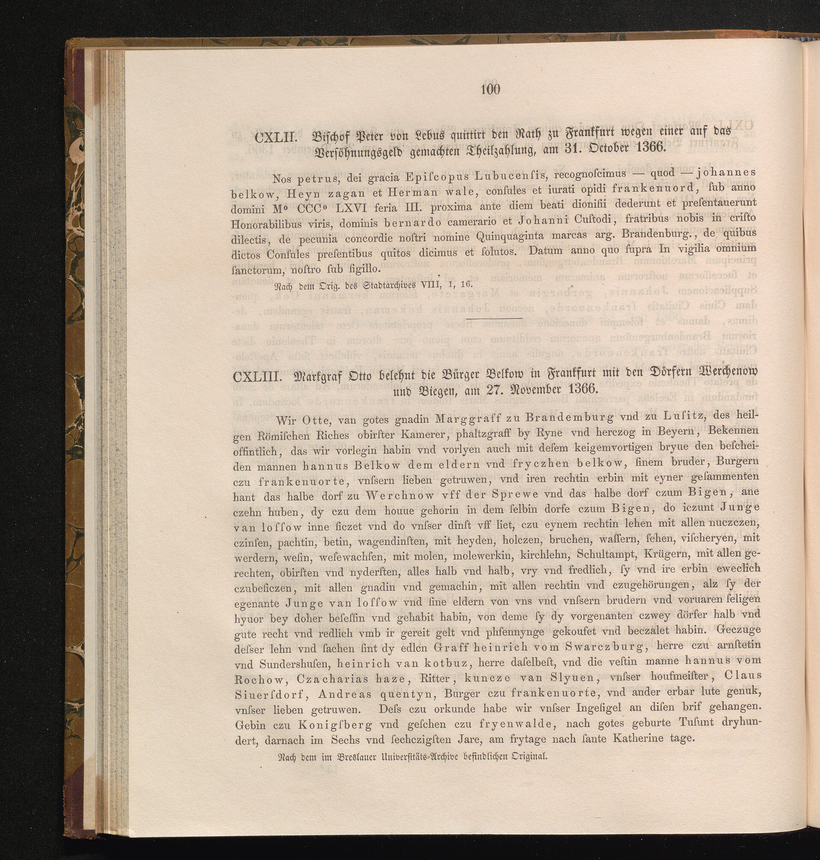 CXLIII. Markgraf Otto belehnt die Bürger Belkow in Frankfurt mit den Dörfern Werchenow[...]