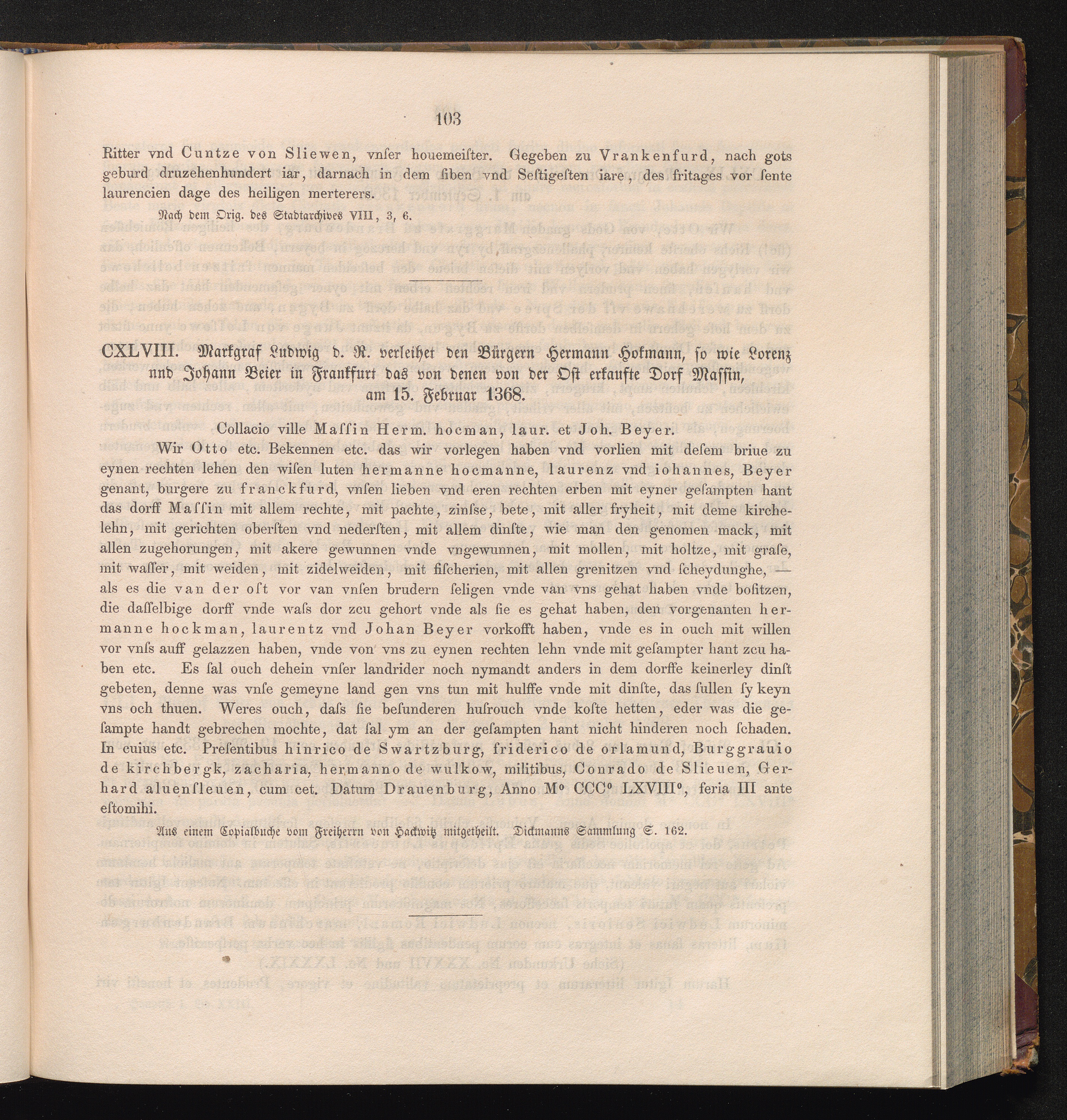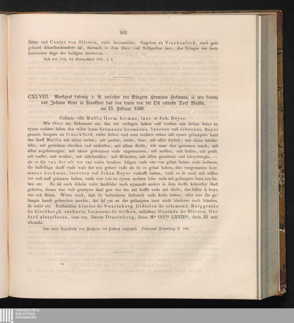 CXLVIII. Markgraf Ludwig d. R. verleihet den Bürgern Hermann Hokmann, so wie Lorenz[...]