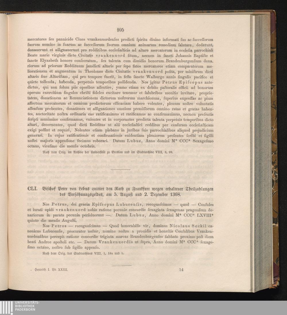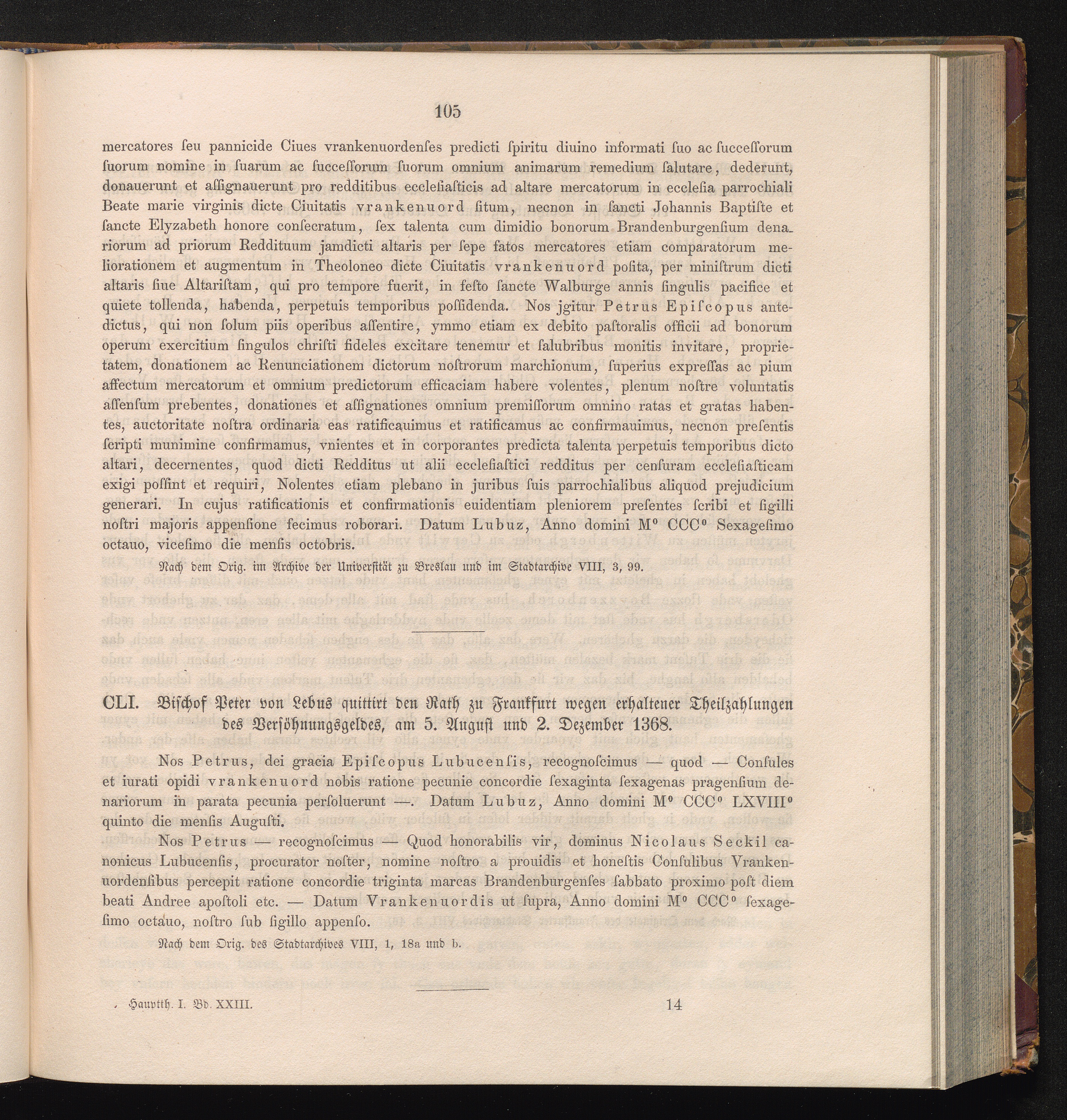 CLI. Bischof Peter von Lebus quittirt den Rath zu Frankfurt wegen erhaltener Theilzahlungen[...]