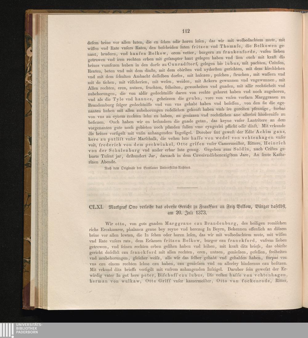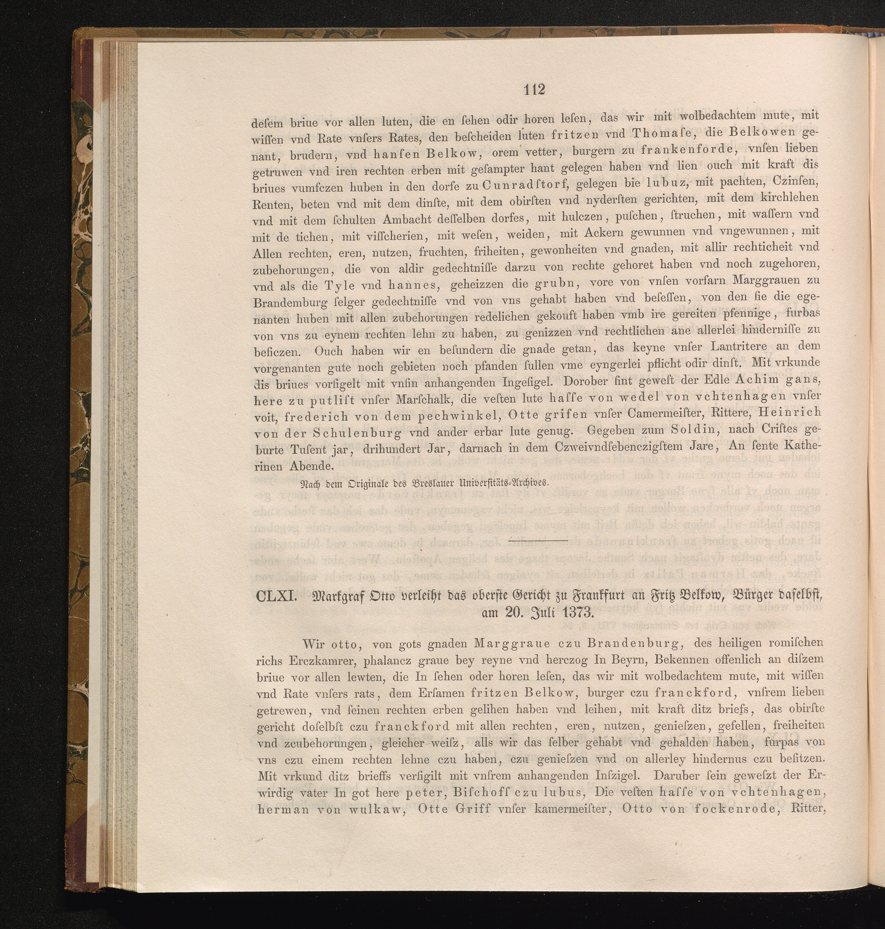 CLXI. Markgraf Otto verleiht das oberste Gericht zu Frankfurt an Fritz Belkow, Bürger[...]