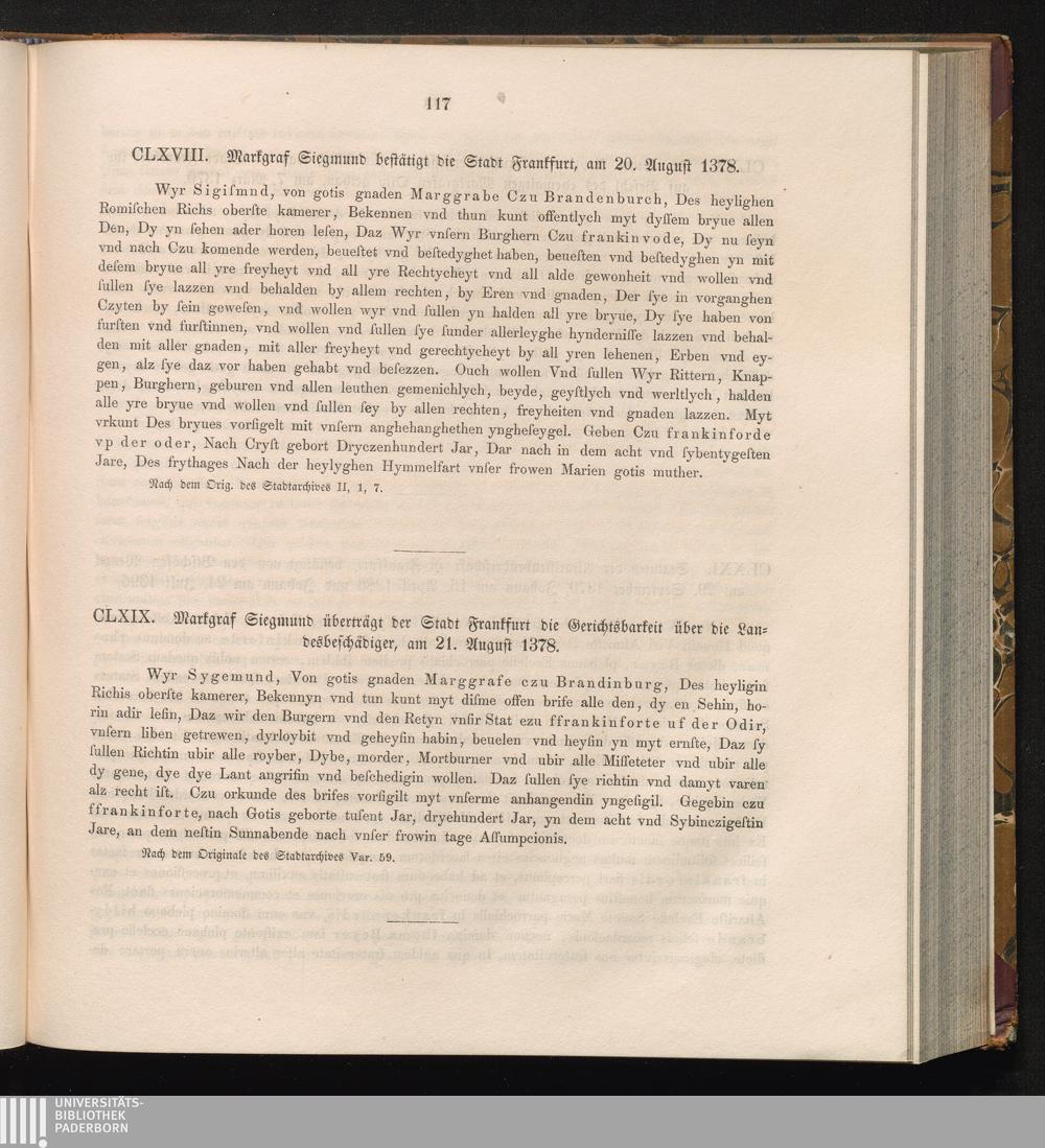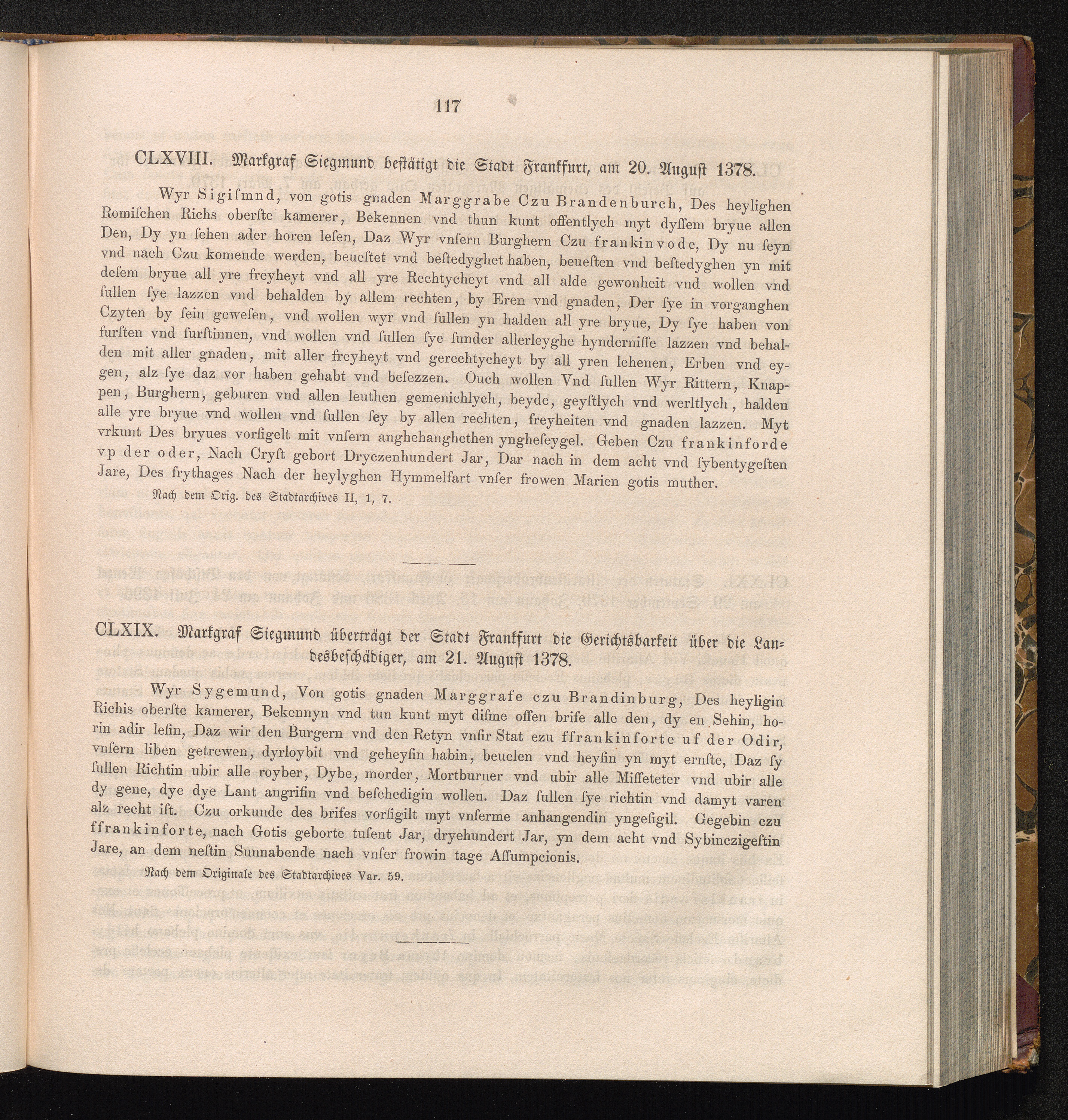 CLXIX. Markgraf Siegmund überträgt der Stadt Frankfurt die Gerichtsbarkeit über die[...]