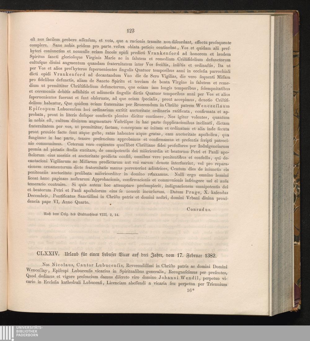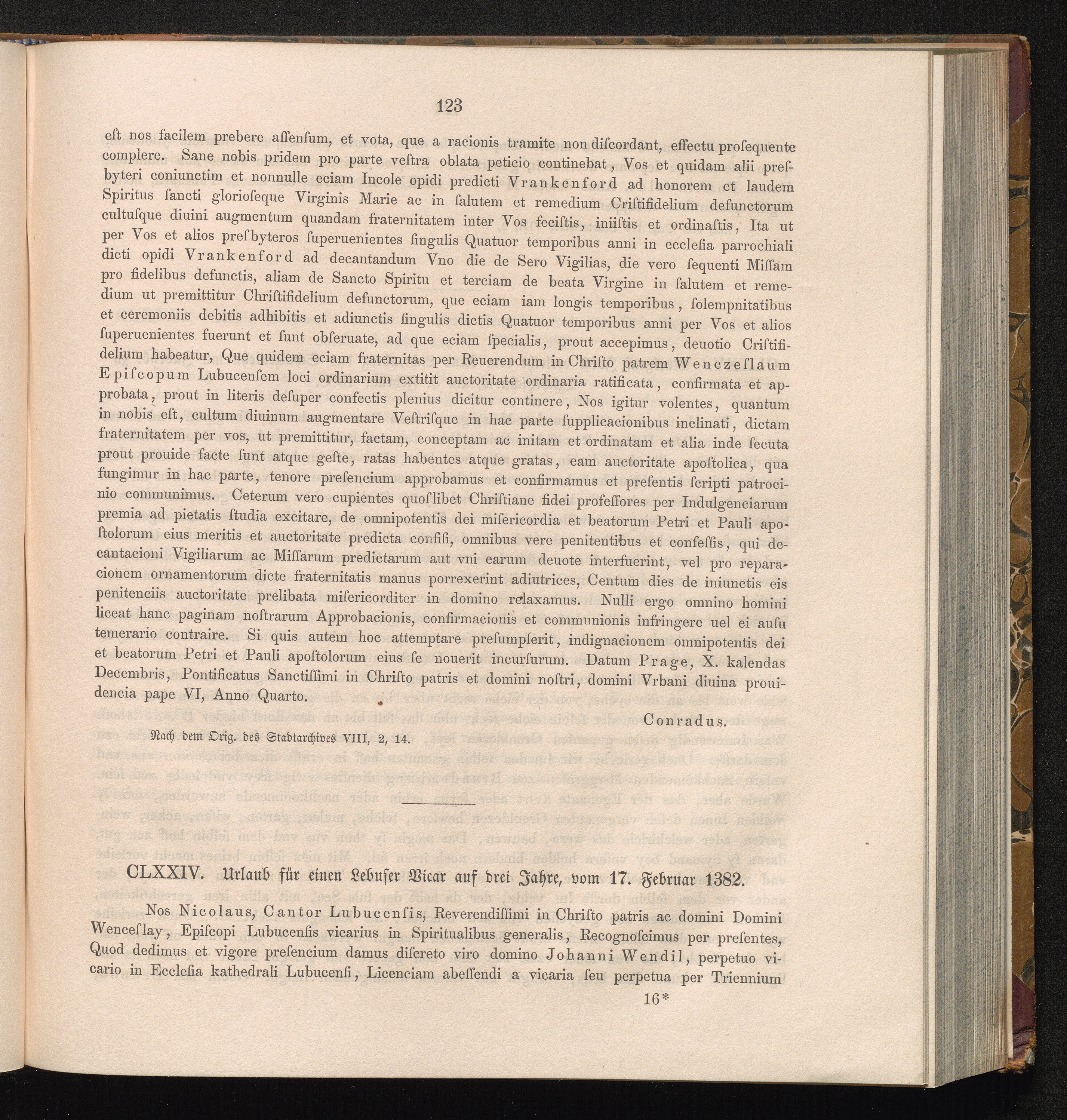 CLXXIV. Urlaub für einen Lebuser Vicar auf drei Jahre, vom 17. Februar 1382.