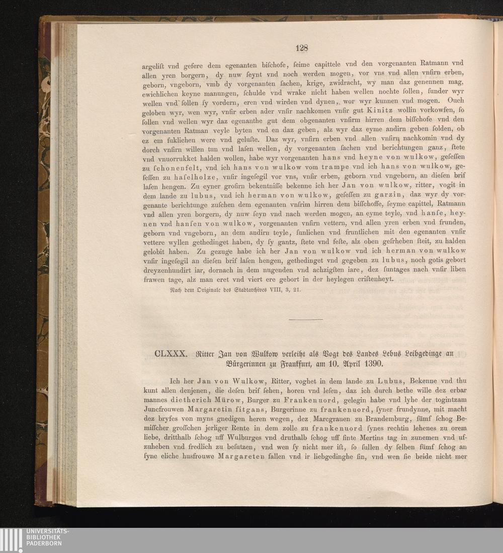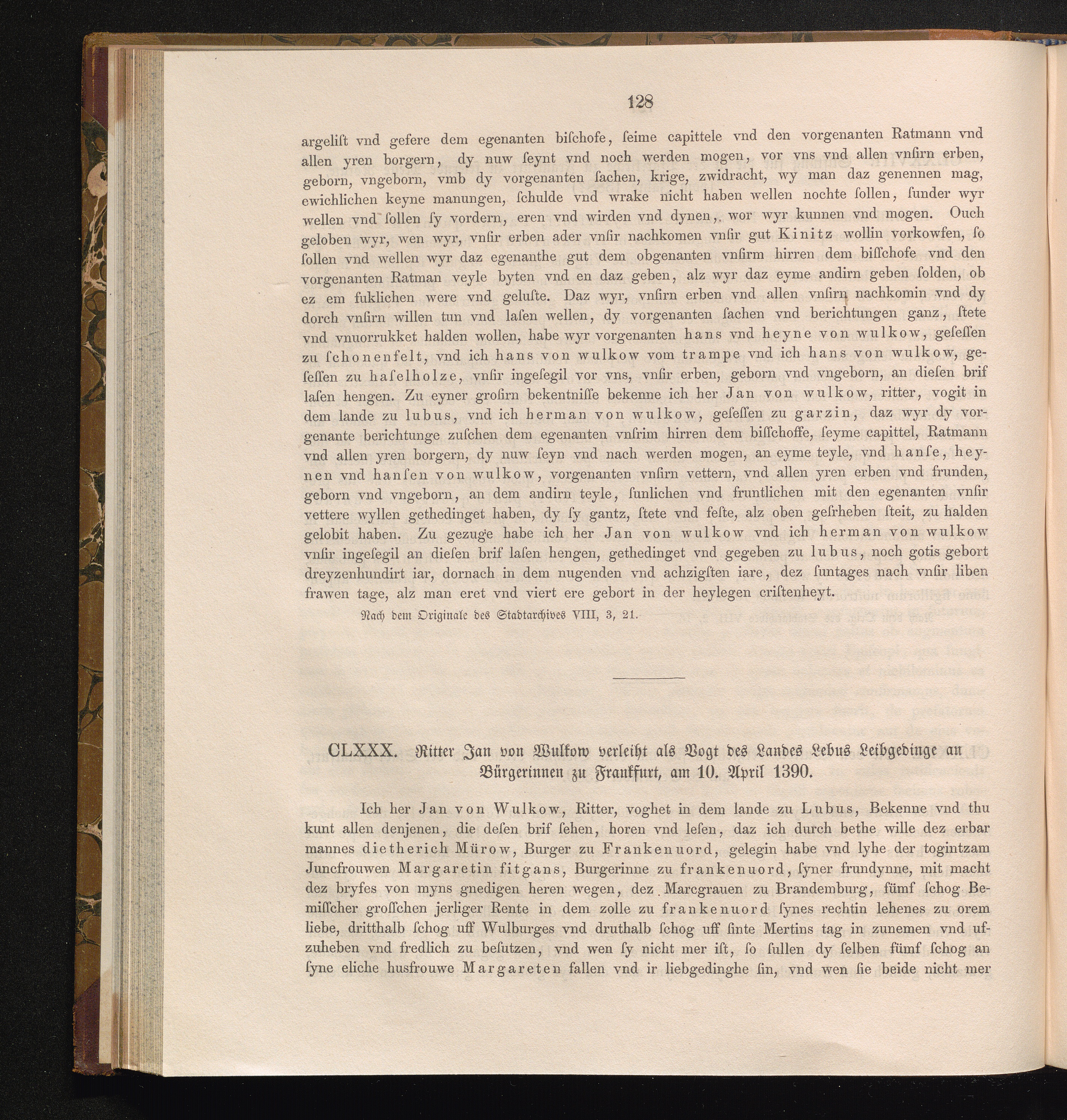 CLXXX. Ritter Jan von Wulkow verleiht als Vogt des Landes Lebus Leibgedinge an Bürgerinnen[...]