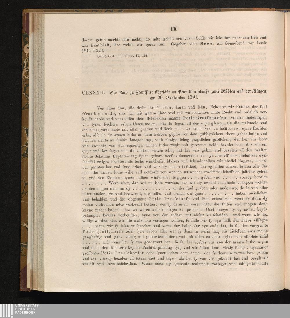 CLXXXII. Der Rath zu Frankfurt überläßt an Peter Grutscharfe zwei Mühlen auf der[...]