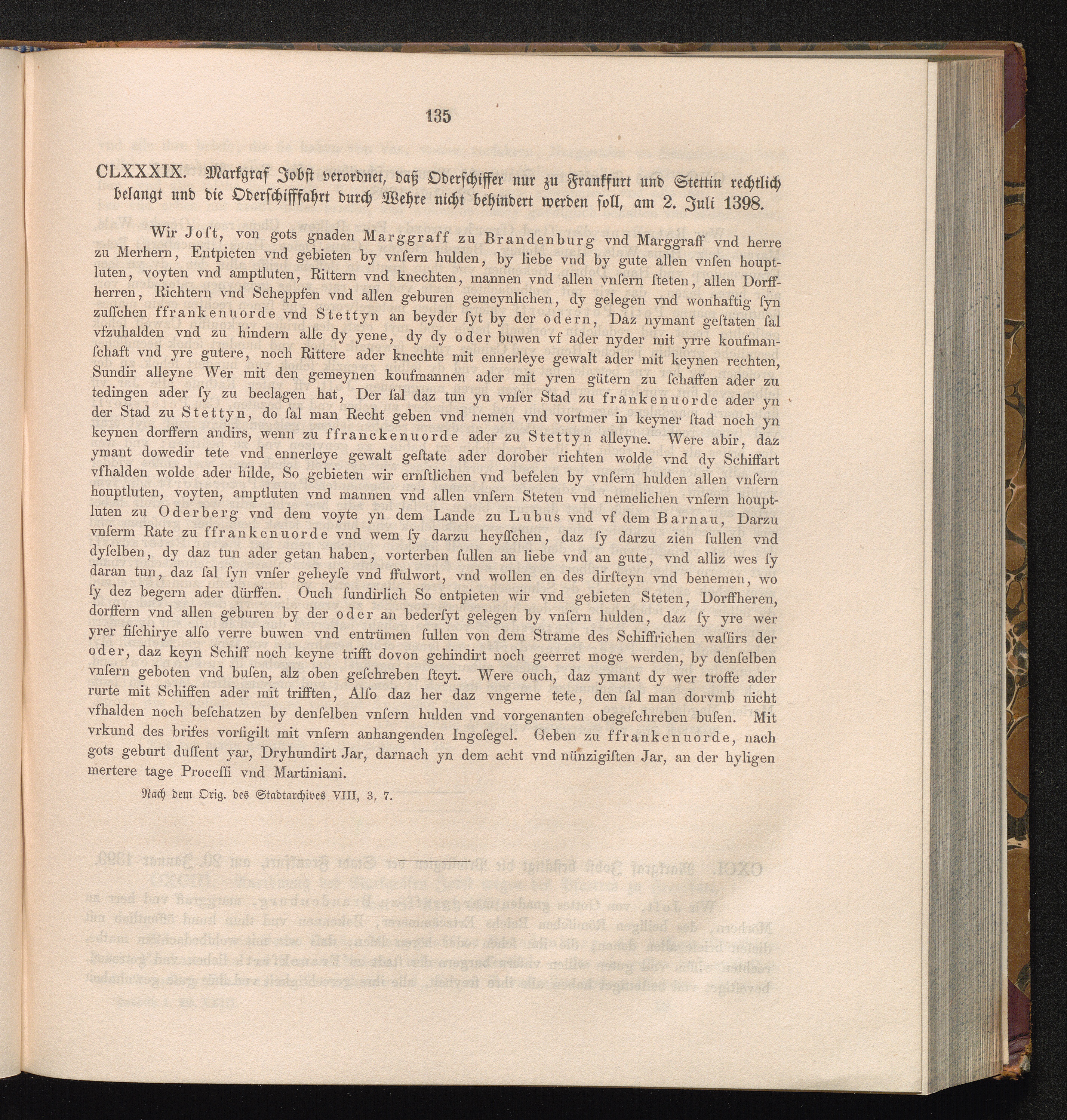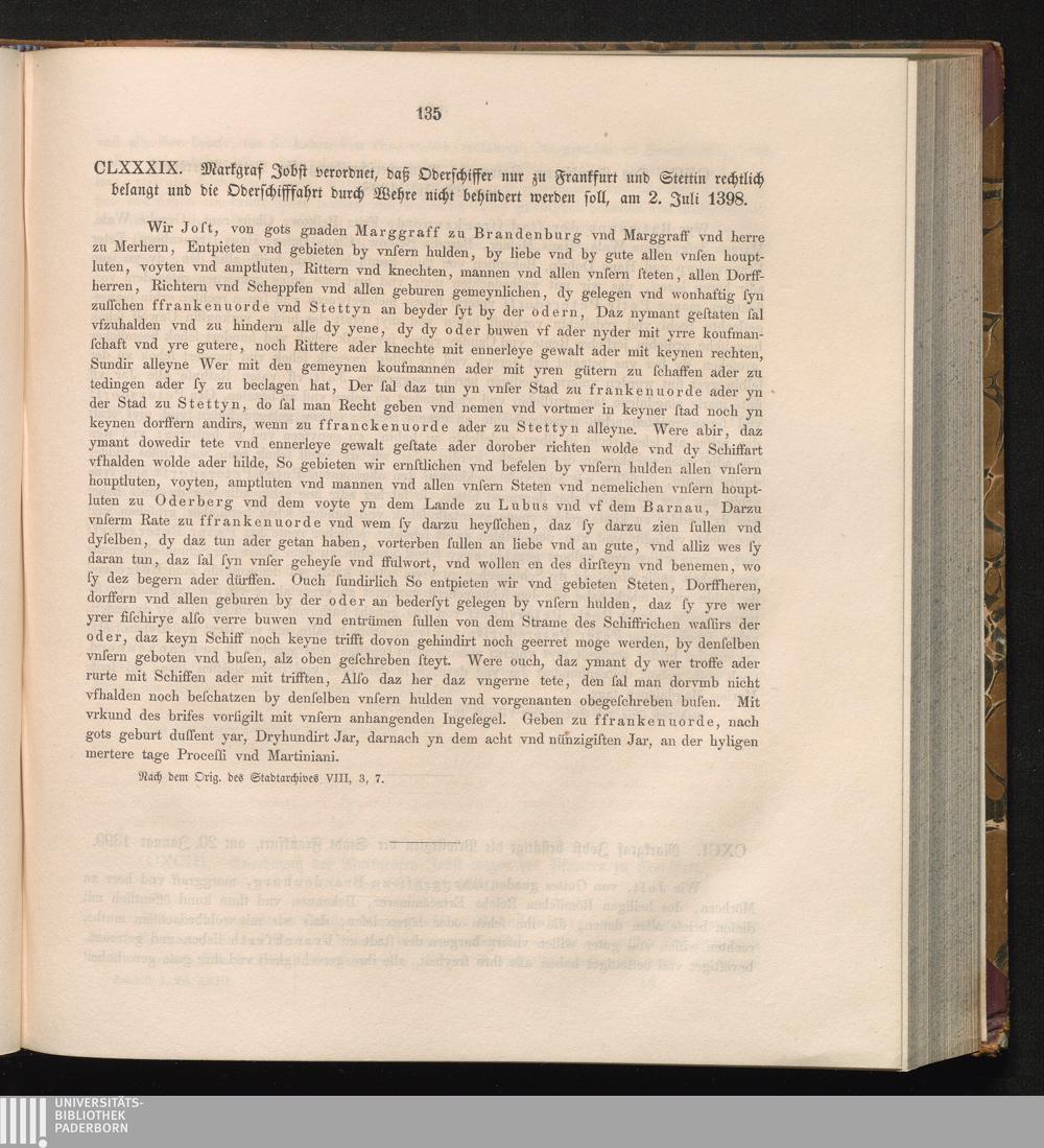 CLXXXIX. Markgraf Jobst verordnet, daß Oberschiffer nur zu Frankfurt und Stettin[...]