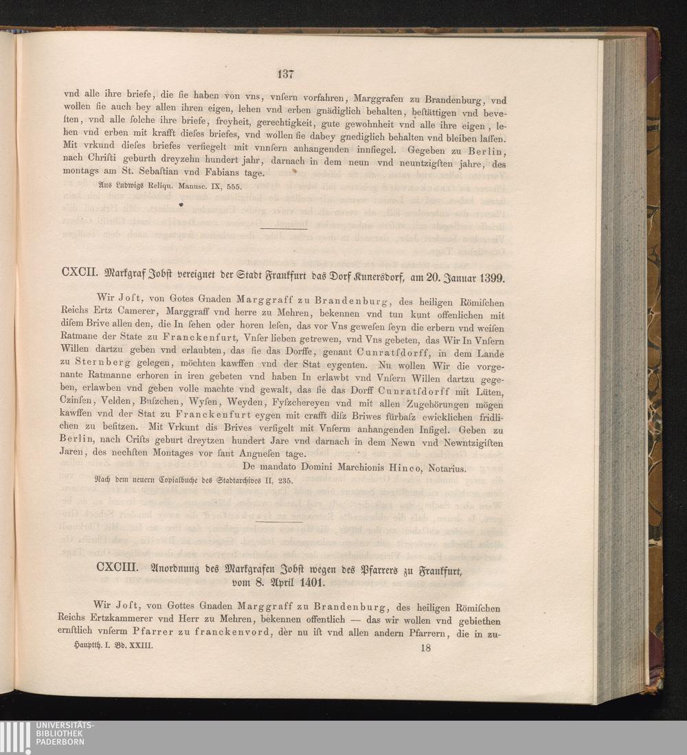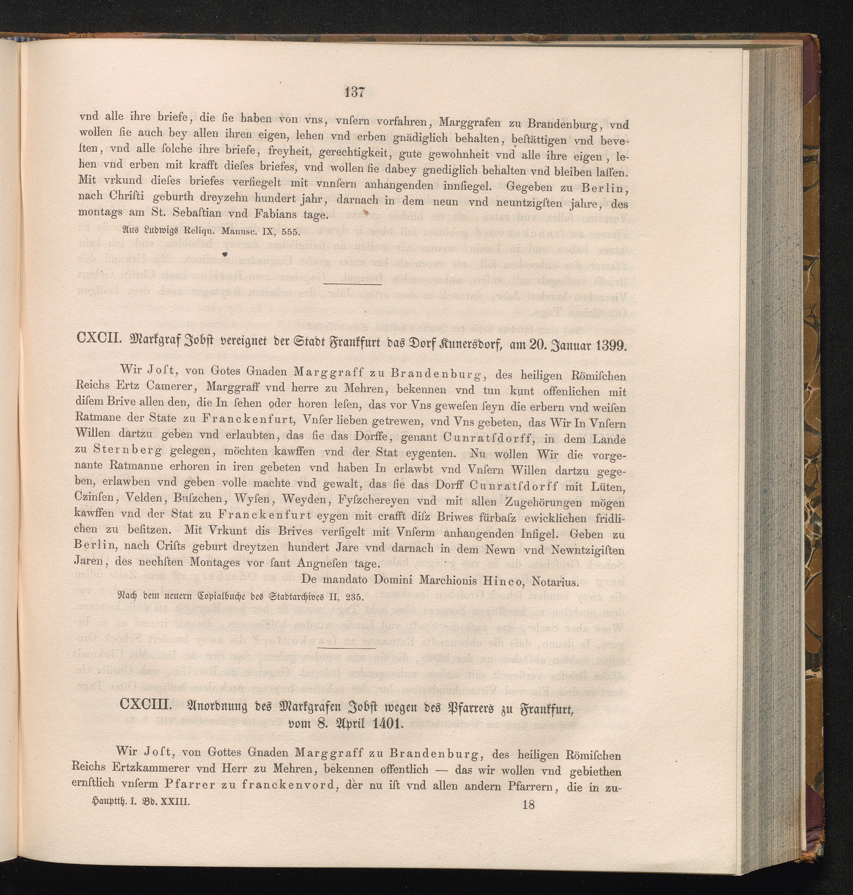 CXCIII. Anordnung des Markgrafen Jobst wegen des Pfarrers zu Frankfurt, vom 8. April[...]