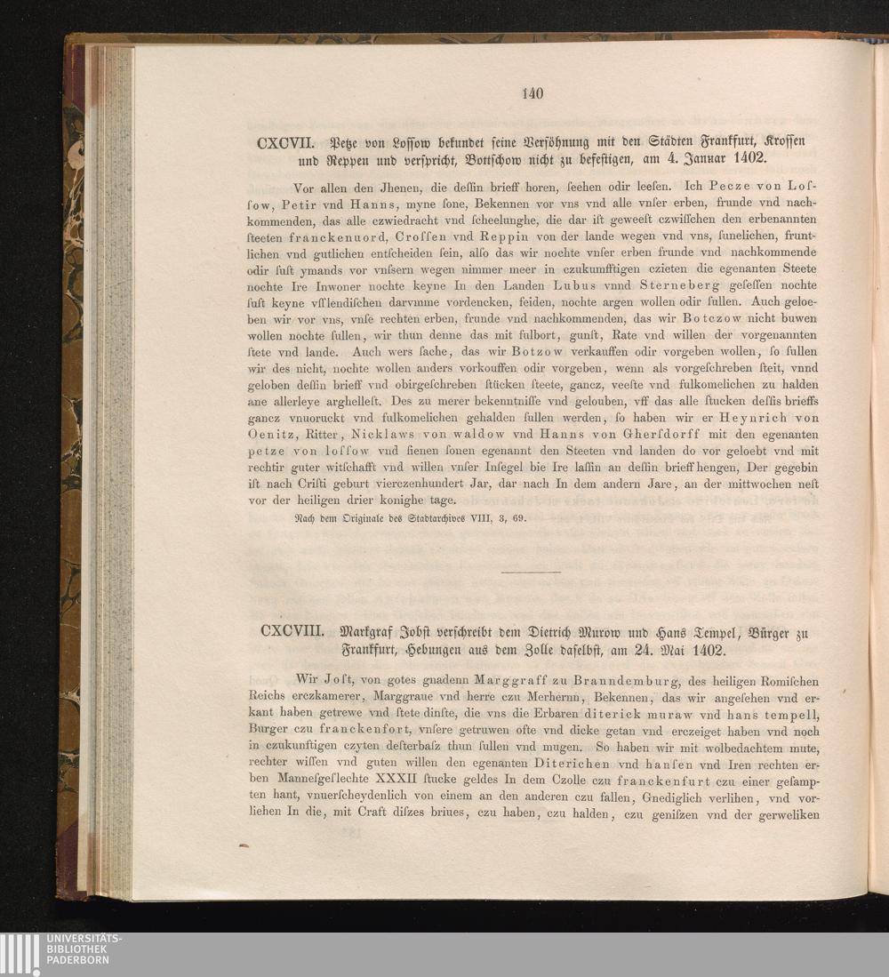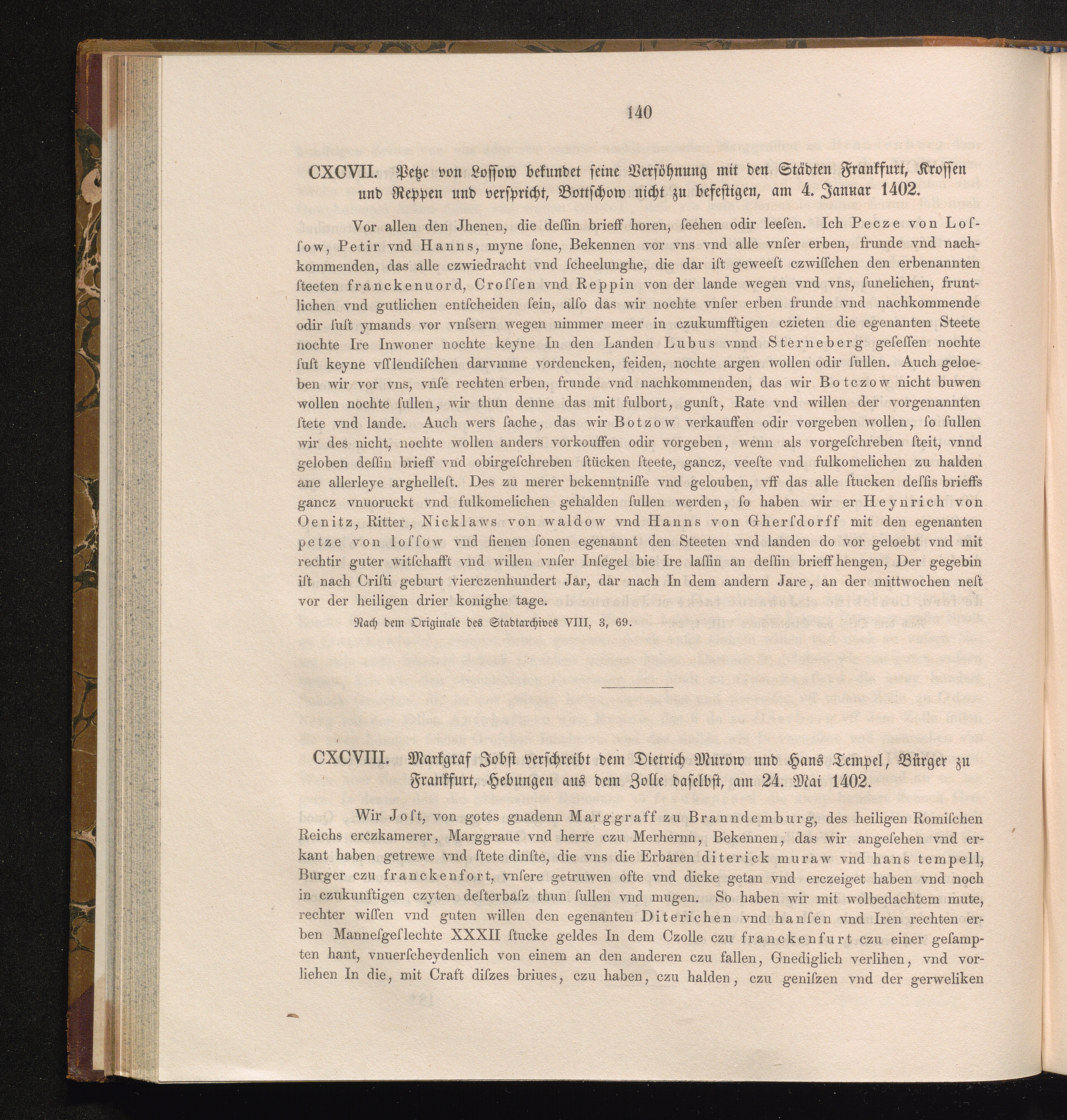 CXCVIII. Markgraf Jobst verschreibt dem Dieterich Murow und Hans Tempel, Bürger zu[...]