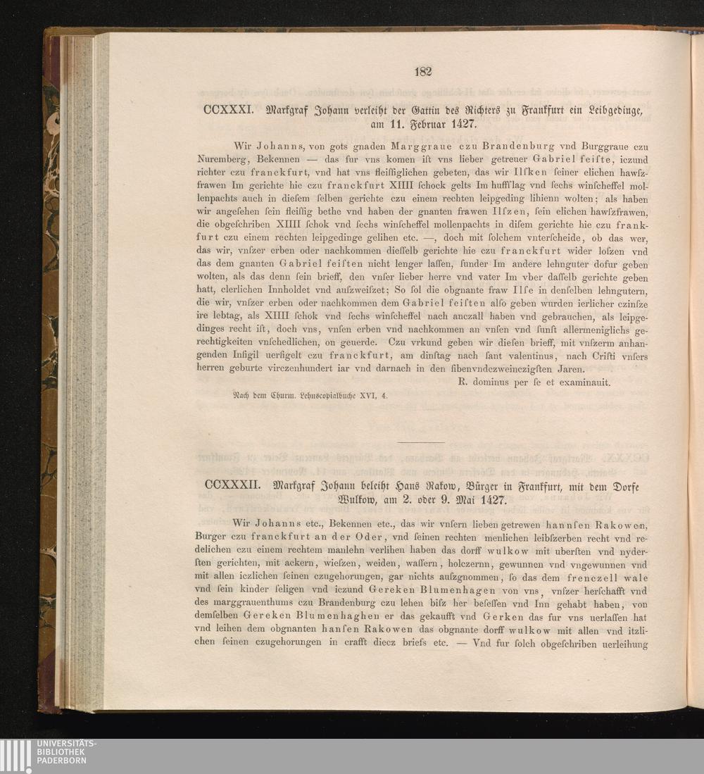 CCXXXII. Markgraf Johann beleiht Hans Rakow, Bürger in Frankfurt, mit dem Dorfe Wulkow,[...]
