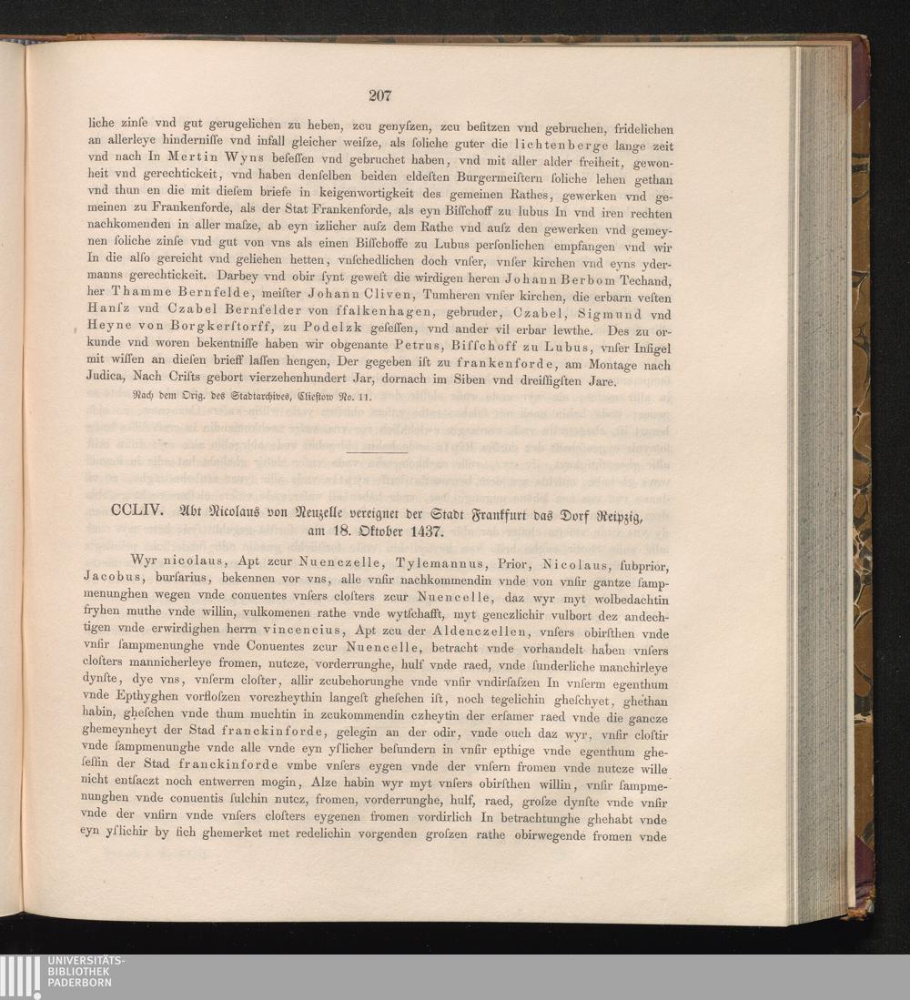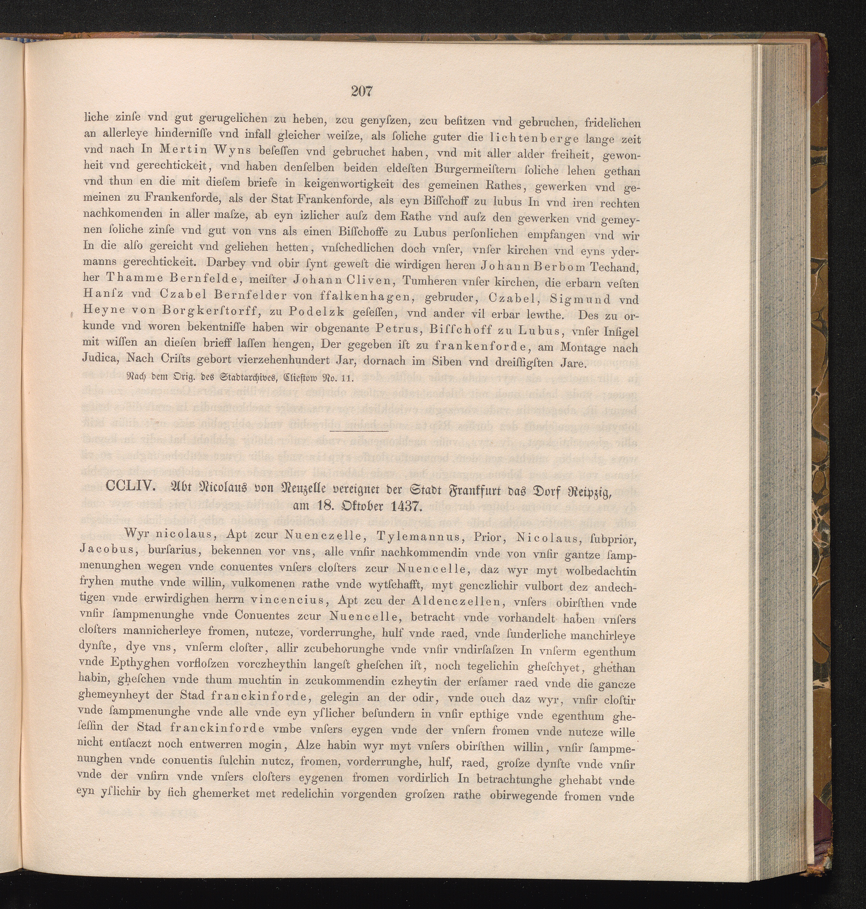 CCLIV. Abt Nicolaus von Neuzelle vereignet der Stadt Frankfurt das Dorf Reipzig,[...]