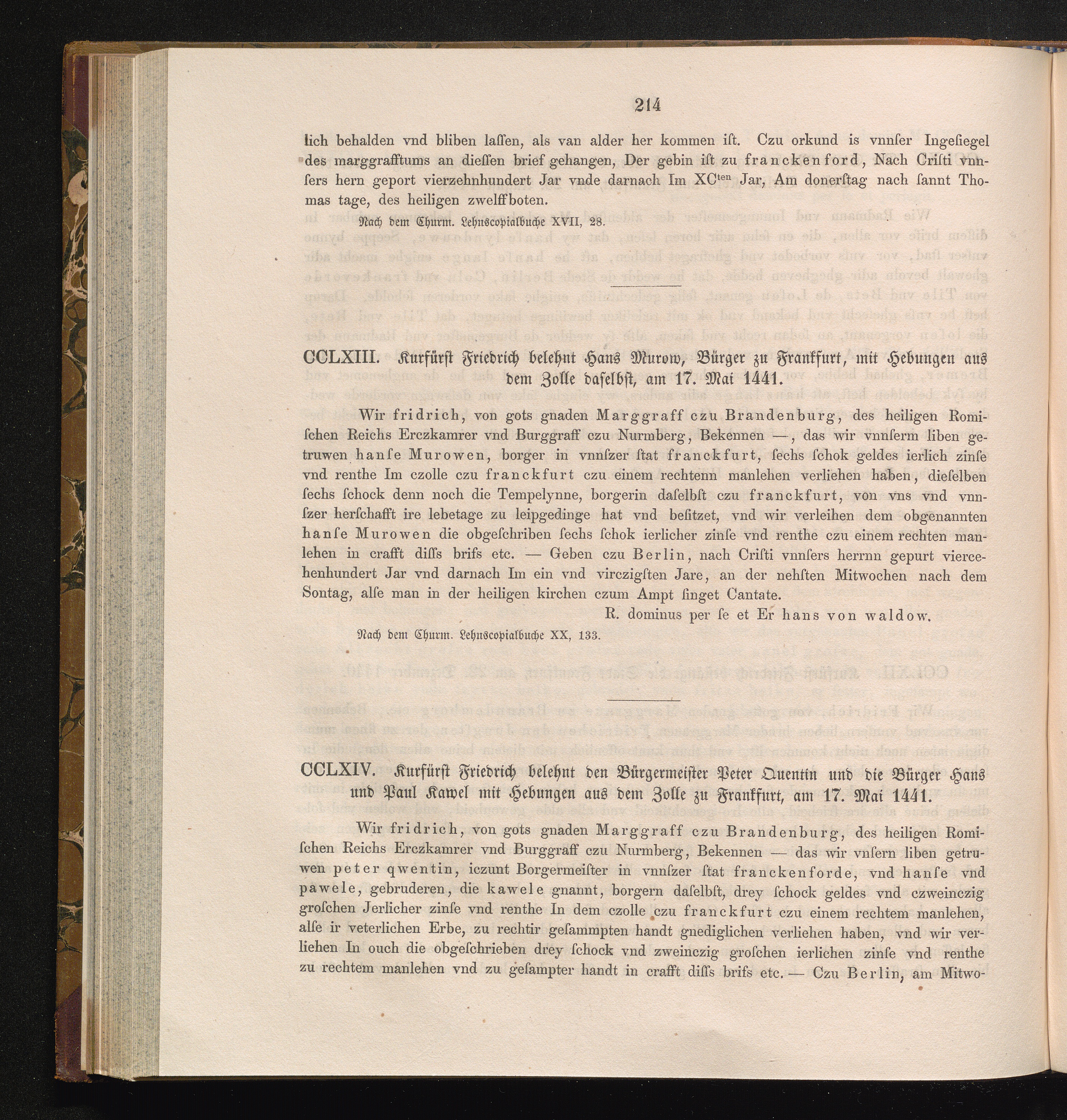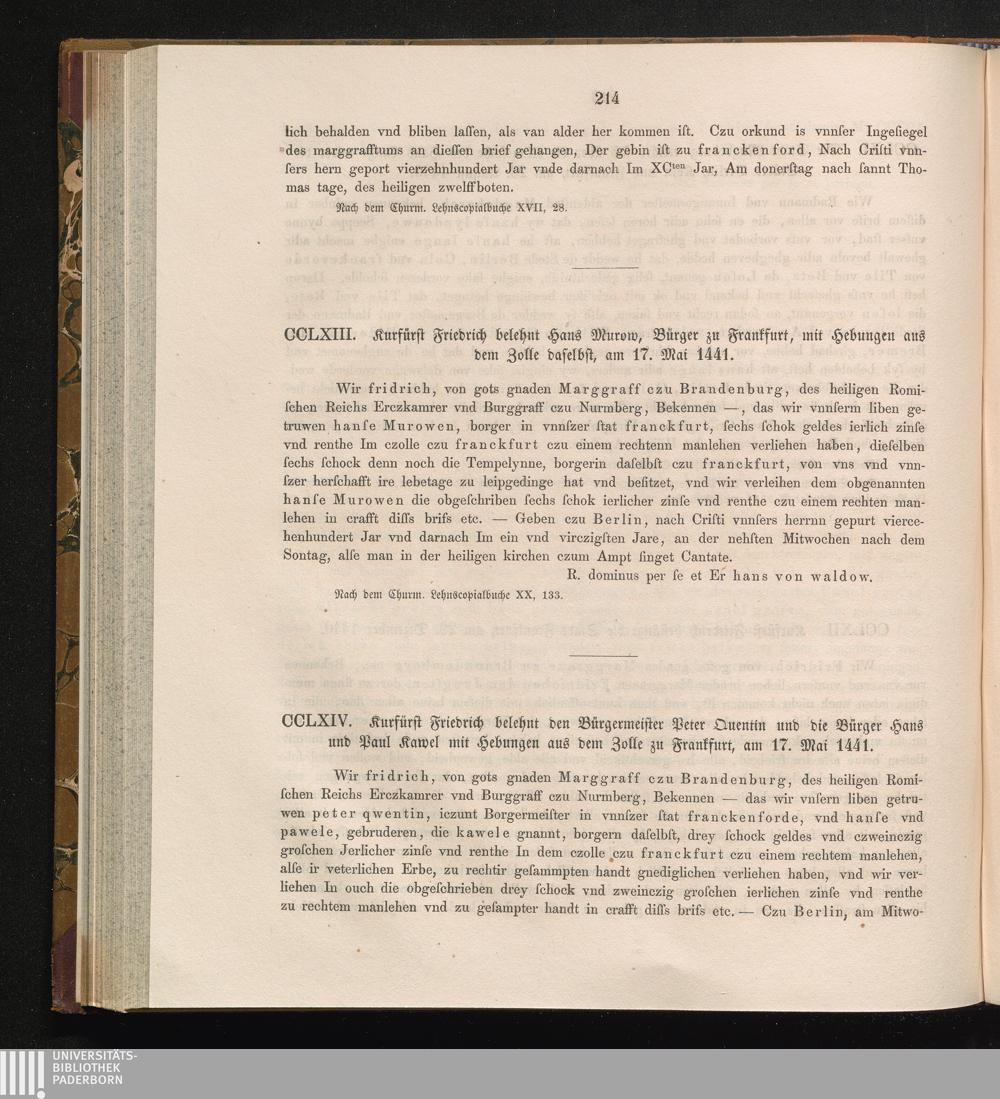 CCLXIV. Kurfürst Friedrich belehnt den Bürgermeister Peter Quentin und die Bürger[...]