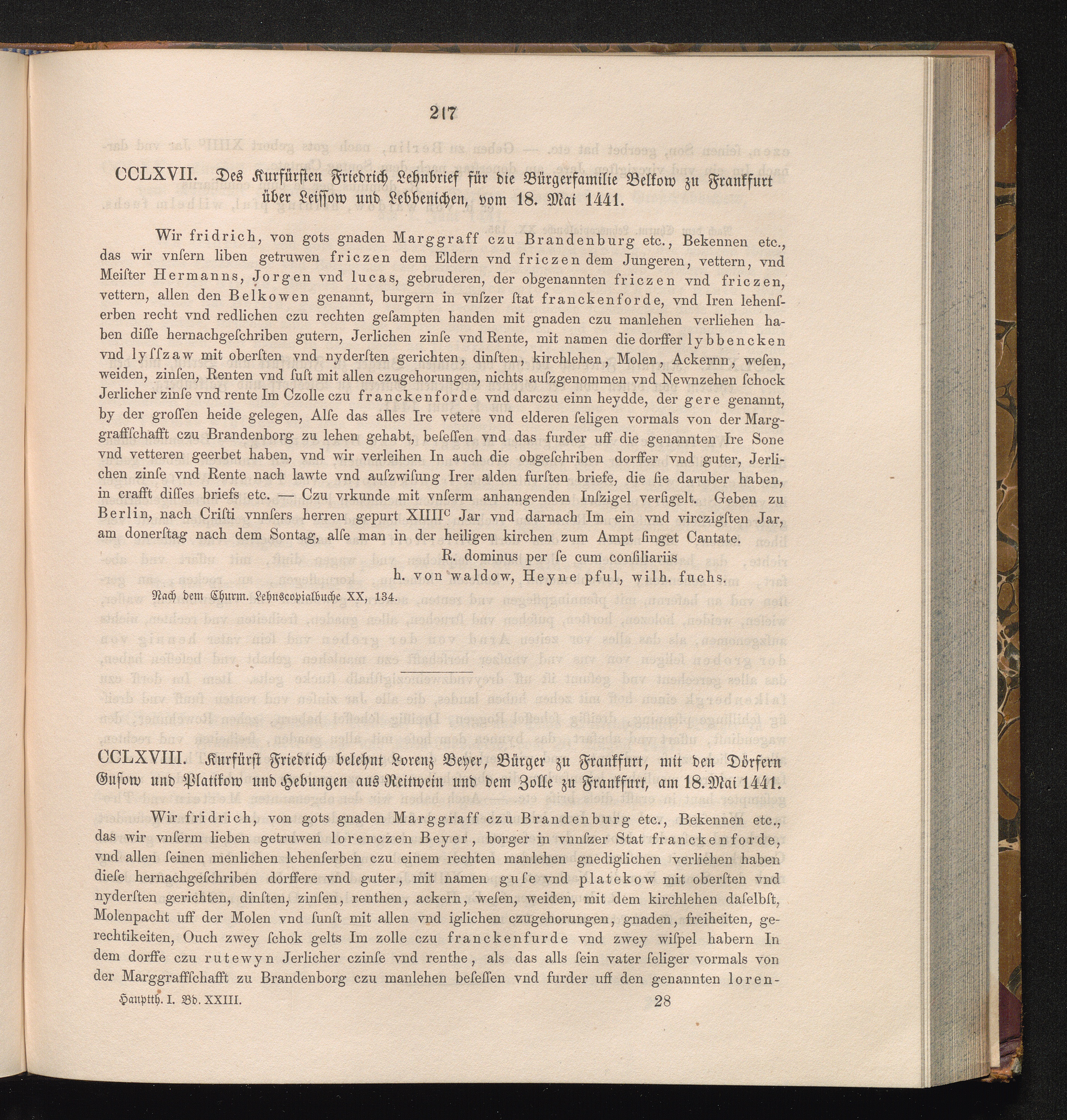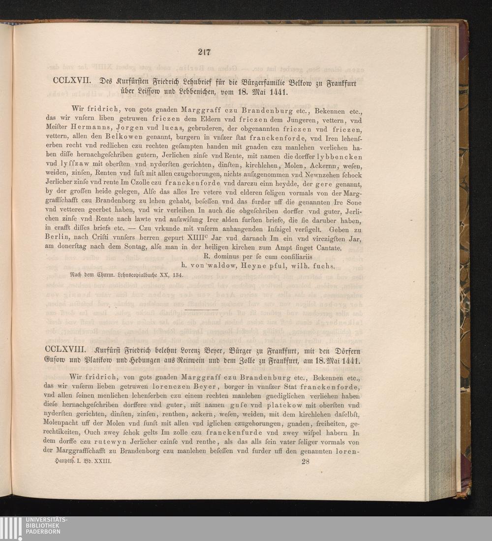 CCLXVIII. Kurfürst Friedrich belehnt Lorenz Beyer, Bürger zu Frankfurt, mit den Dörfern[...]