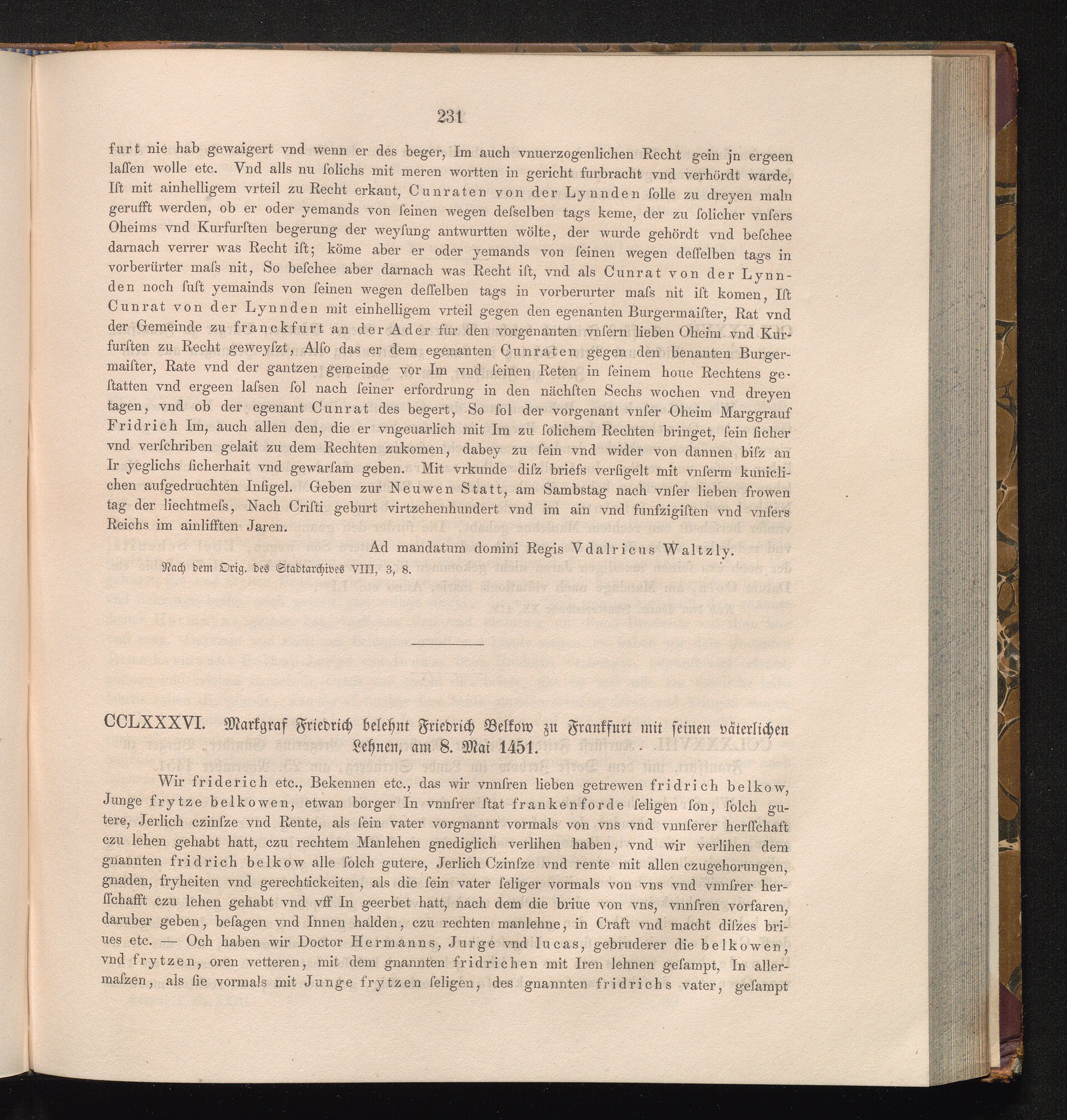 CCLXXXVI. Markgraf Friedrich belehnt Friedrich Belkow zu Frankfurt mit seinen väterlichen[...]