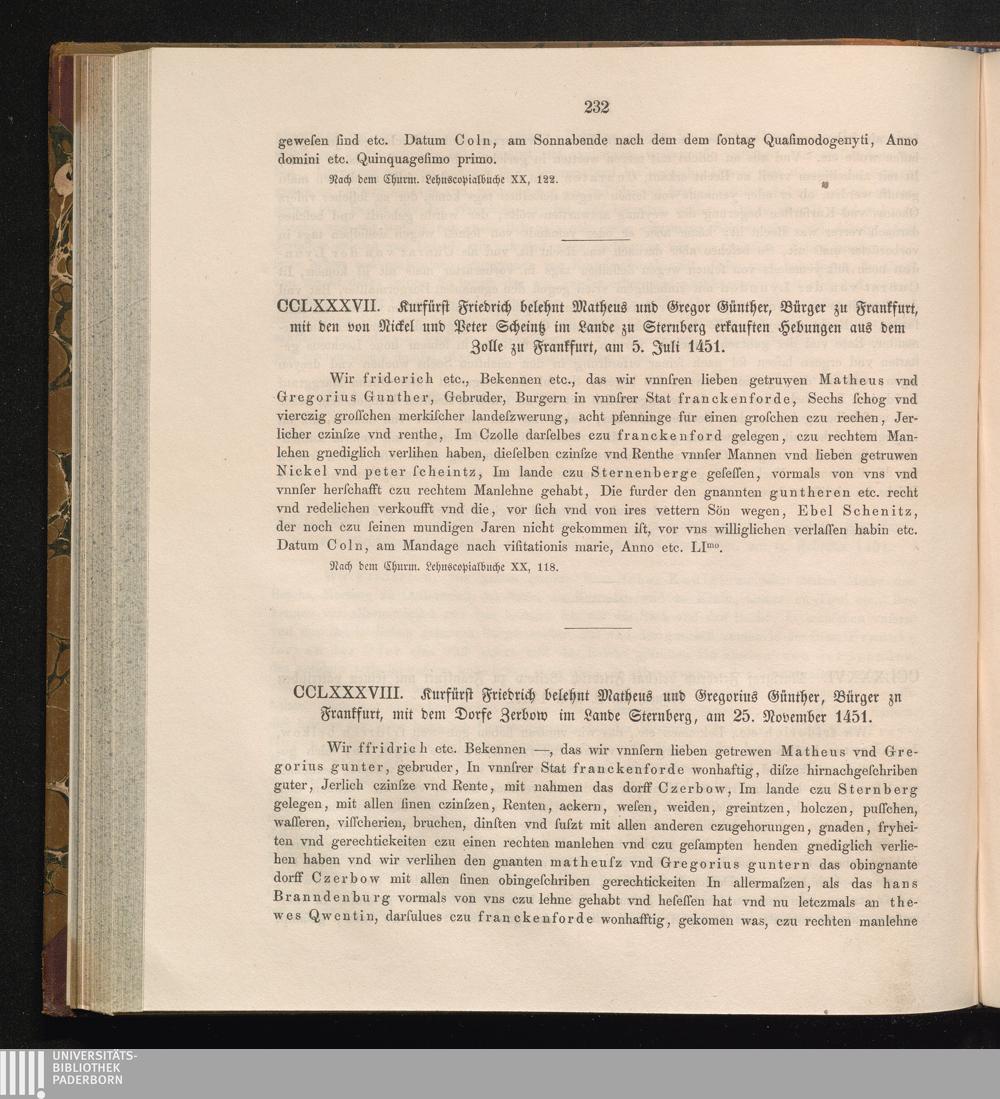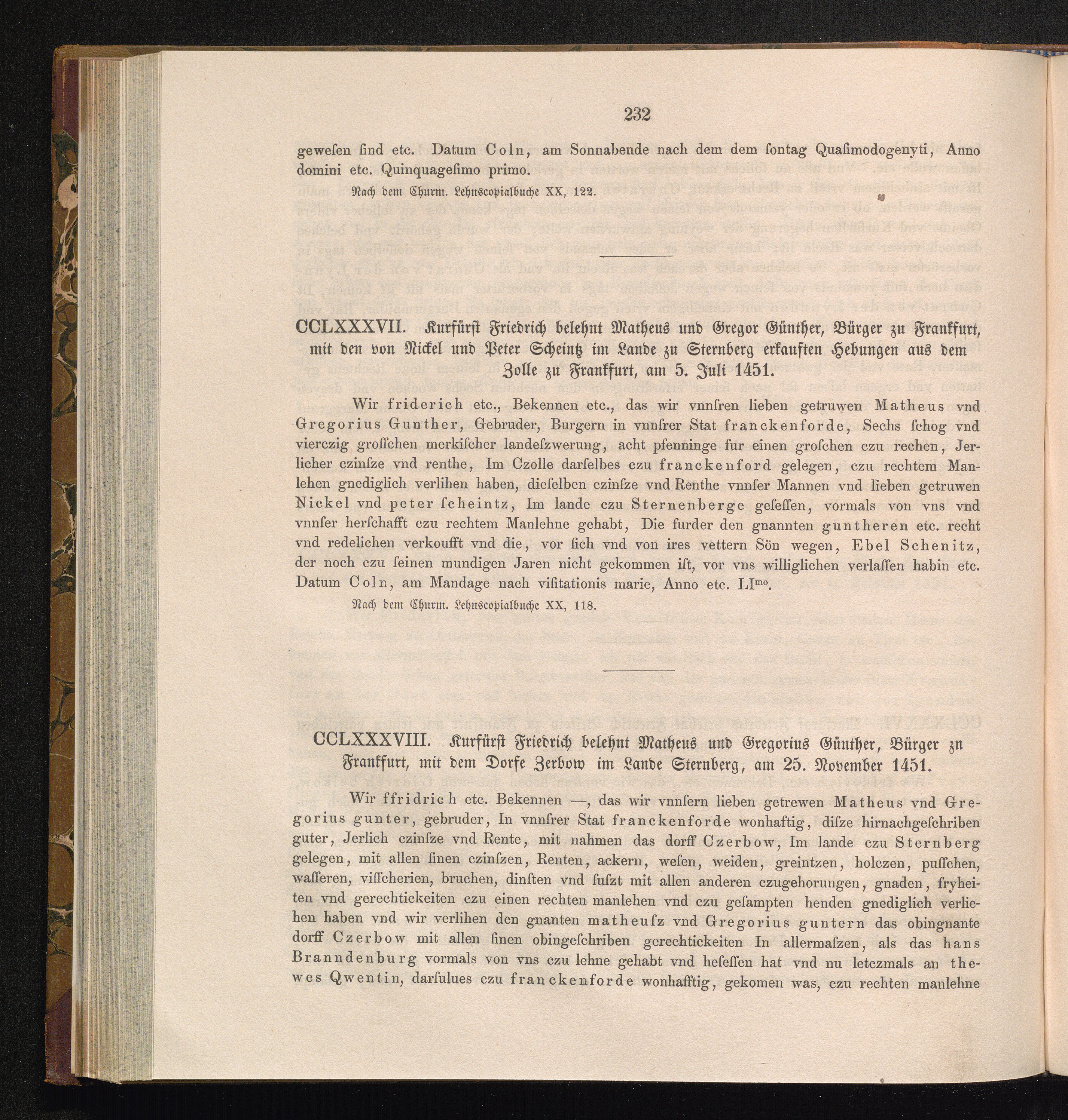 CCLXXXVIII. Kurfürst Friedrich belehnt Matheus und Gregorius Günther, Bürger zu Frankfurt,[...]