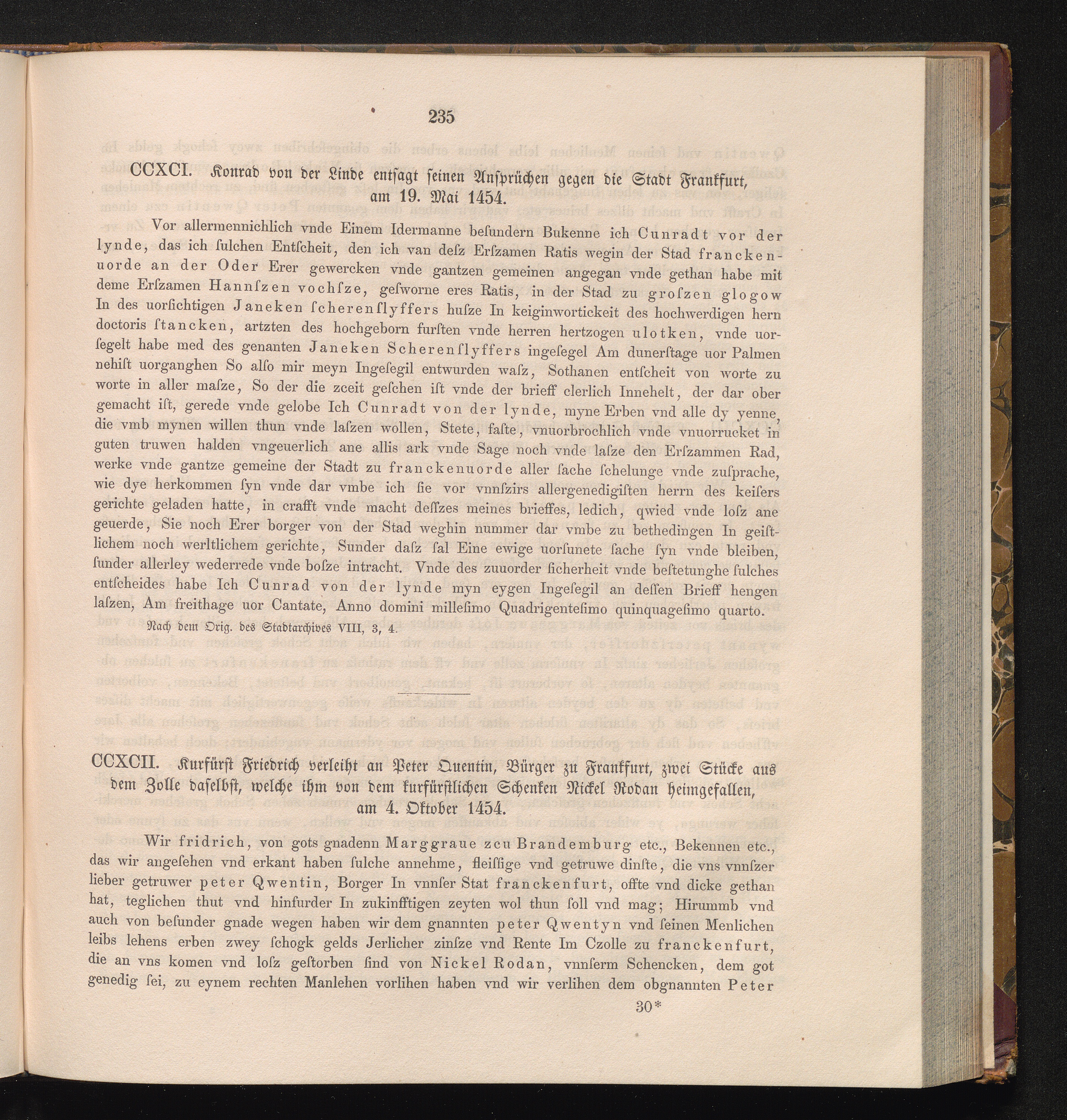 CCXCII. Kurfürst Friedrich verleiht an Peter Quentin, Bürger zu Frankfurt, zwei Stücke[...]
