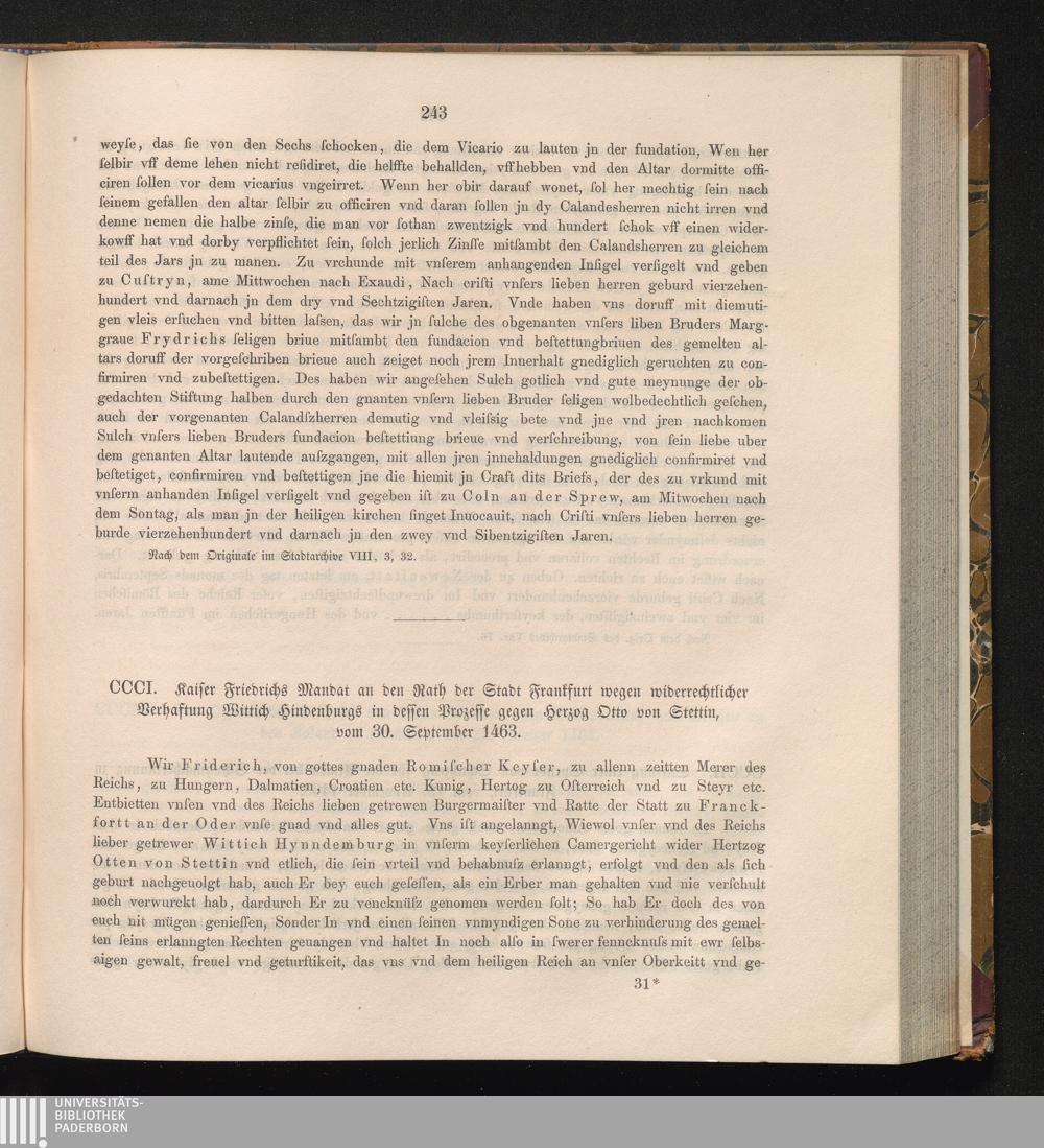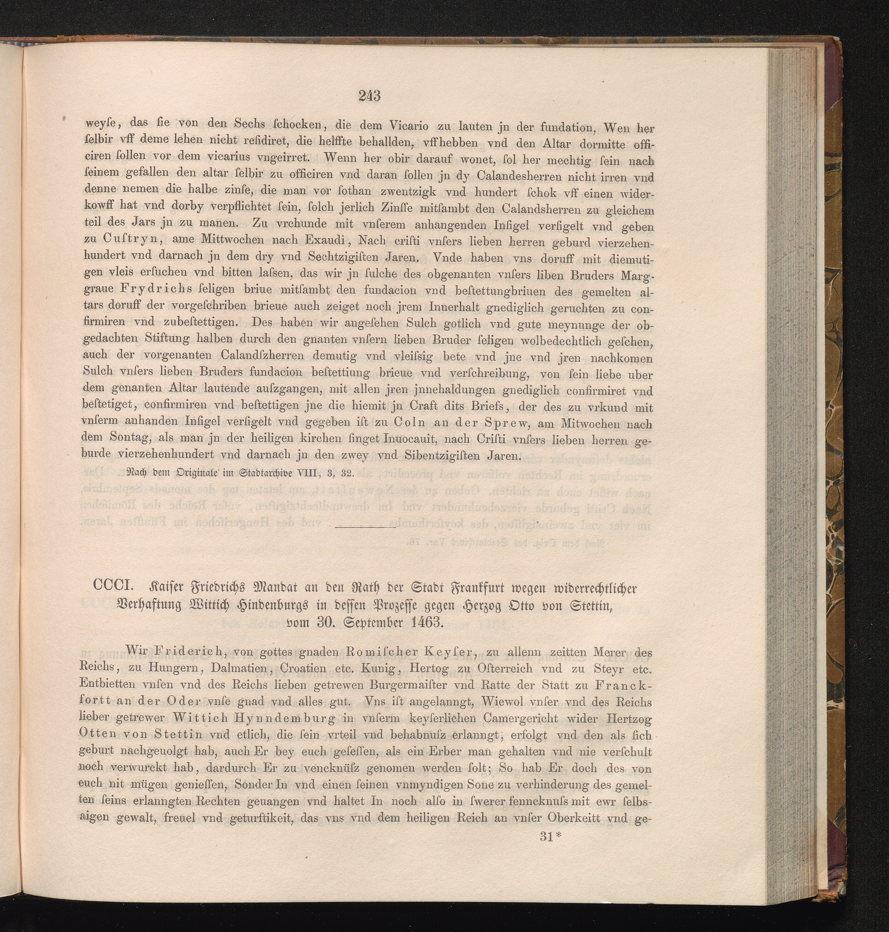 CCCI. Kaiser Friedrichs Mandat an den Rath der Stadt Frankfurt wegen widerrechtlicher[...]