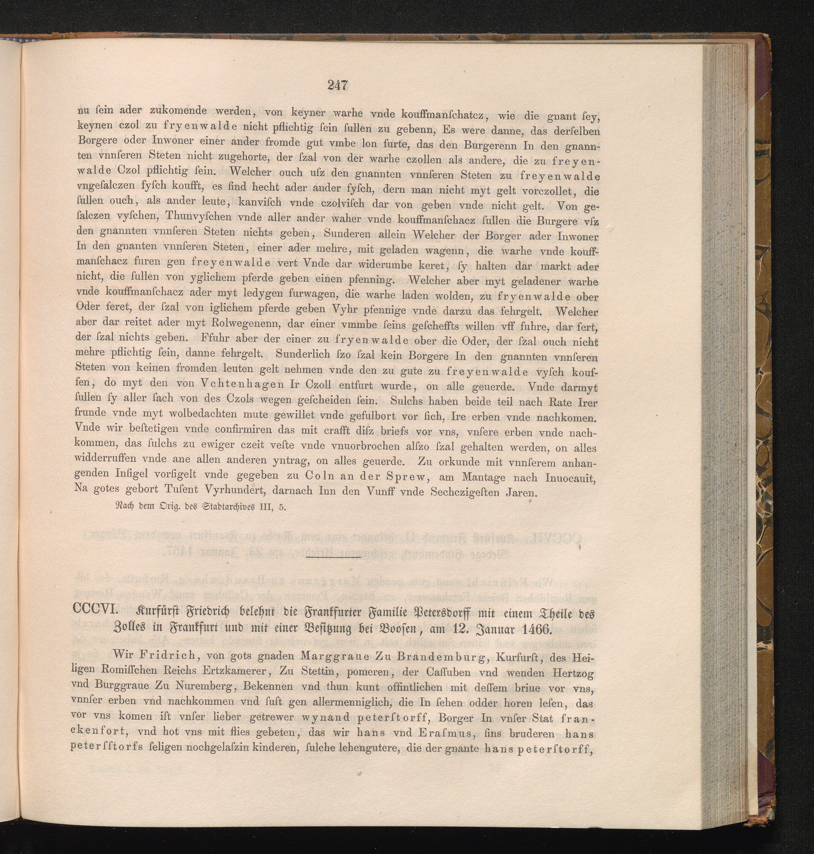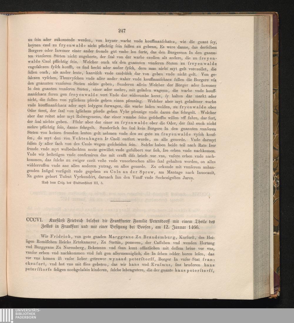 CCCVI. Kurfürst Friedrich belehnt die Frankfurter Familie Petersdorff mit einem Theile[...]