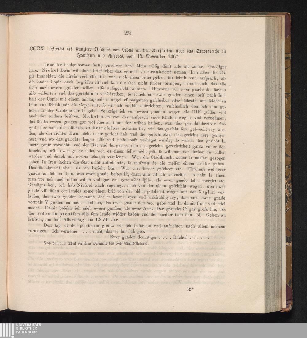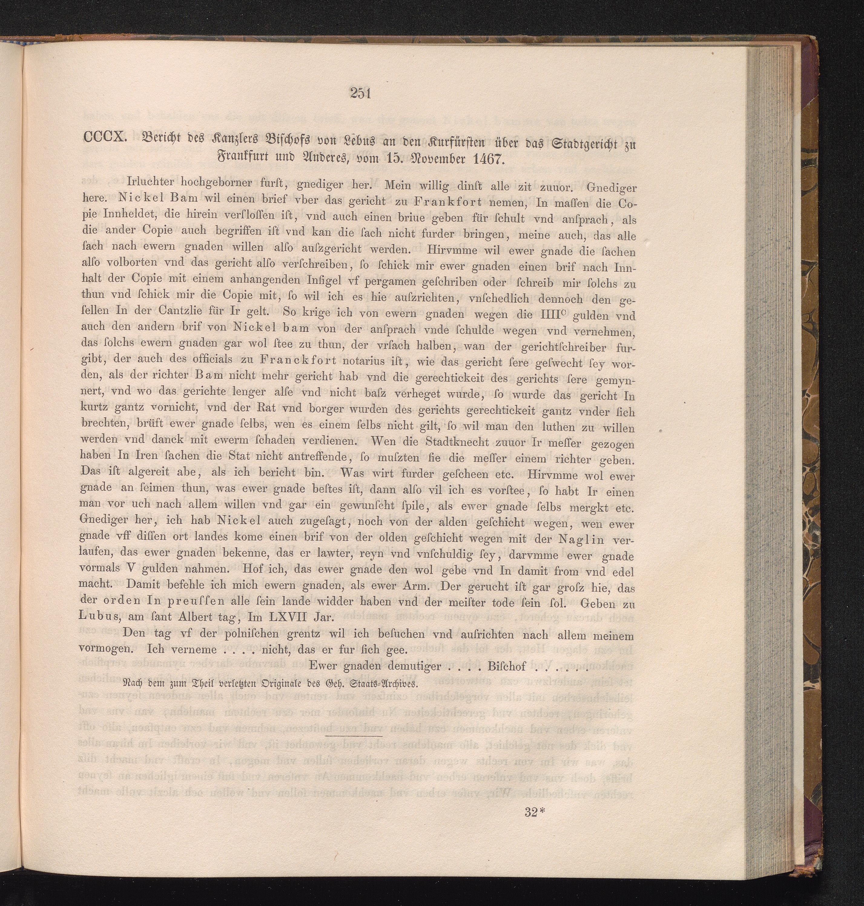 CCCX. Bericht des Kanzlers Bischofs von Lebus an den Kurfürsten über das Stadtgericht[...]