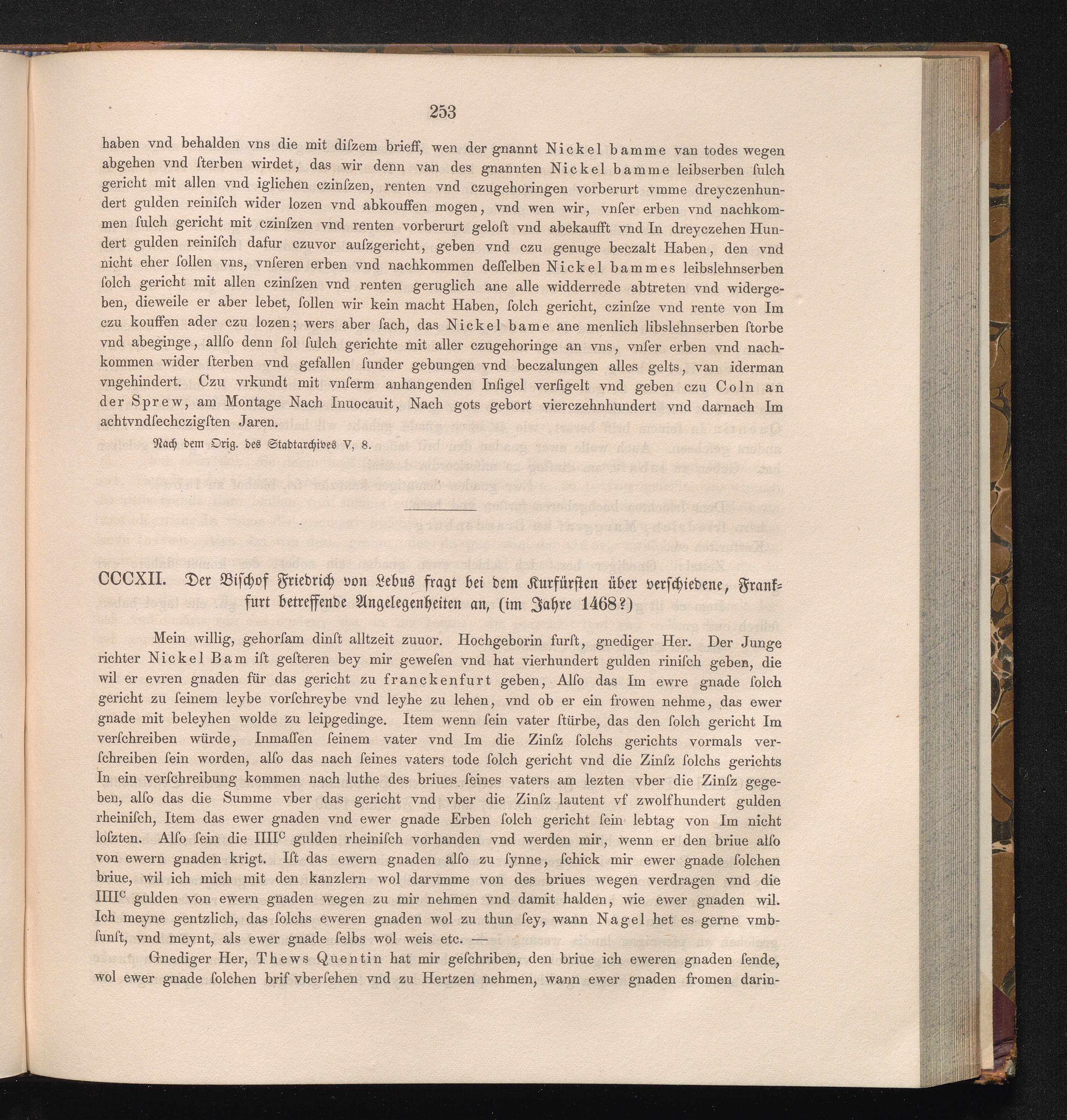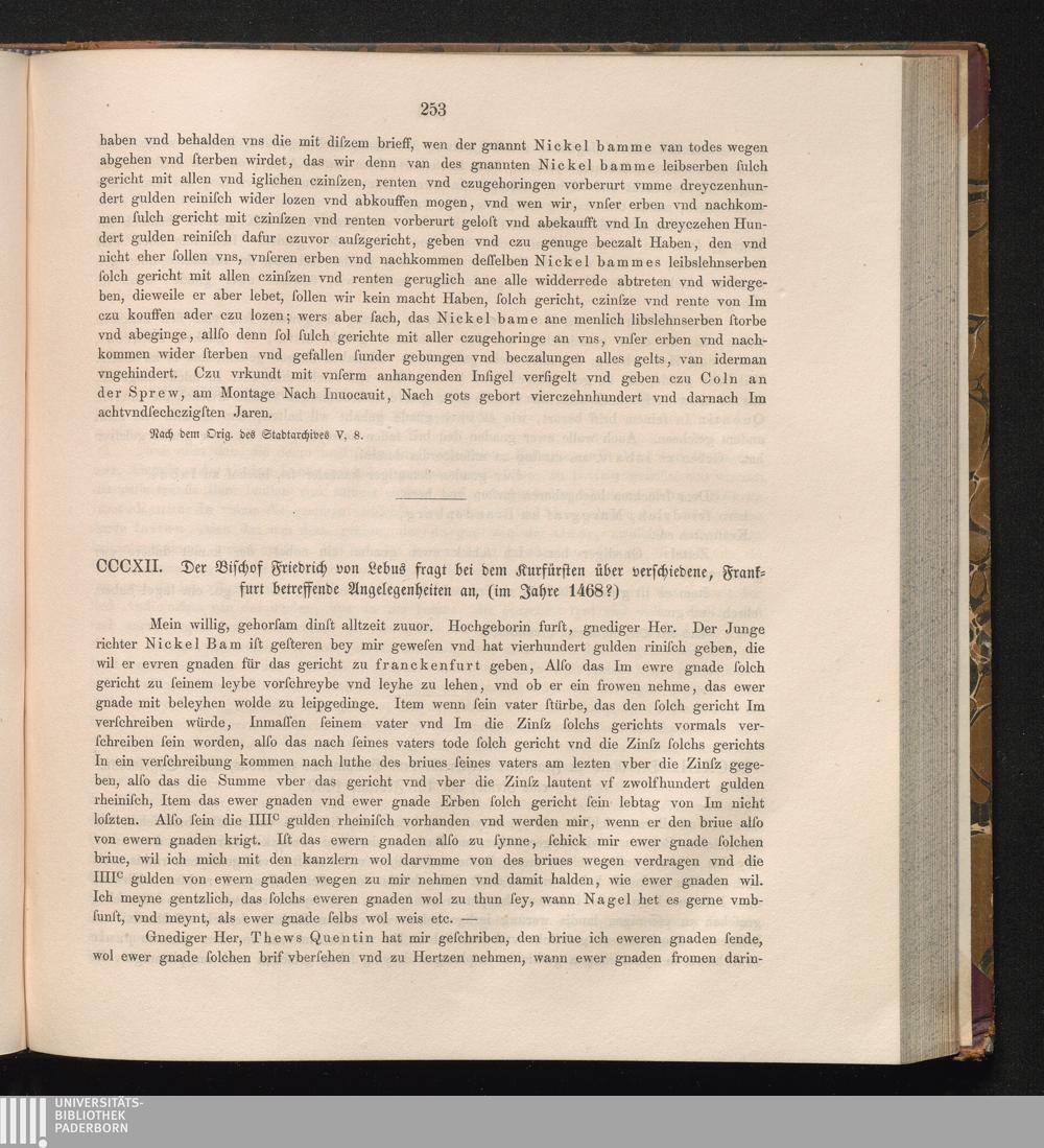 CCCXII. Der Bischof Friedrich von Lebus fragt bei dem Kurfürsten über verschiedene,[...]