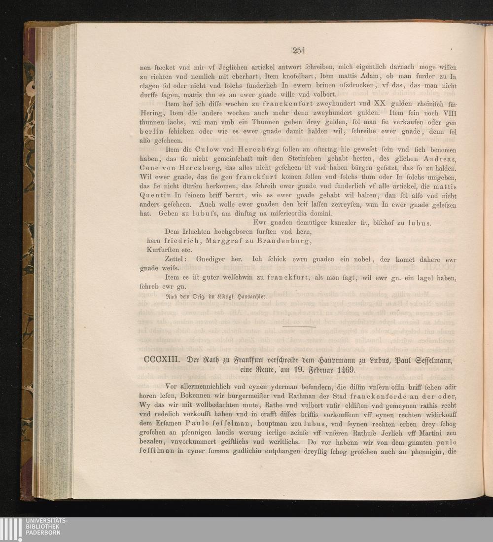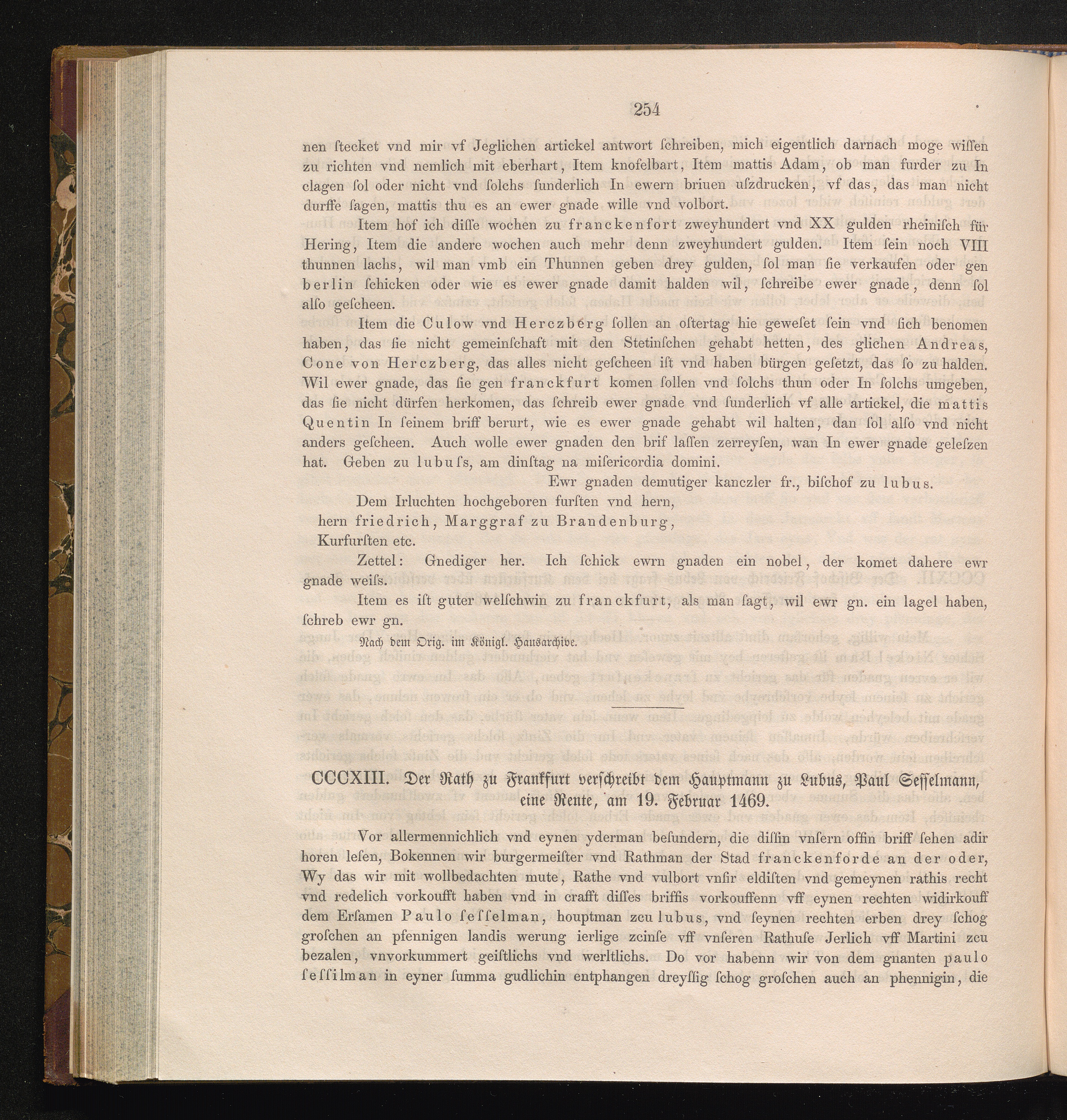 CCCXIII. Der Rath zu Frankfurt verschreibt dem Hauptmann zu Lebus, Paul Sesselmann,[...]