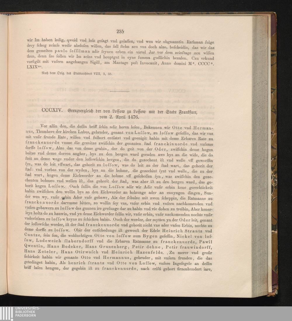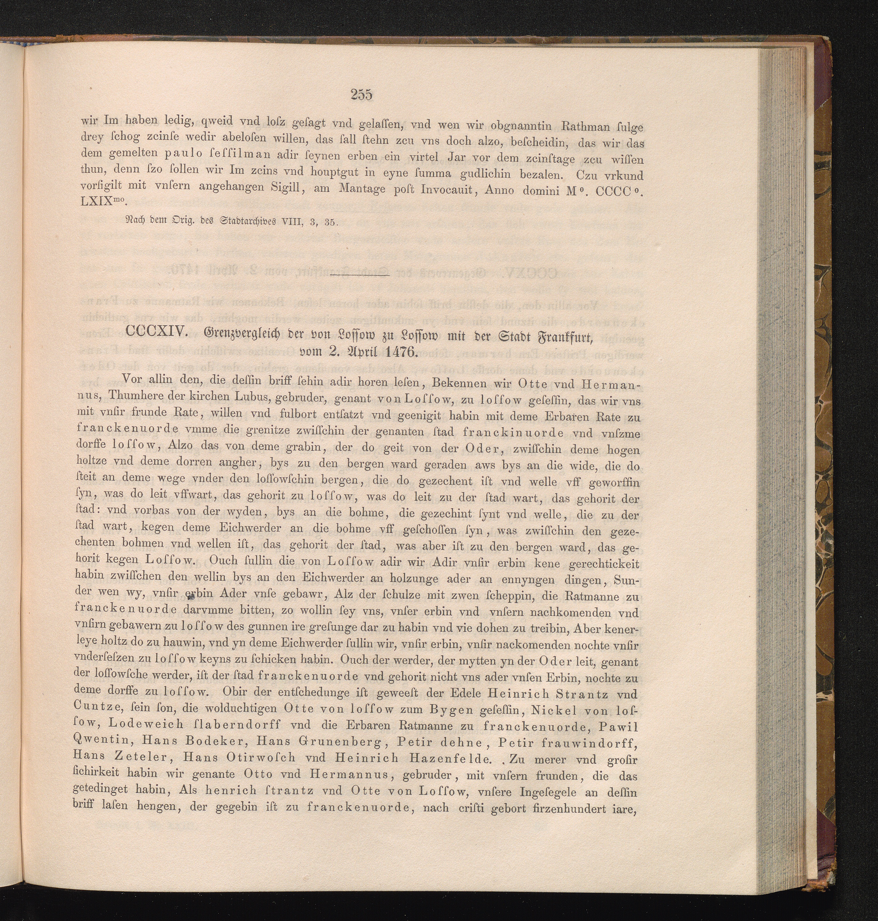 CCCXIV. Grenzvergleich der von Lossow mit der Stadt Frankfurt, vom 2. April 1476[...]
