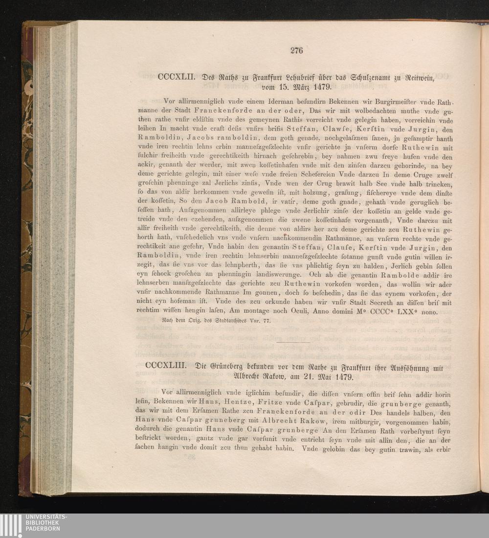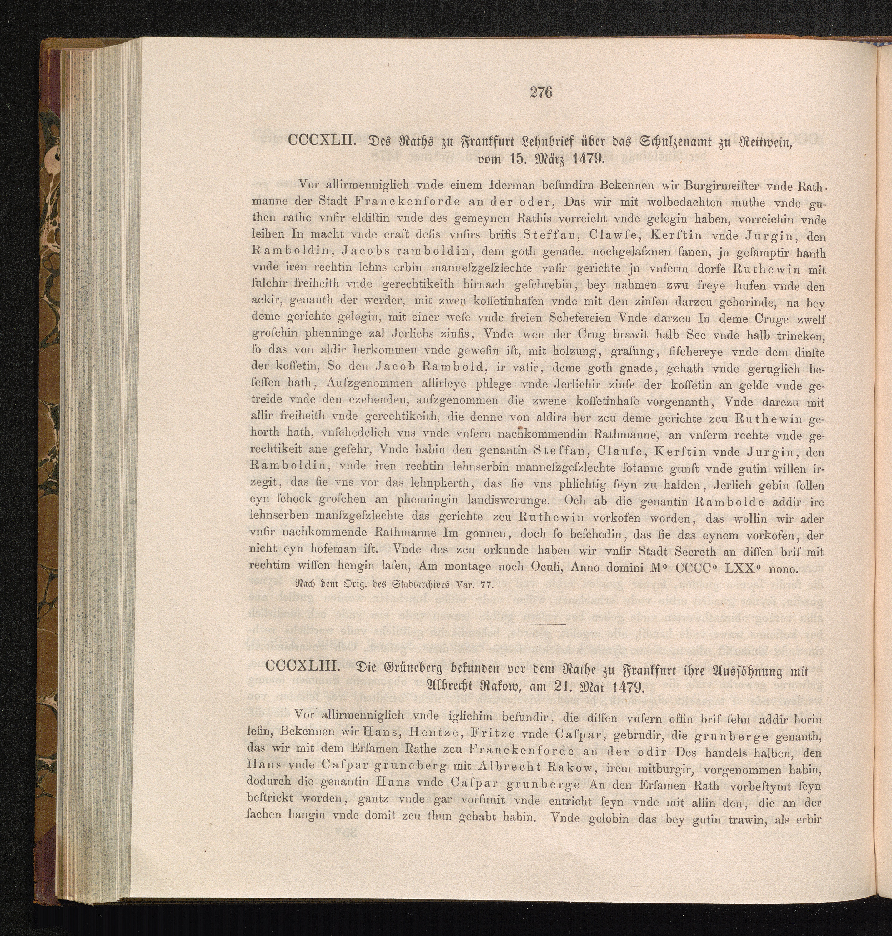 CCCXLIII. Die Grüneberg bekunden vor dem Rathe zu Frankfurt ihre Aussöhnung mit Albrecht[...]