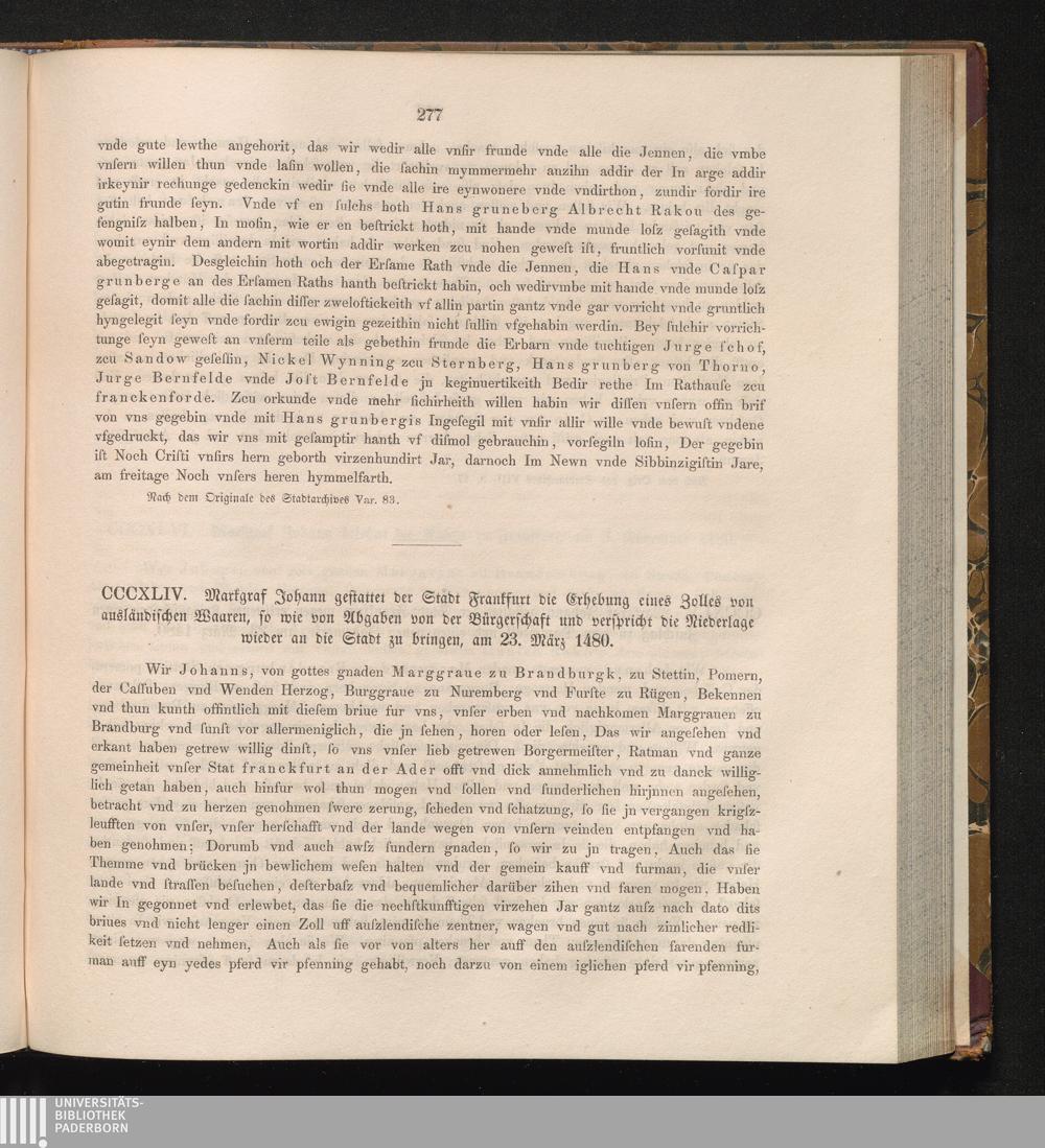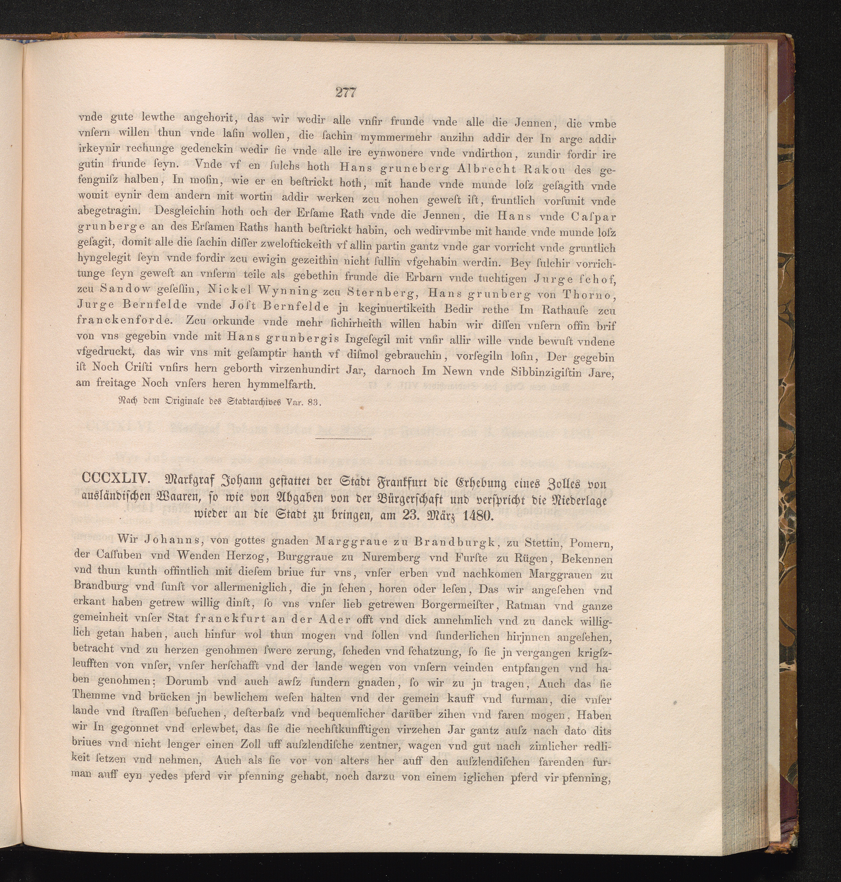 CCCXLIV. Markgraf Johann gestattet der Stadt Frankfurt die Erhebung eines Zolles[...]