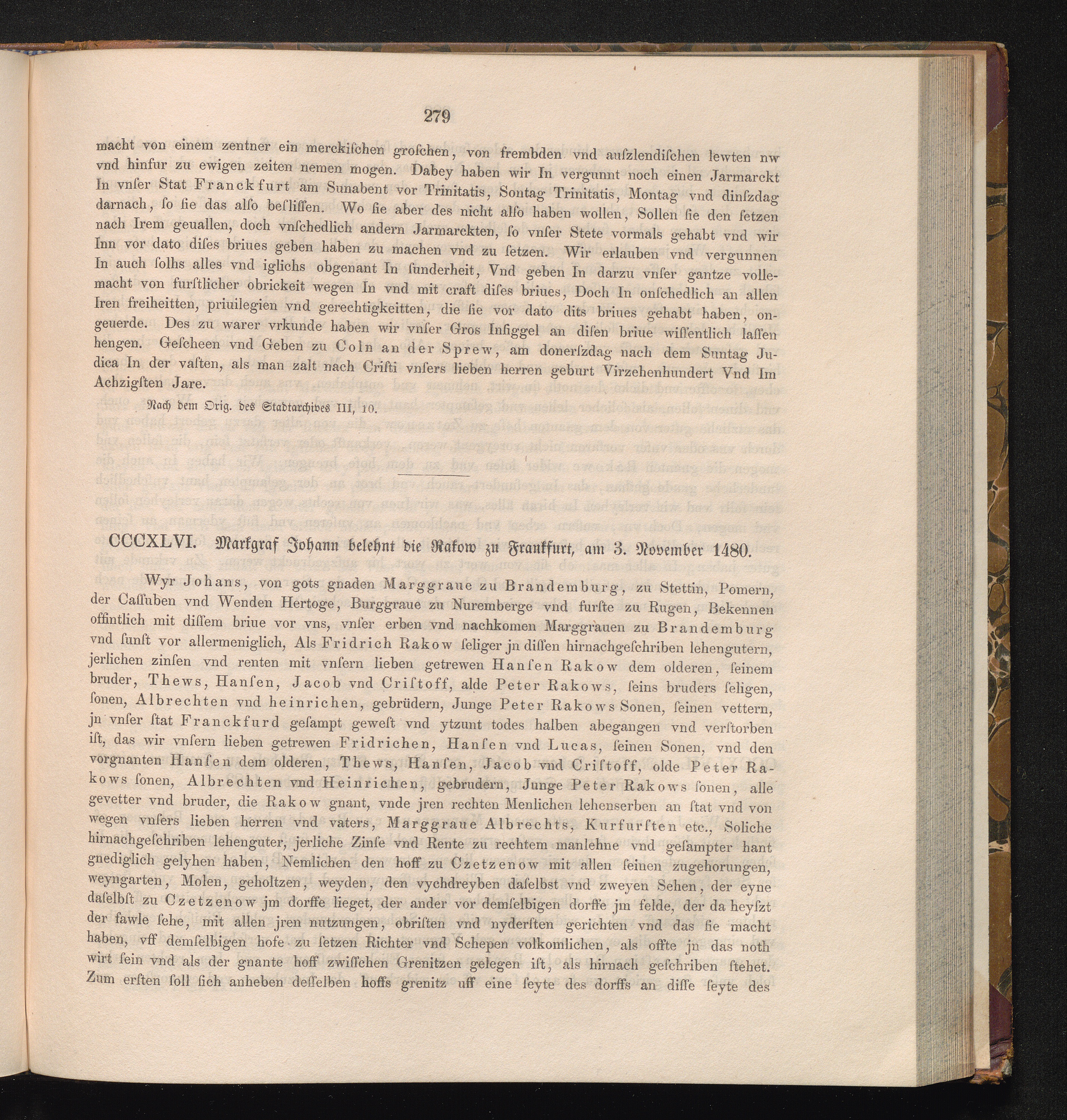 CCCXLVI. Markgraf Johann belehnt die Rakow zu Frankfurt, am 3. November 1480.