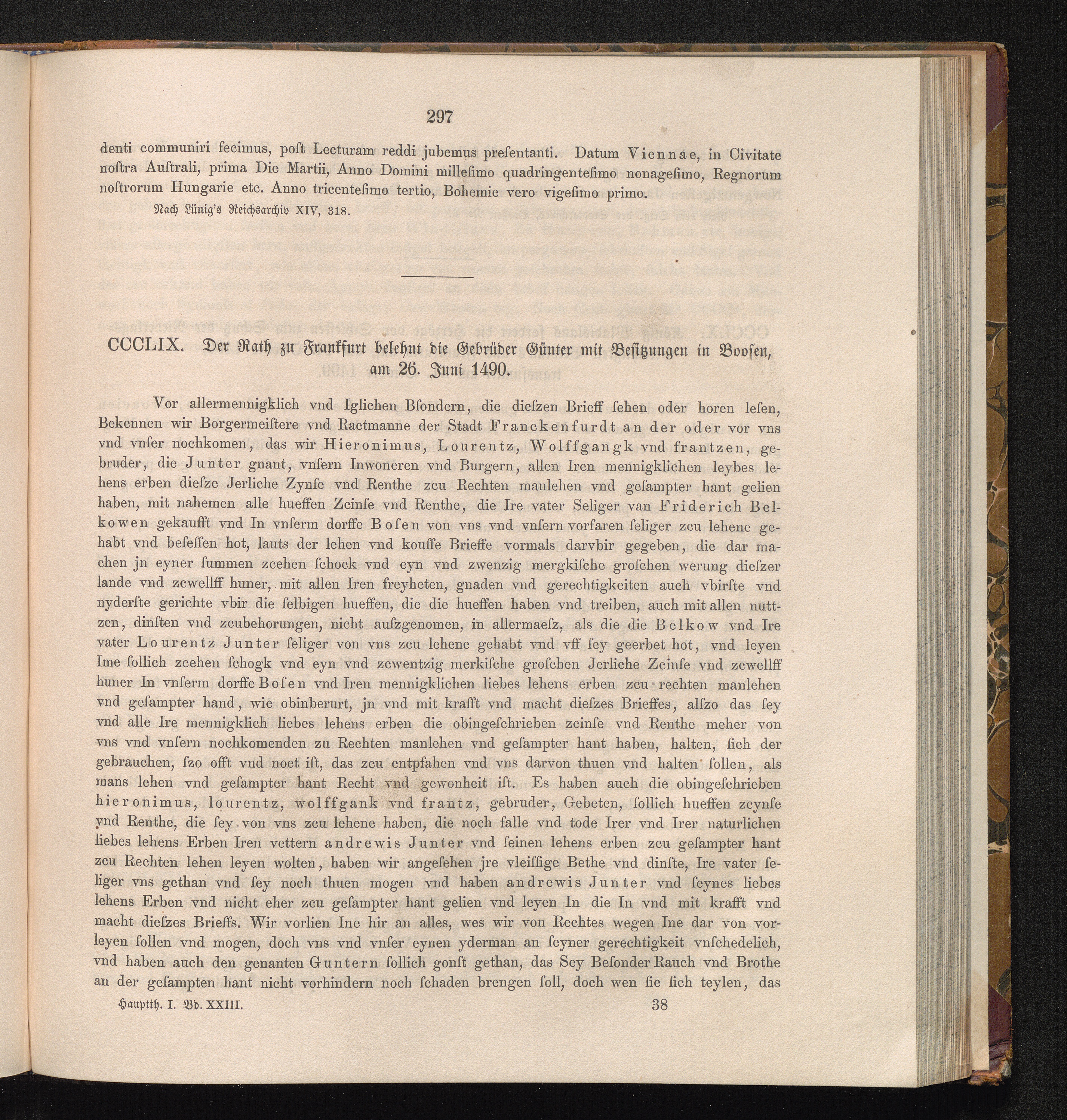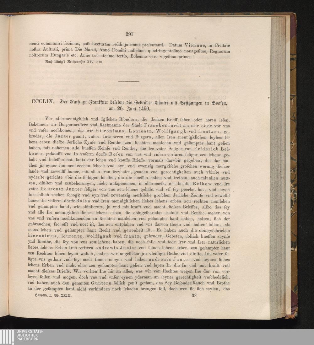 CCCLIX. Der Rath zu Frankfurt belehnt die Gebrüder Günter mit Besitzungen in Boosen,[...]