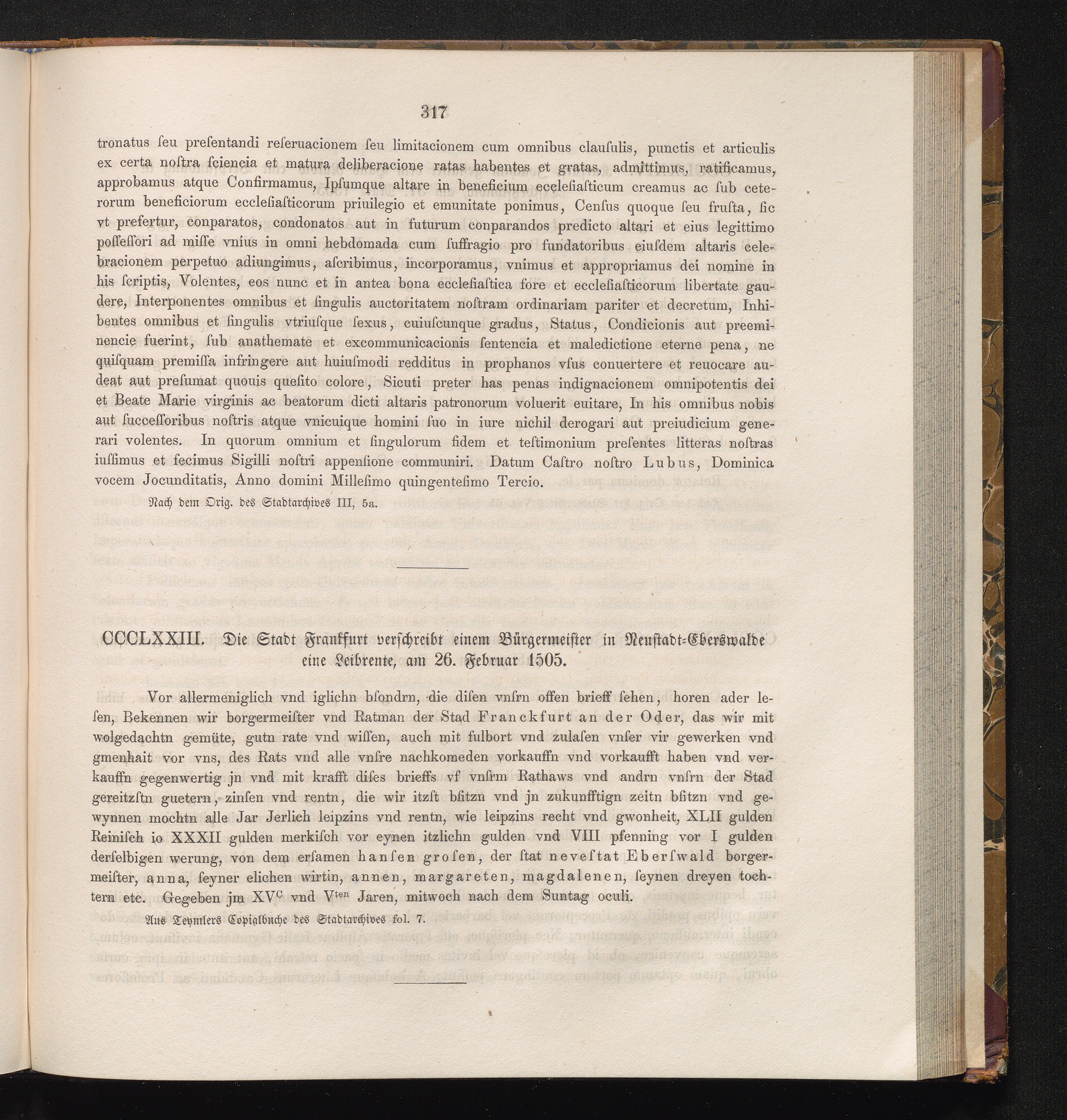 CCCLXXIII. Die Stadt Frankfurt verschreibt einem Bürgermeister in Neustadt-Eberswalde[...]