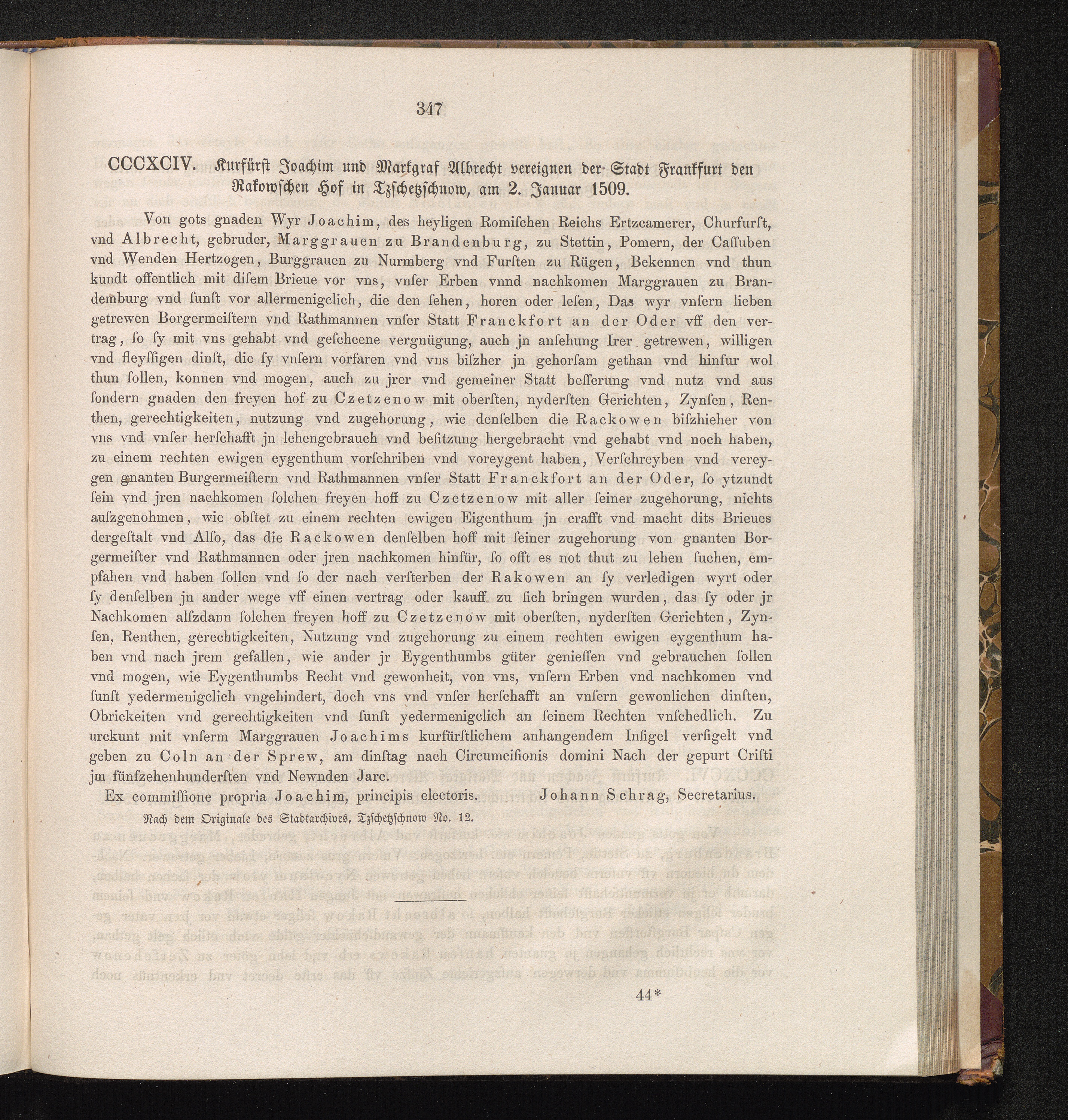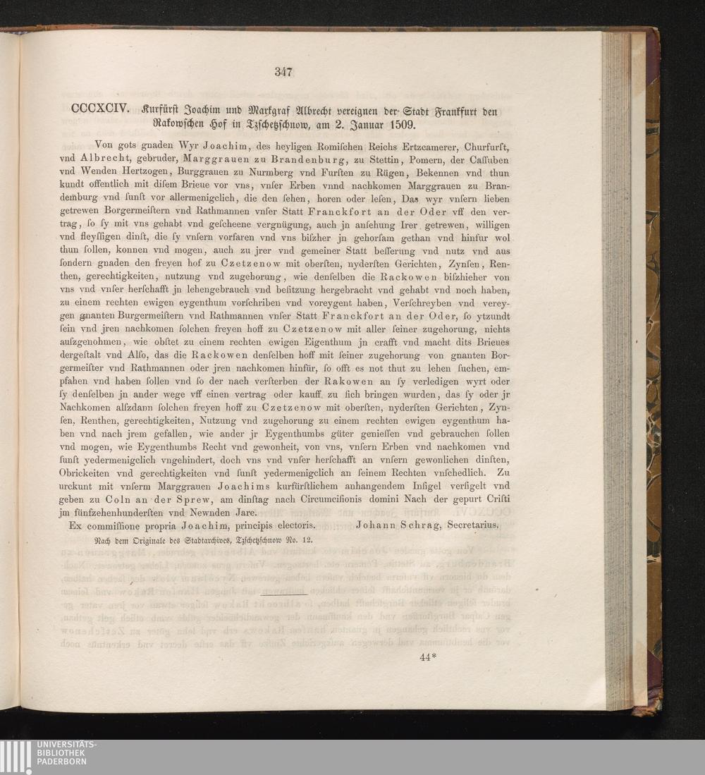 CCCXCIV. Kurfürst Joachim und Markgraf Albrecht vereignen der Stadt Frankfurt den[...]