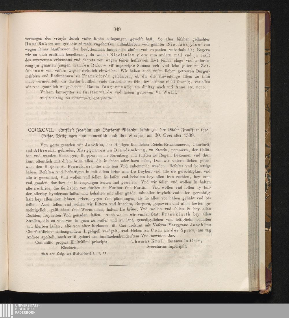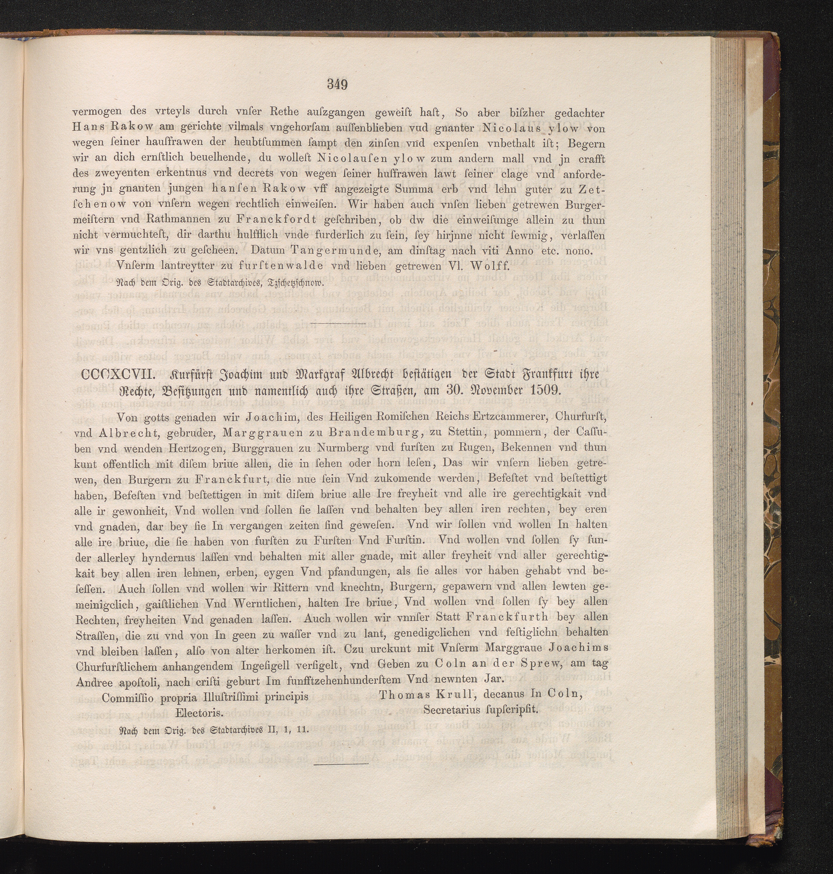 CCCXCVII. Kurfürst Joachim und Markgraf Albrecht bestätigen der Stadt Frankfurt ihre[...]