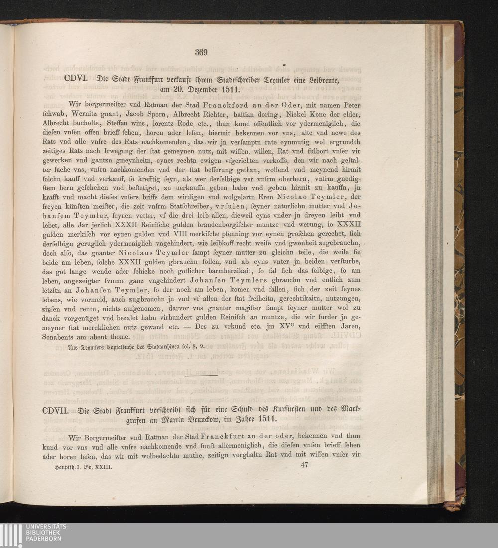 CDVII. Die Stadt Frankfurt verschreibt sich für eine Schuld des Kufürsten und des[...]