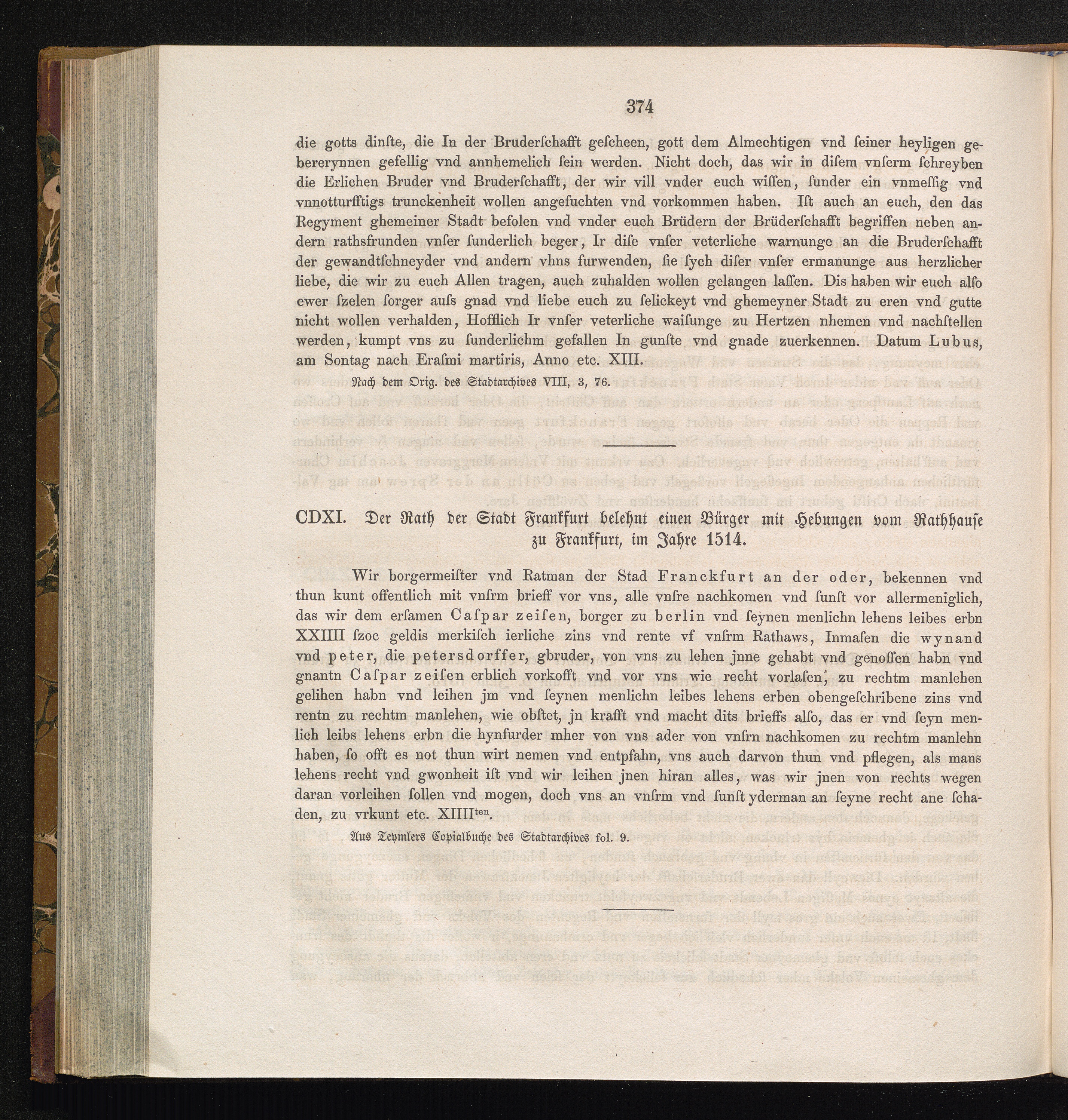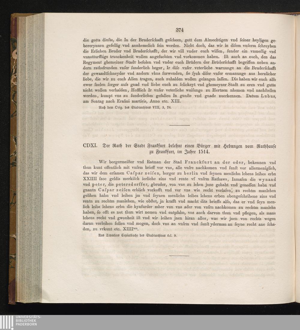 CDXI. Der Rath der Stadt Frankfurt belehnt einen Bürger mit Hebungen vom Rathhause[...]