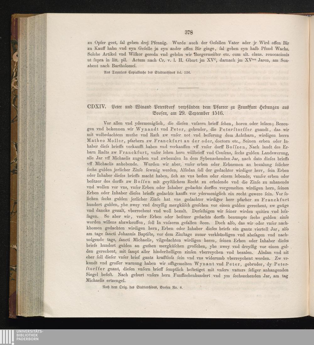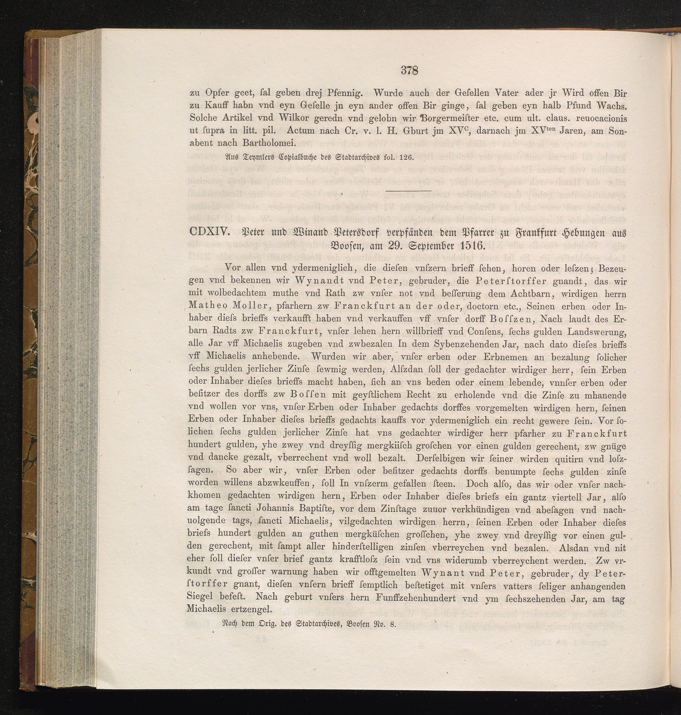 CDXIV. Peter und Winand Petersdorf verpfänden dem Pfarrer zu Frankfurt Hebungen aus[...]