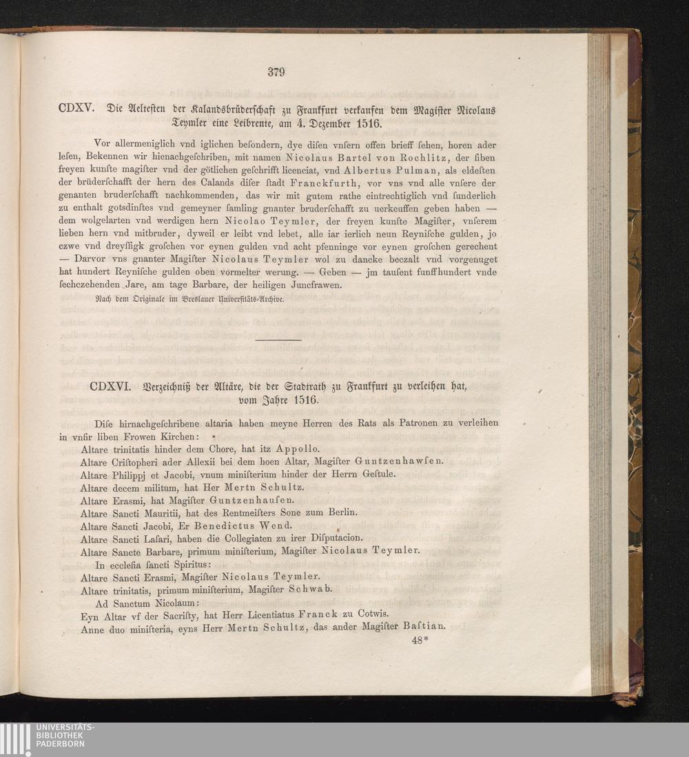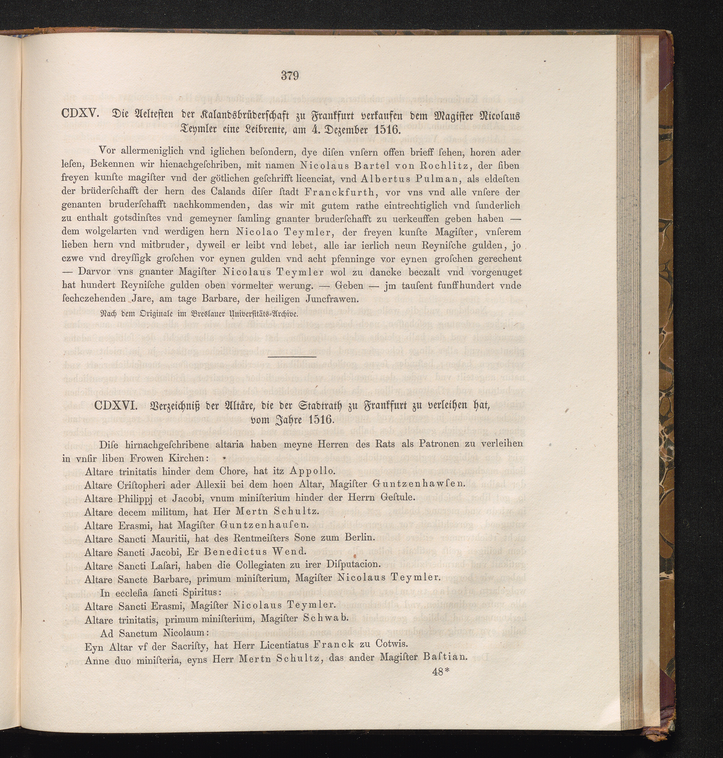 CDXVI. Verzeichniß der Altäre, die der Stadtrath zu Frankfurt zu verleihen hat, vom[...]