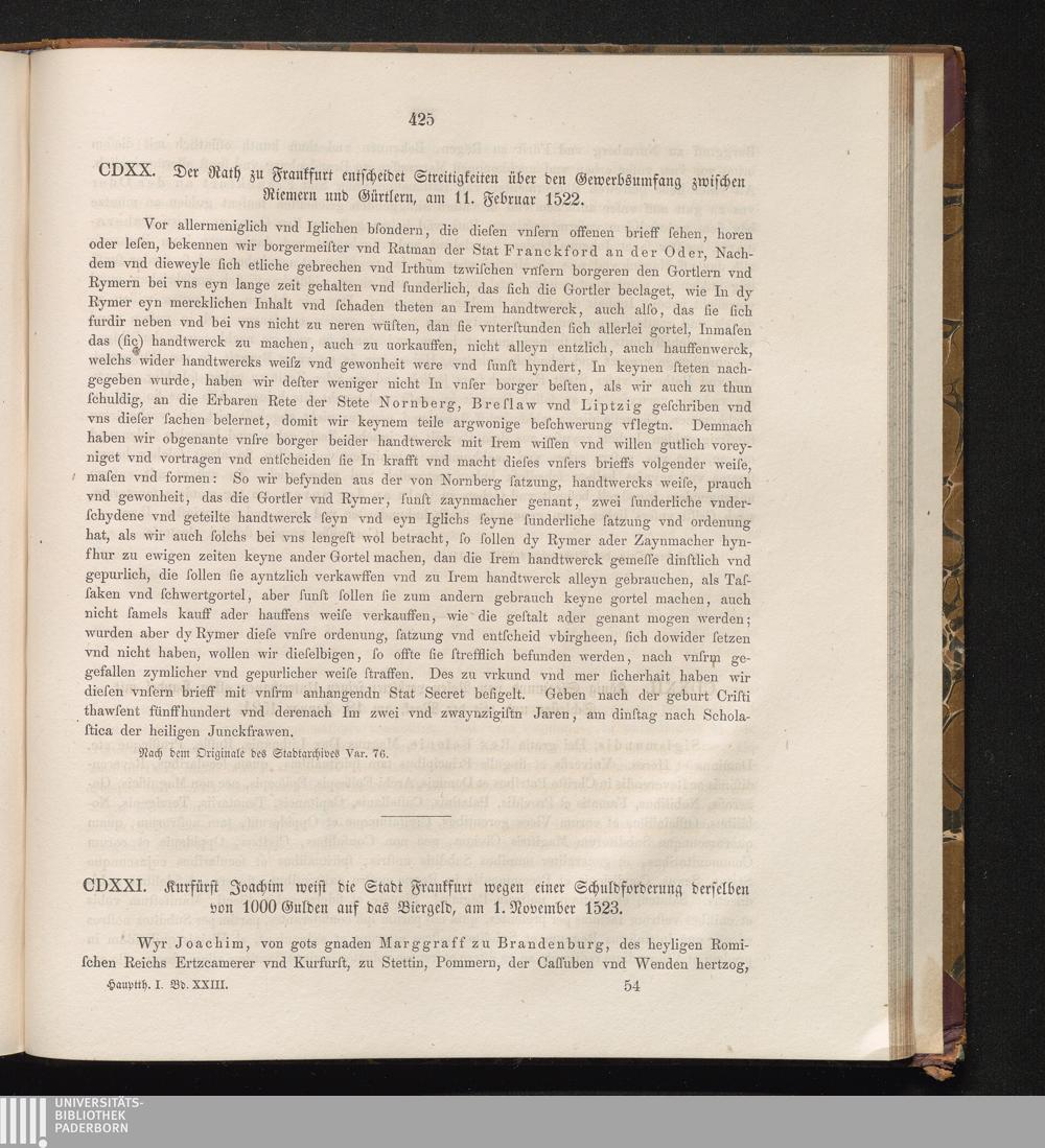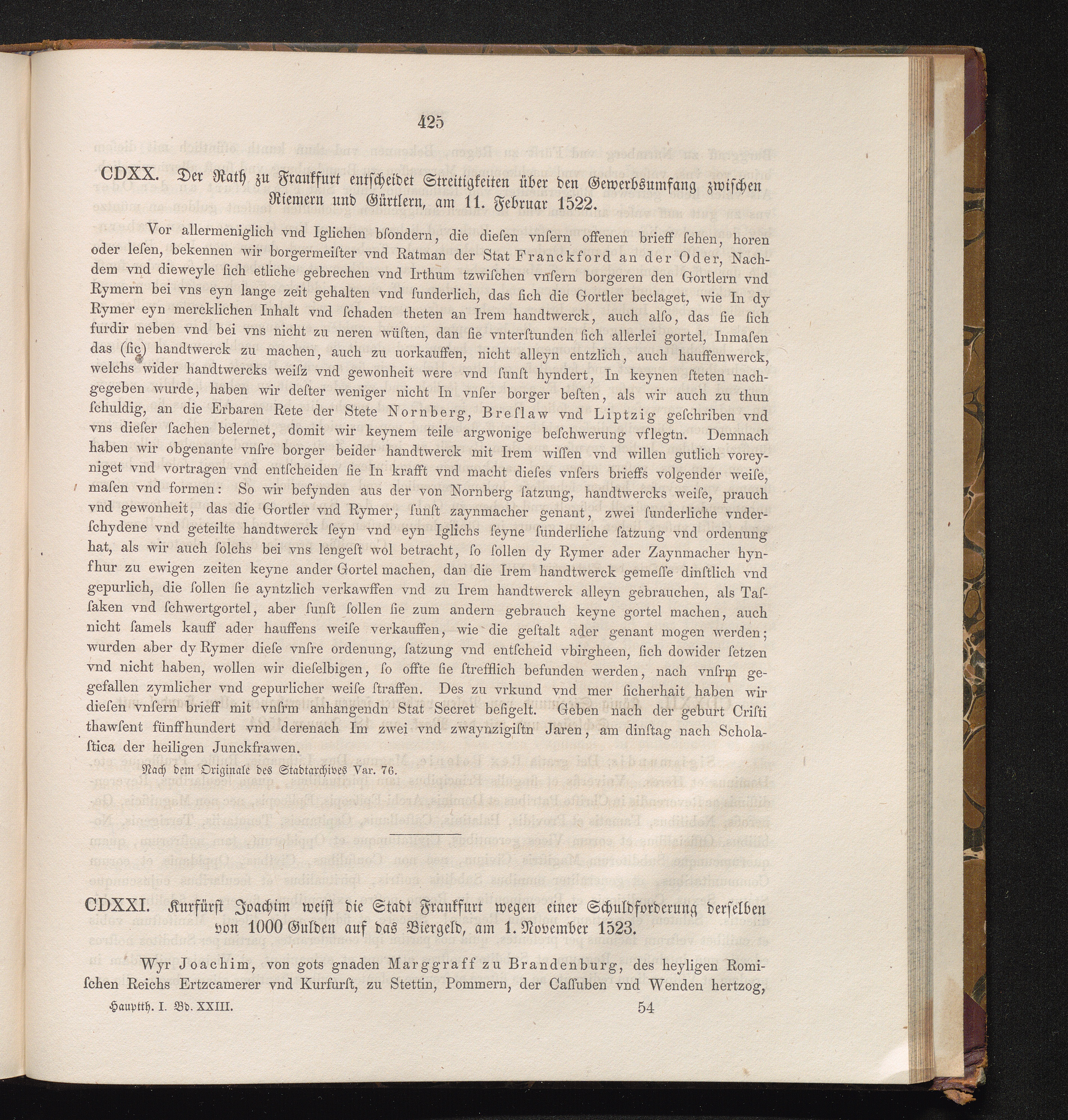 CDXXI. Kurfürst Joachim weist die Stadt Frankfurt wegen einer Schuldforderung derselben[...]