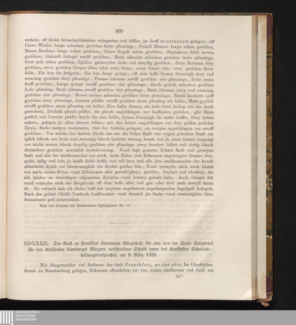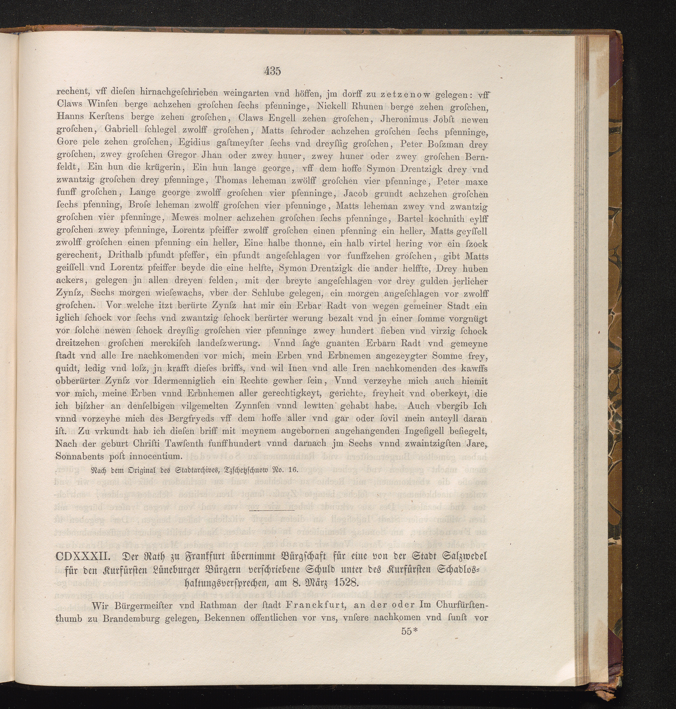 CDXXXII. Der Rath zu Frankfurt übernimmt Bürgschaft für eine von der Stadt Salzwedel[...]