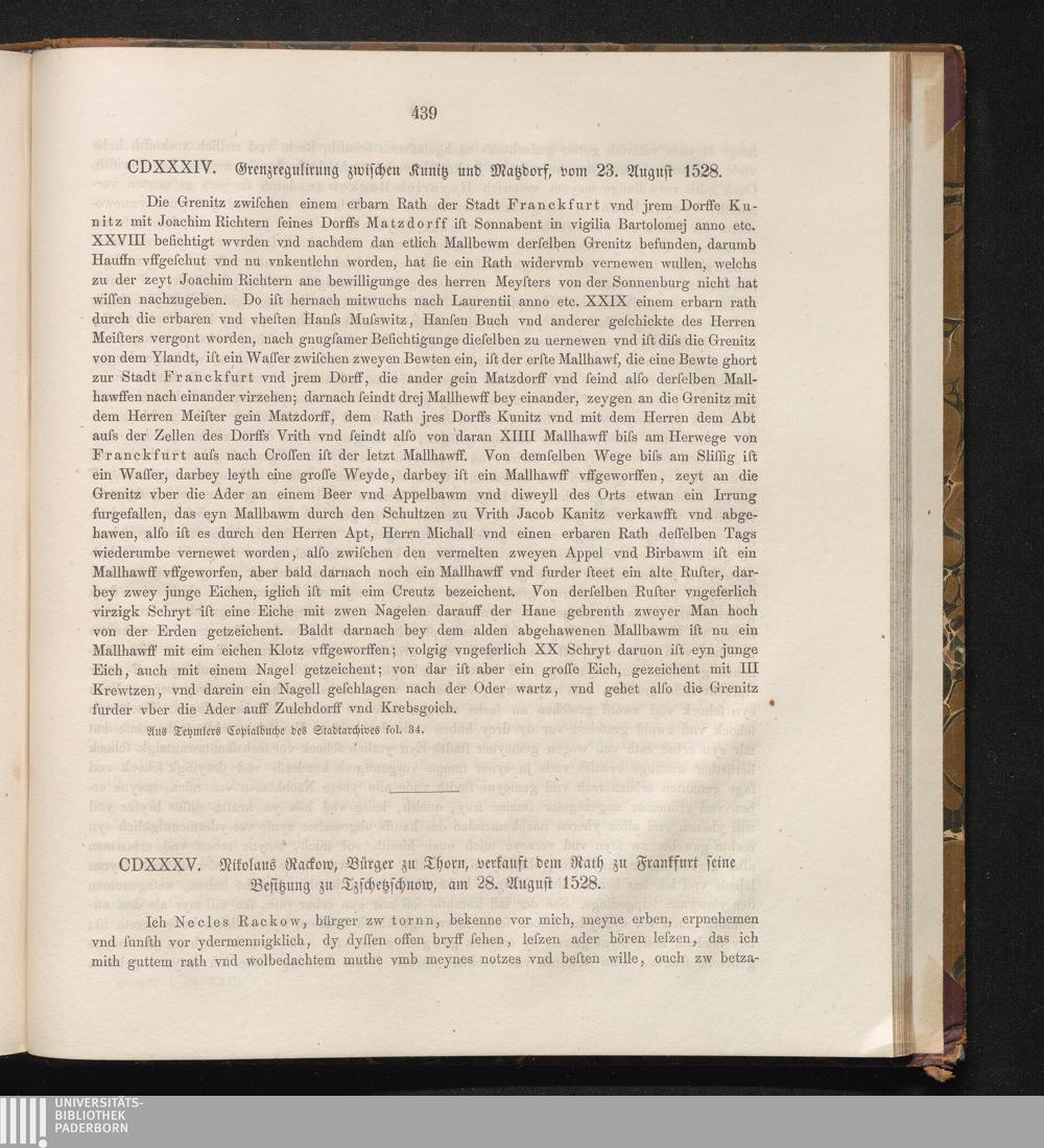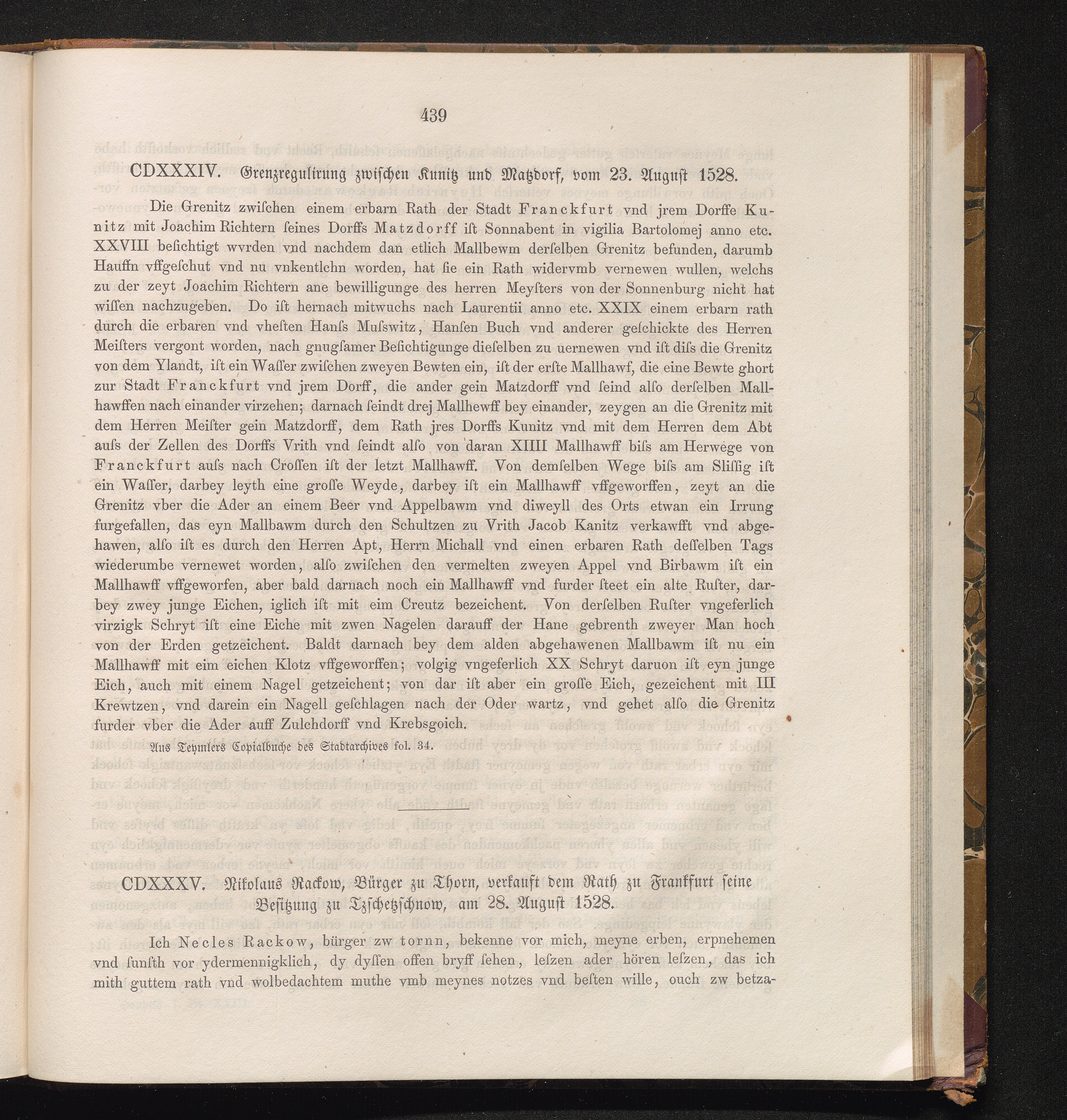 CDXXXV. Nikolaus Rackow, Bürger zu Thorn, verkauft dem Rath zu Frankfurt seine Besitzung[...]