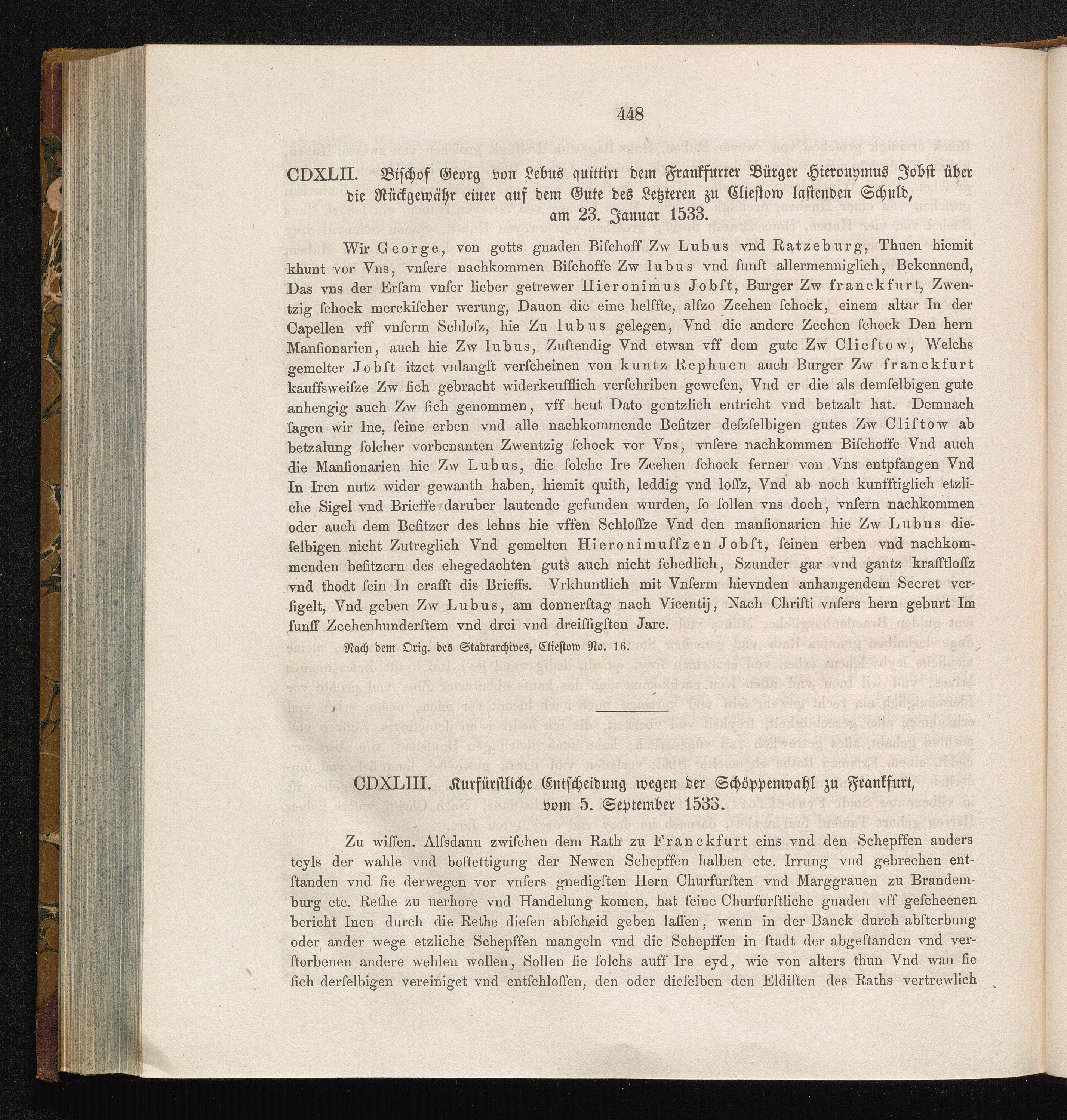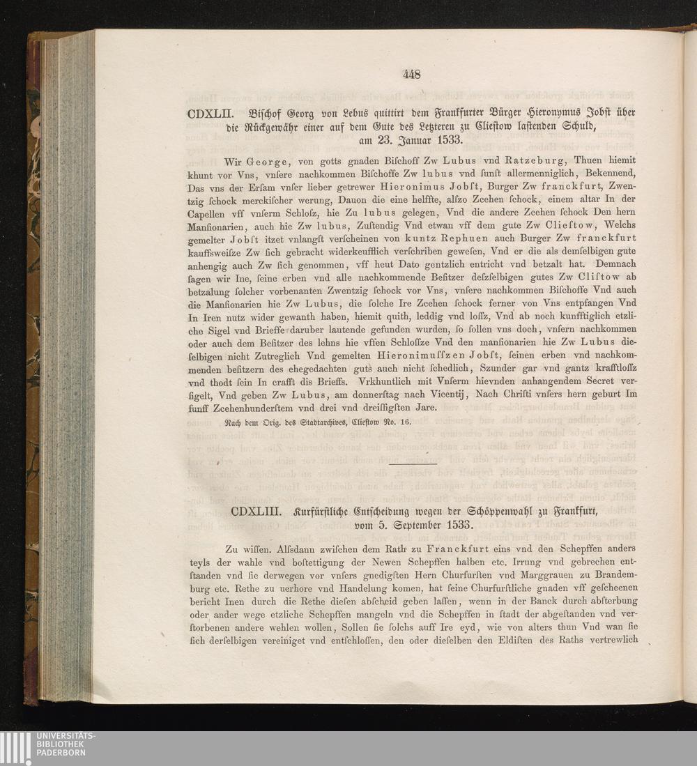 CDXLIII. Kurfürstliche Entscheidung wegen der Schöppenwahl zu Frankfurt, vom 5. September[...]