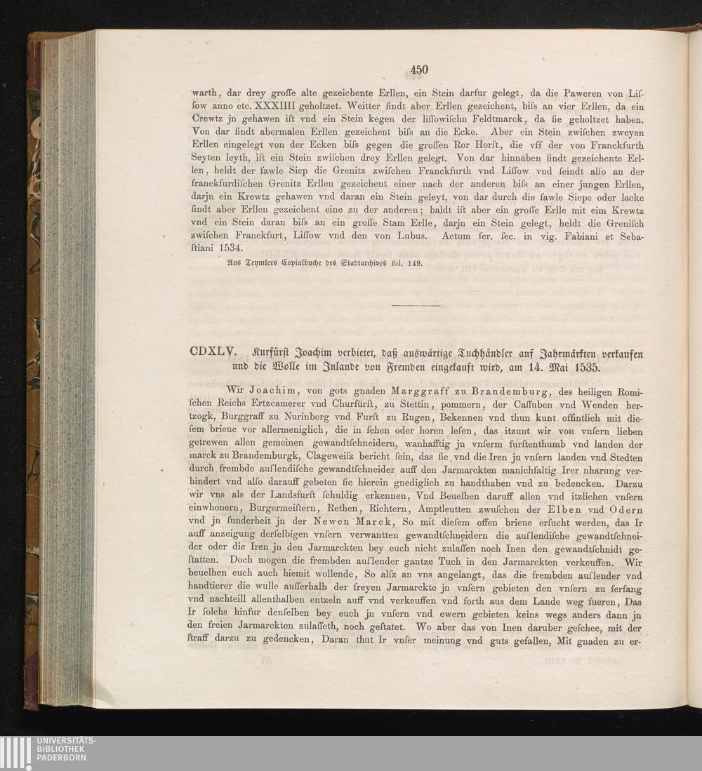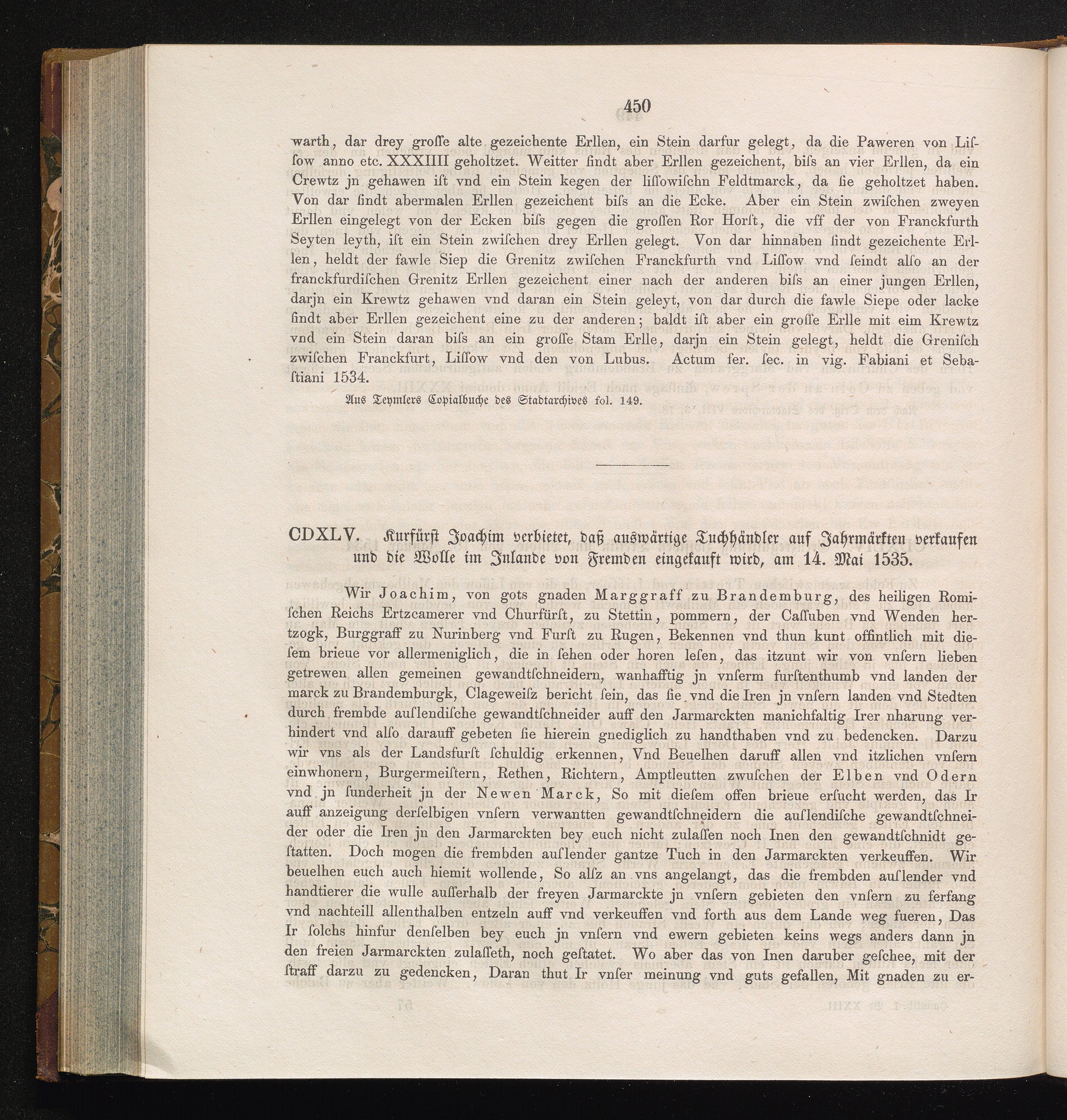 CDXLV. Kurfürst Joachim verbietet, daß auswärtige Tuchhändler auf Jahrmärkten verkaufen[...]