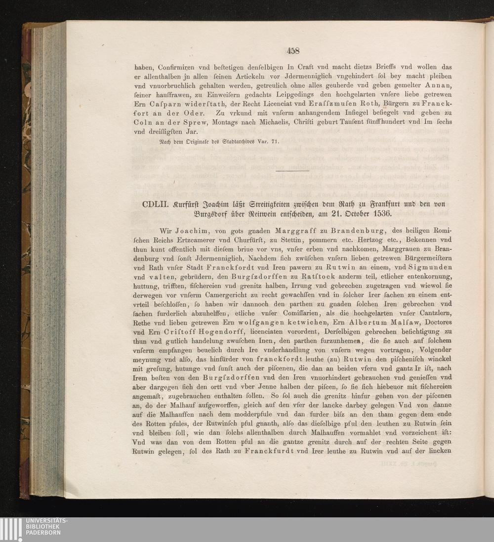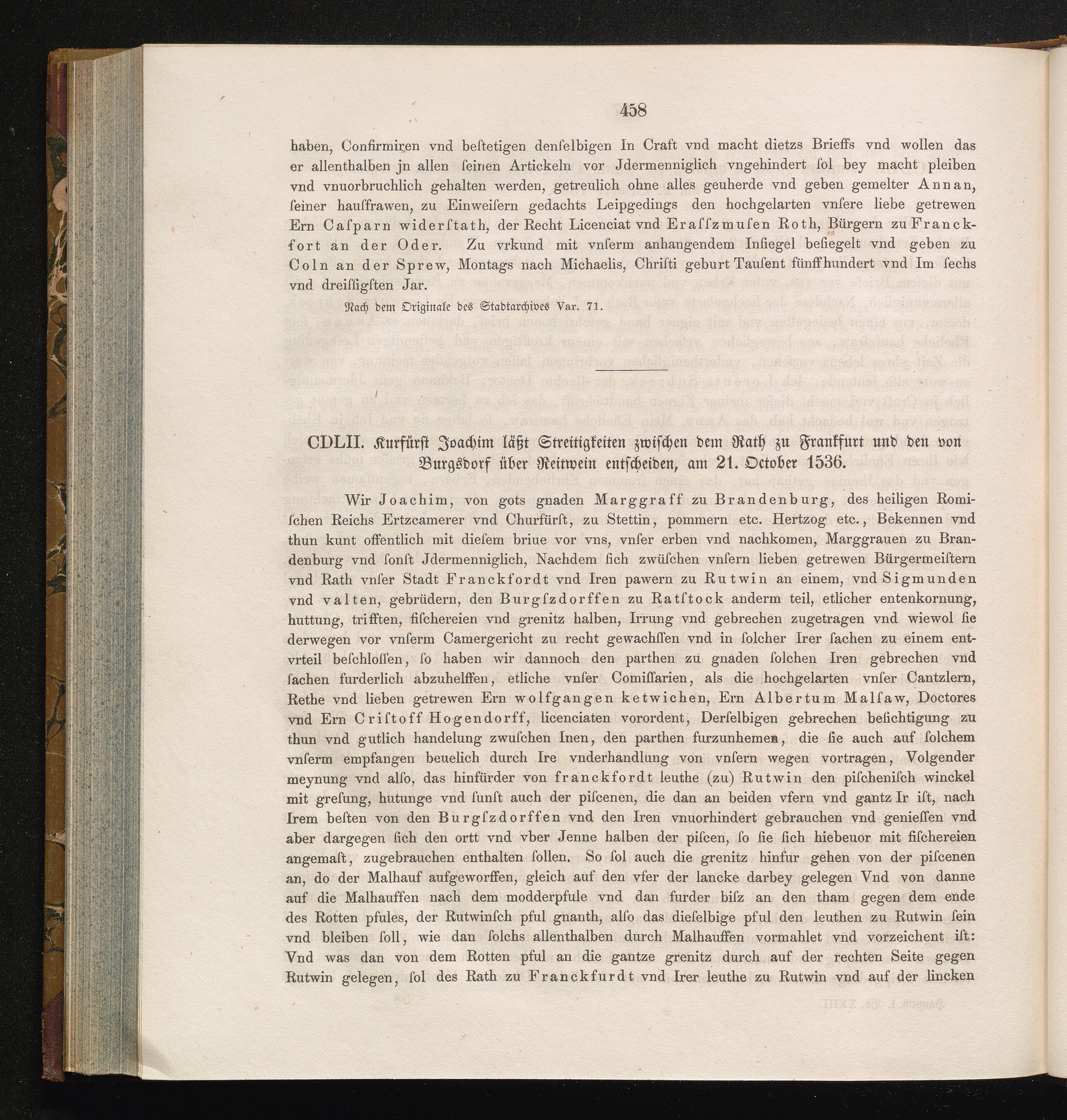CDLII. Kurfürst Joachim läßt Streitigkeiten zwischen dem Rath zu Frankfurt und den[...]