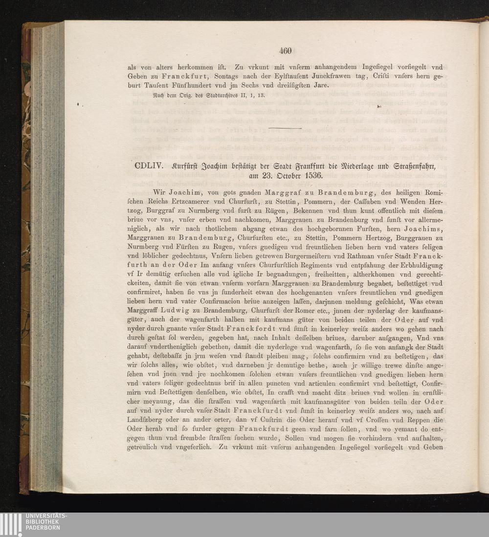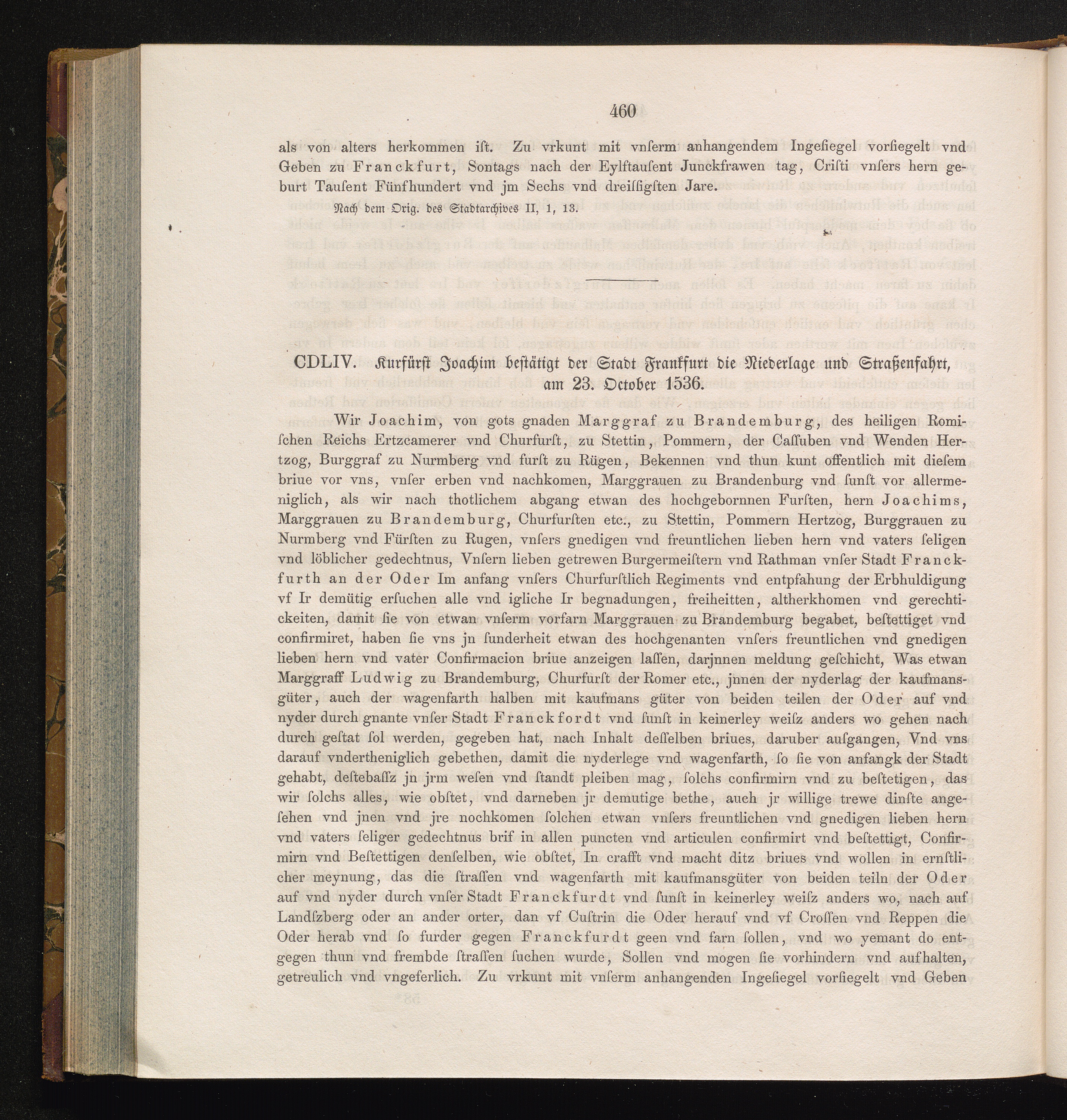 CDLIV. Kurfürst Joachim bestätigt der Stadt Frankfurt die Niederlage und Straßenfahrt,[...]