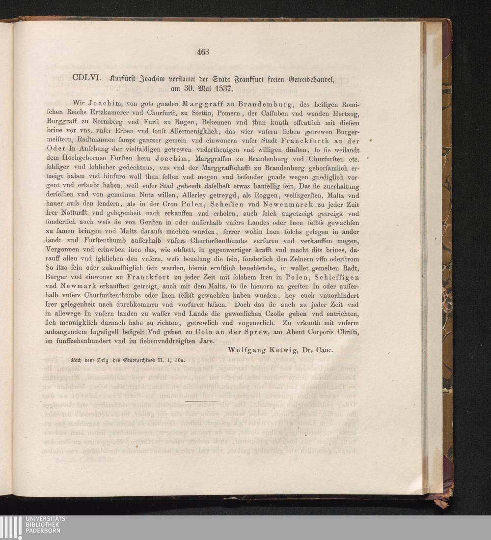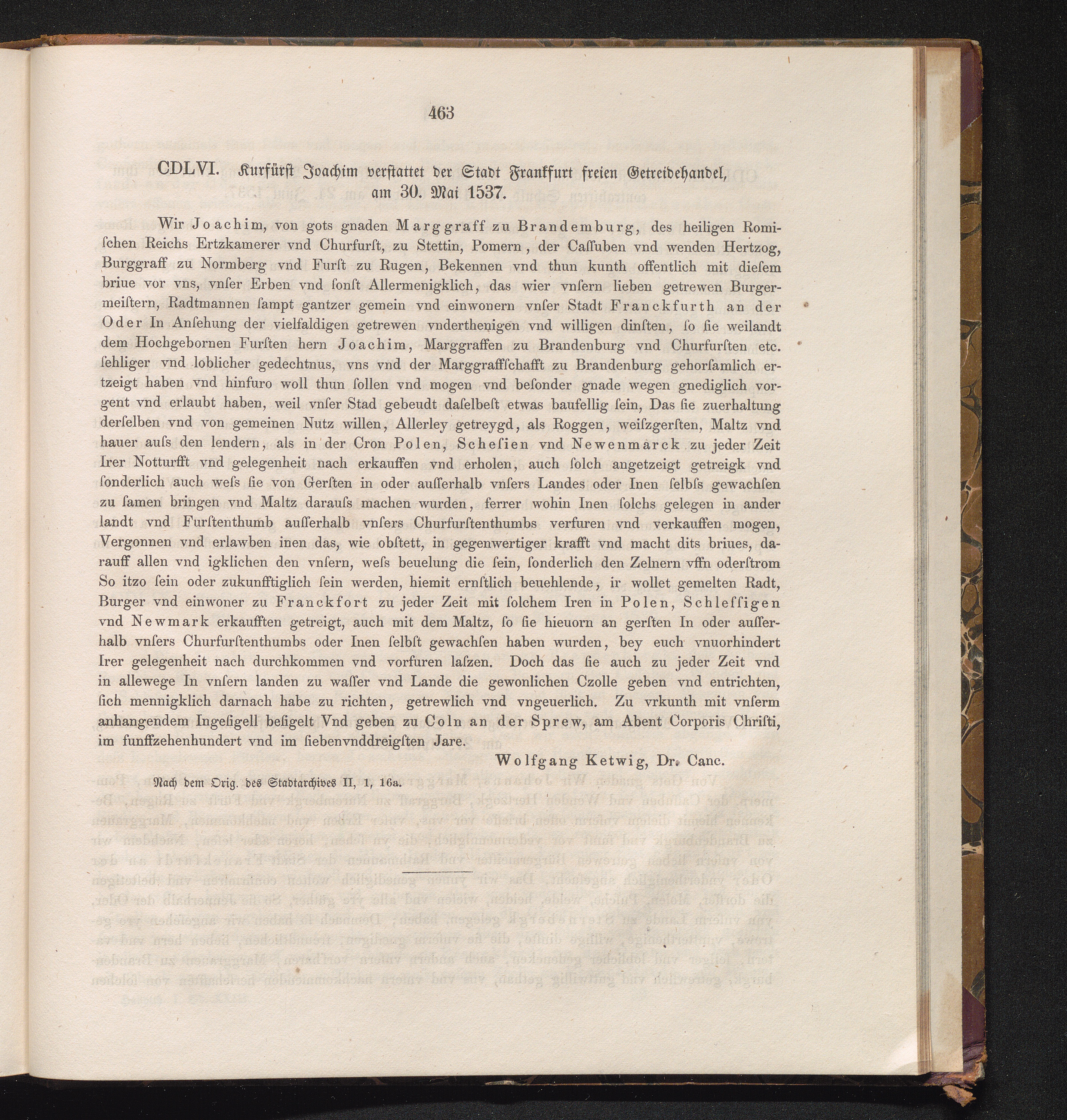 CDLVI. Kurfürst Joachim verstattet der Stadt Frankfurt freien Getreidehandel, am[...]