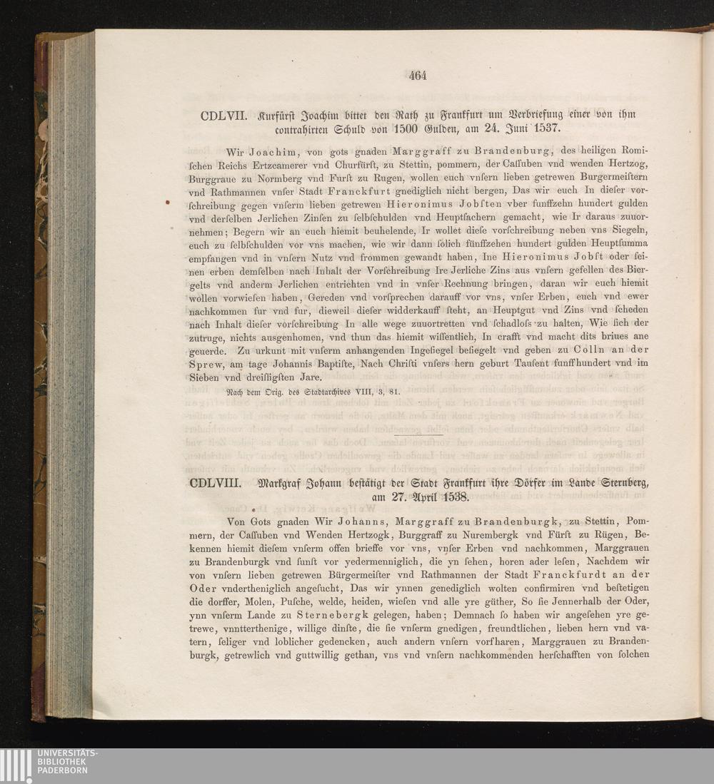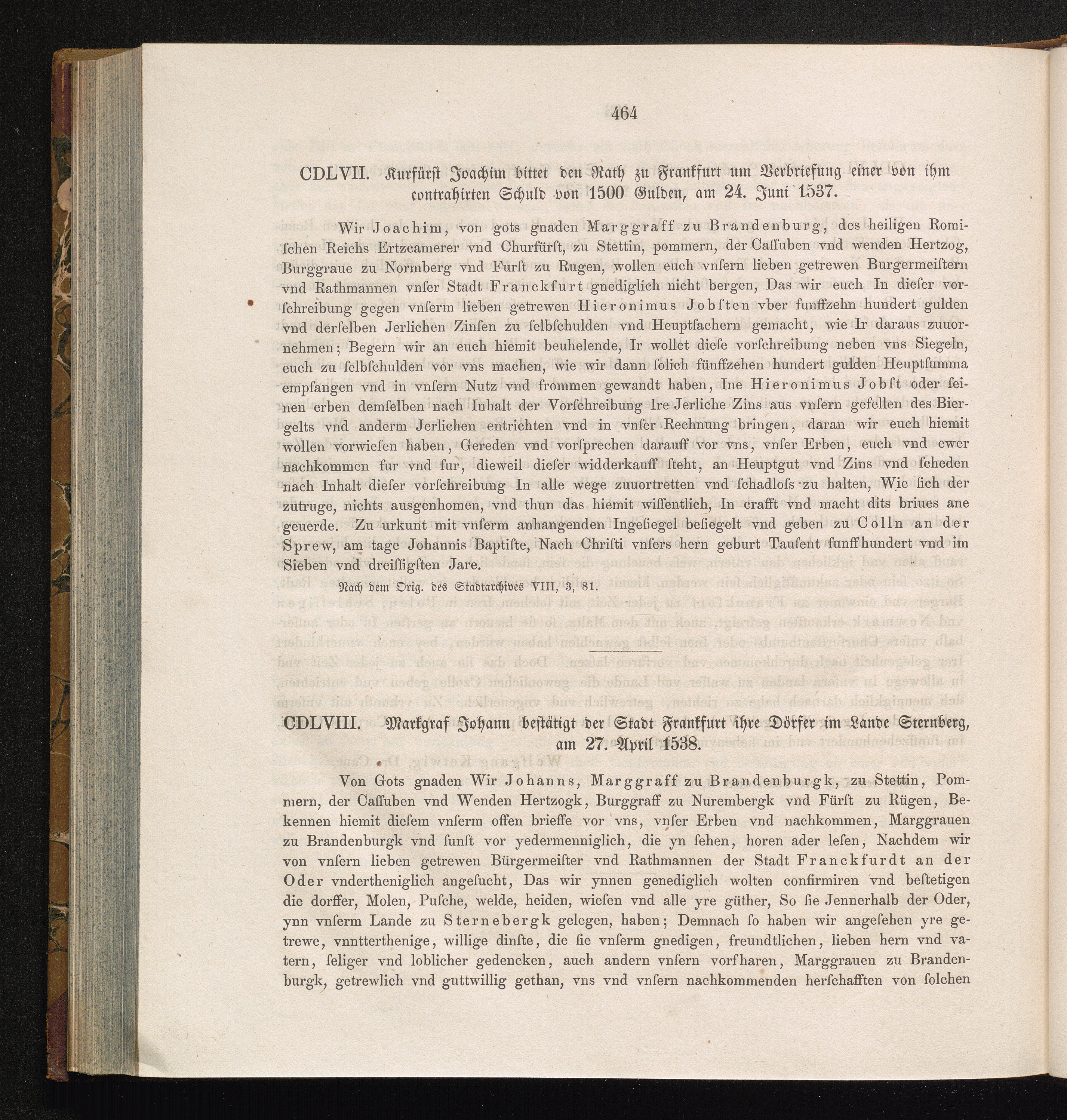 CDLVIII. Markgraf Johann bestätigt der Stadt Frankfurt ihre Dörfer im Lande Sternberg,[...]