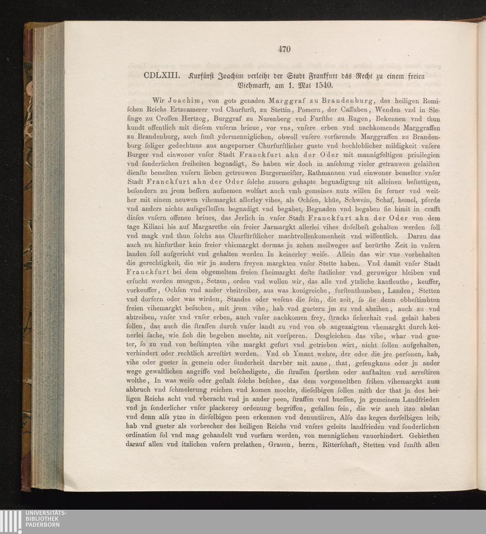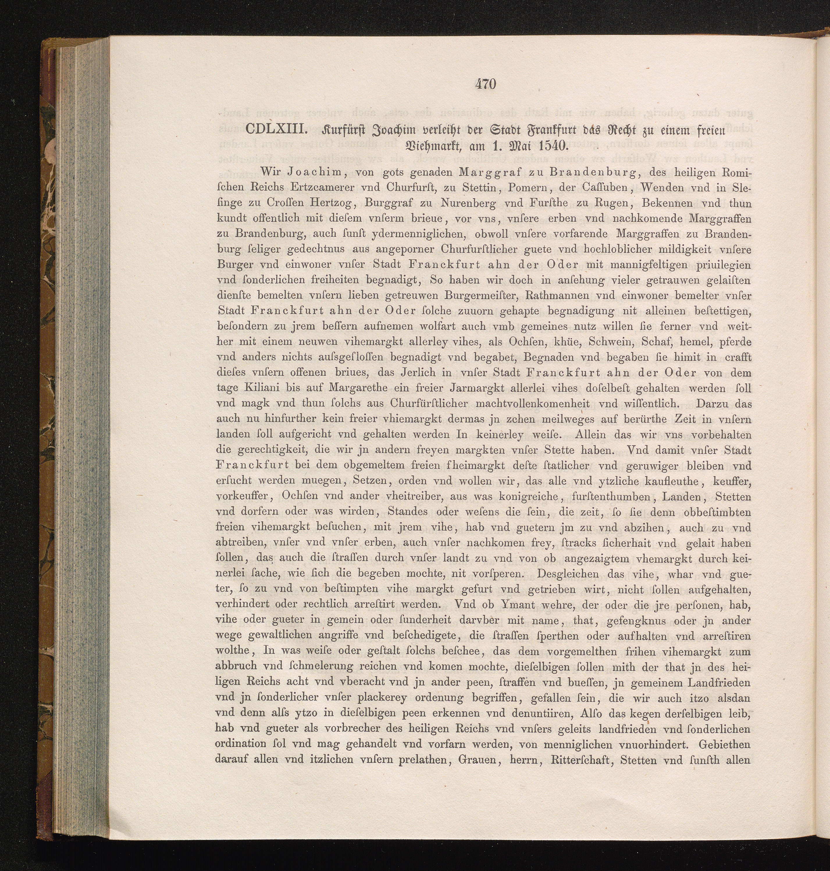 CDLXIII. Kurfürst Joachim verleiht der Stadt Frankfurt das Recht zu einem freien[...]