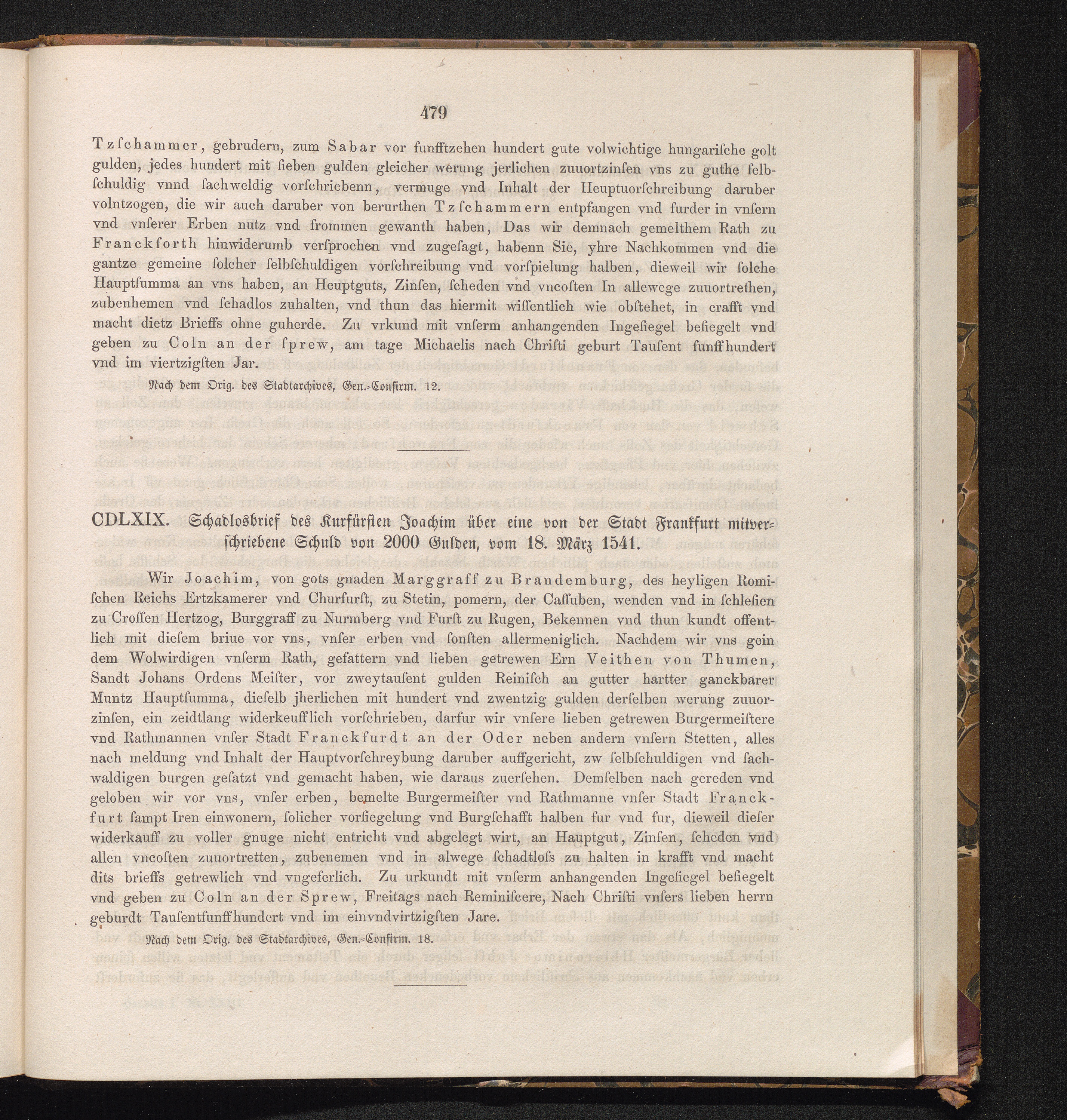 CDLXIX. Schadlosbrief des Kurfürsten Joachim über eine von der Stadt Frankfurt mitverschriebene[...]